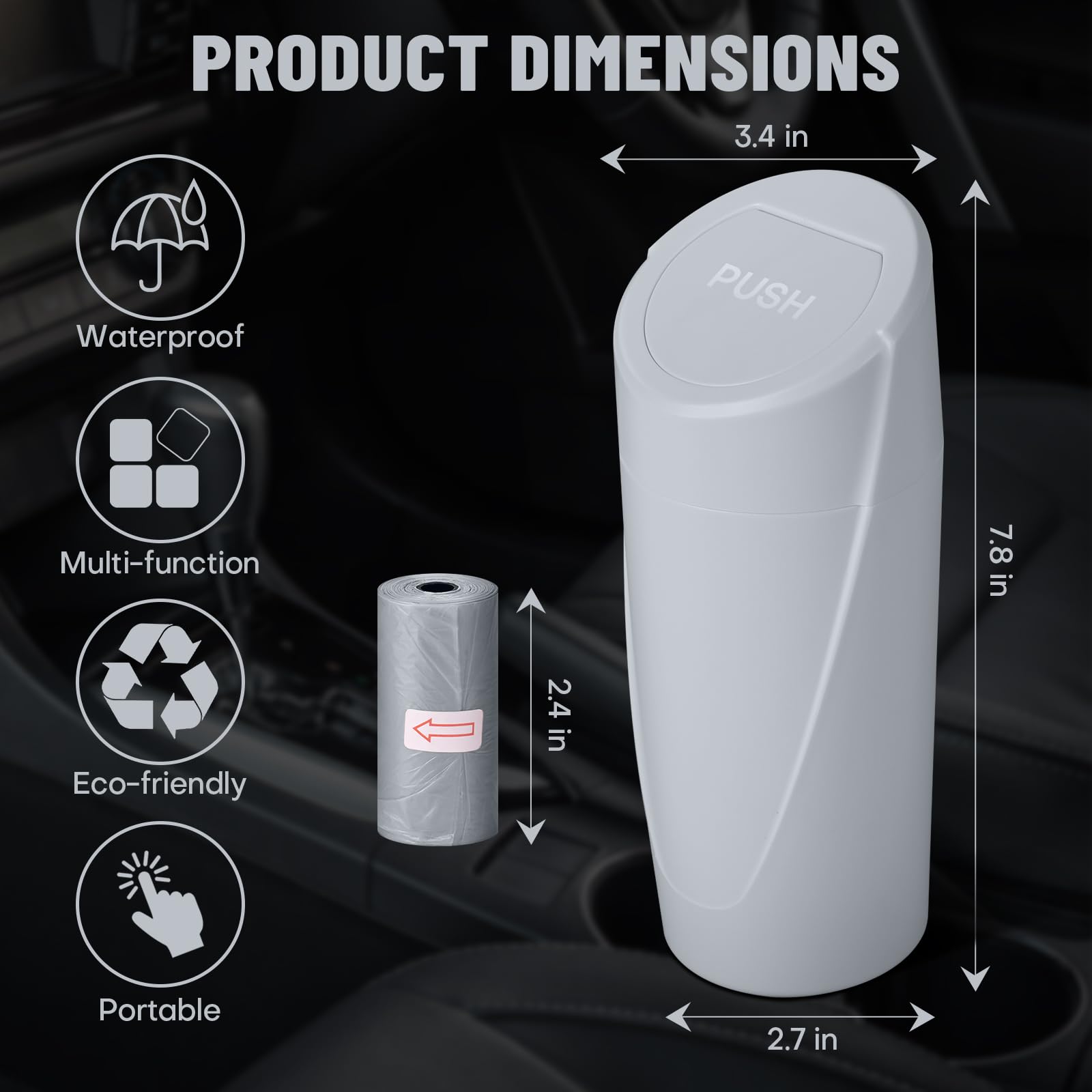 【Convenient and Practical】 The Car Garbage Can is designed with a flip lid, allowing you to easily open it with a light push to dispose of trash or items. The lid closes automatically, effectively blocking odors and keeping your car interior clean and fresh. With 40 disposable trash bags included, it's easy to keep the trash can clean and tidy at all times.