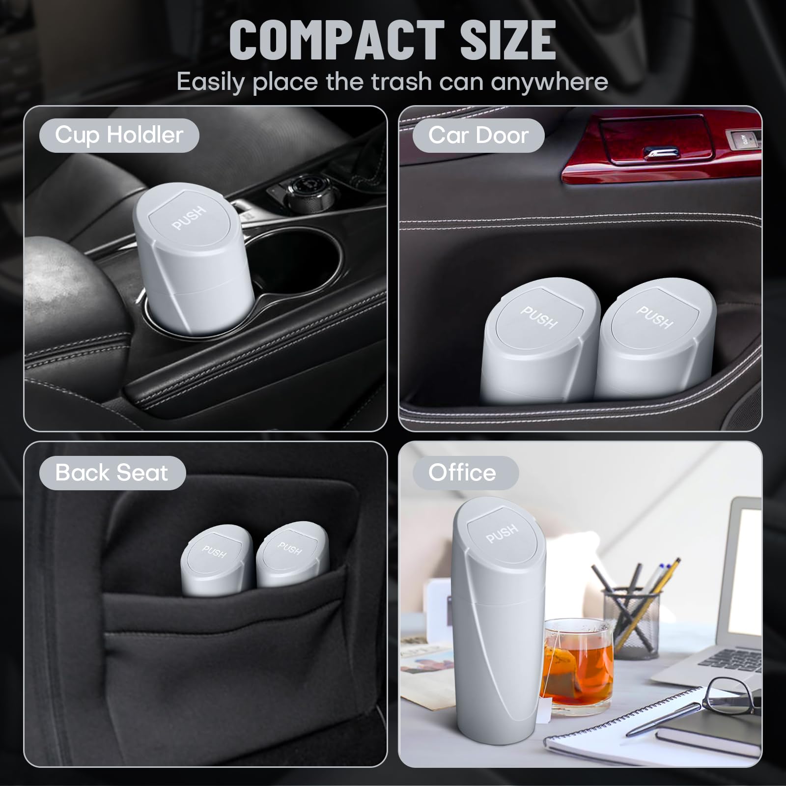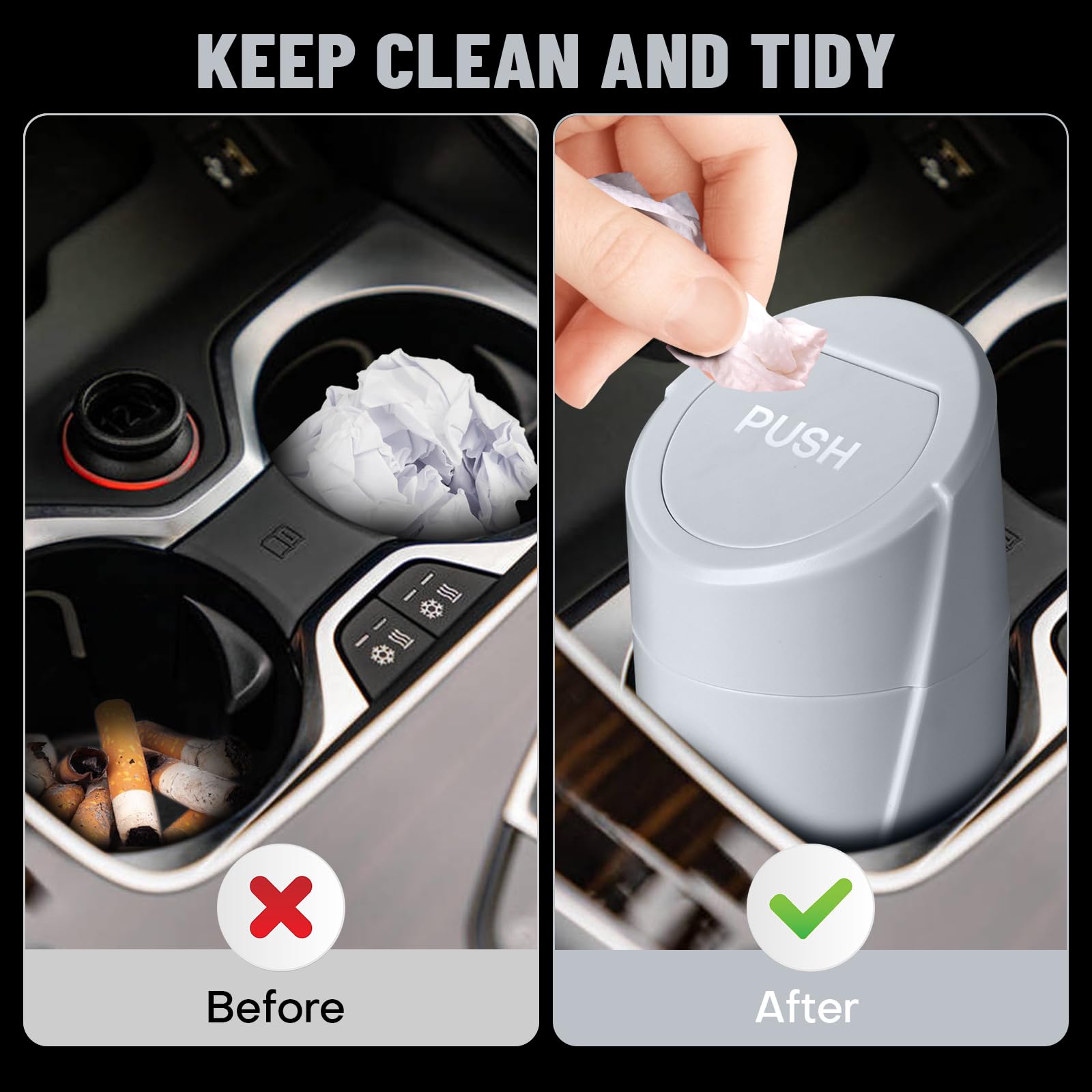 【Multi-functional Design】 Our Car Trash Can features an innovative design that can be placed in various areas of your vehicle such as cup holders, car door pockets, and seat back pockets. It can also be used as a desktop trash can or organizer at home or in the office, bringing convenience to your vehicle and life.