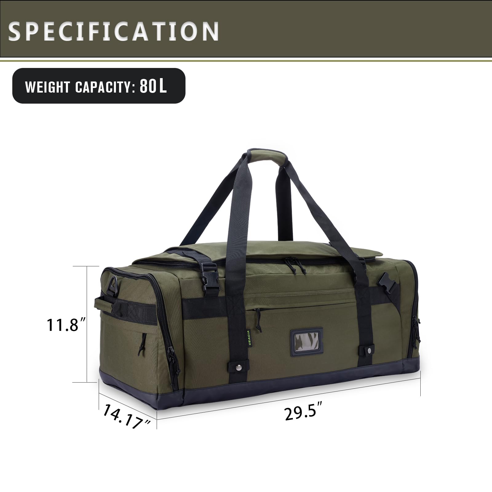 Spacious & Durable Duffle Bag for Travel – This large duffle bag for travel is made of heavy-duty 600D polyester with a waterproof bottom, perfect for gym, military, or family trips. Features a 10-gauge nylon zipper with locking holes for security. Available in M (80L) & L (103L)