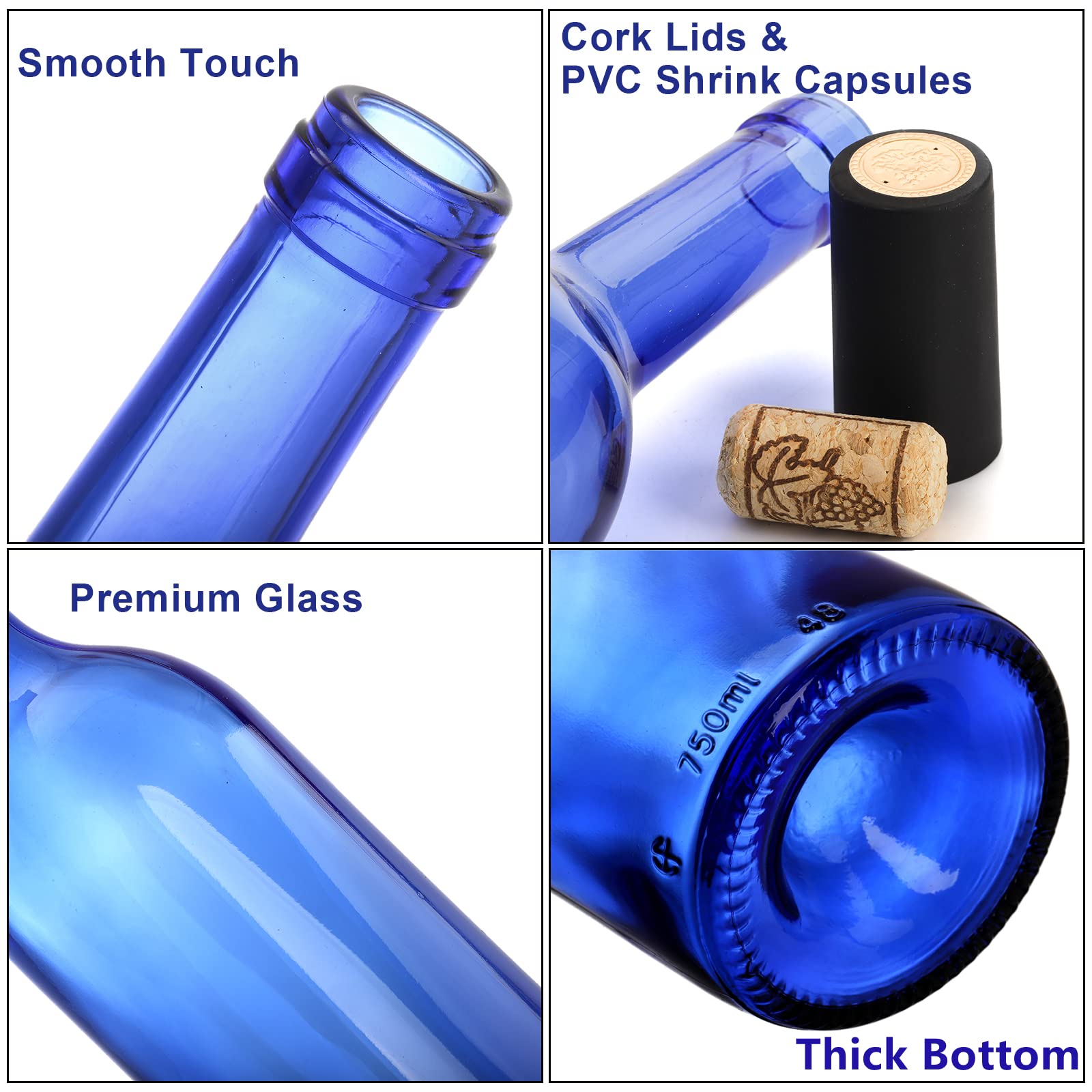 Our empty wine bottles are made of premium high-end food-grade glass, thick and reusable, sturdy and heavy-duty. The natural corks and PVC shrink capsules are durable and convenient for using, also can hold high pressure, which are ideal for fermenting and brewing. Cobalt blue bottles are great for rieslings or blue fruit wines
