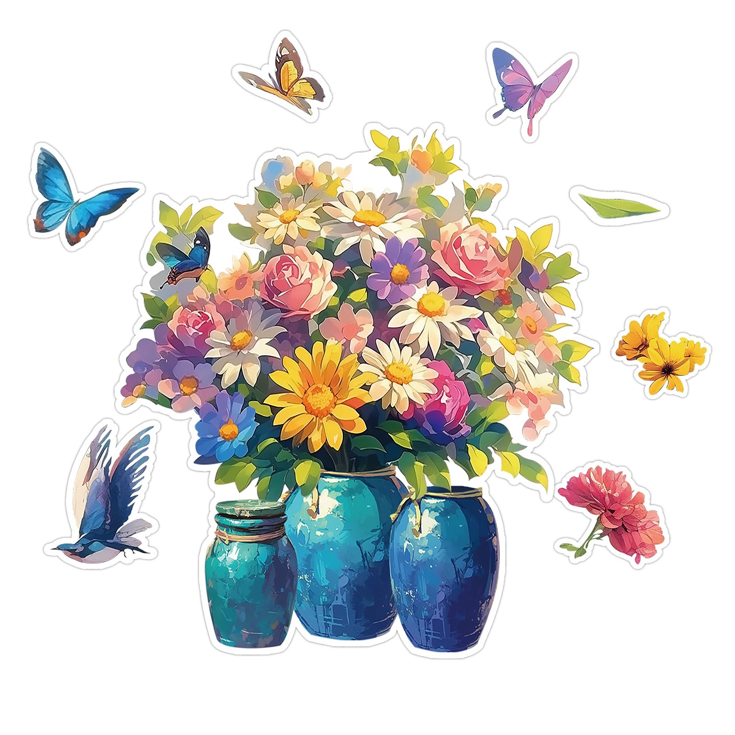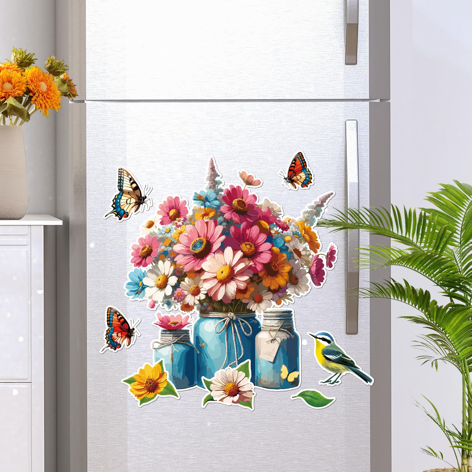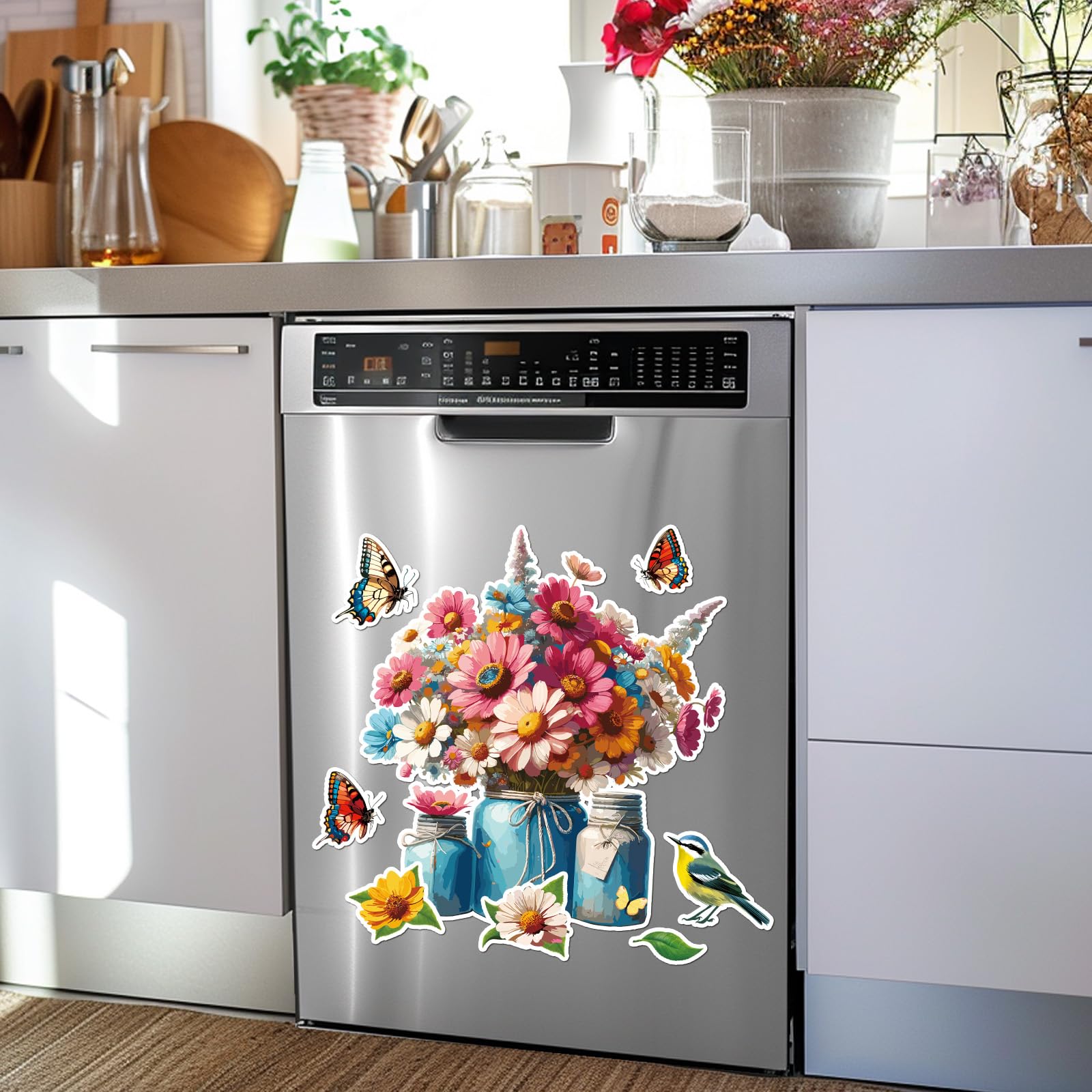 Housewarming Gift: It is such a beautiful spring scene with some flowers, butterflies, a bird, a leaf, and a vase. Our flower dishwasher sticker fridge magnets are ideal gifts for families and friends