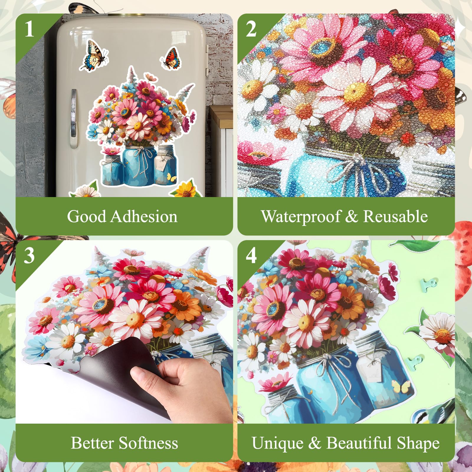 Widely Used: These Flower magnets for fridges are practical and multifunctional. You can use them to decorate the dishwasher, refrigerator, car, garage door, whiteboard, and email box. Easy to change the vibe of your kitchen. Our flower dishwasher stickers will brighten up your home and help reduce the stainless steel finger print issues