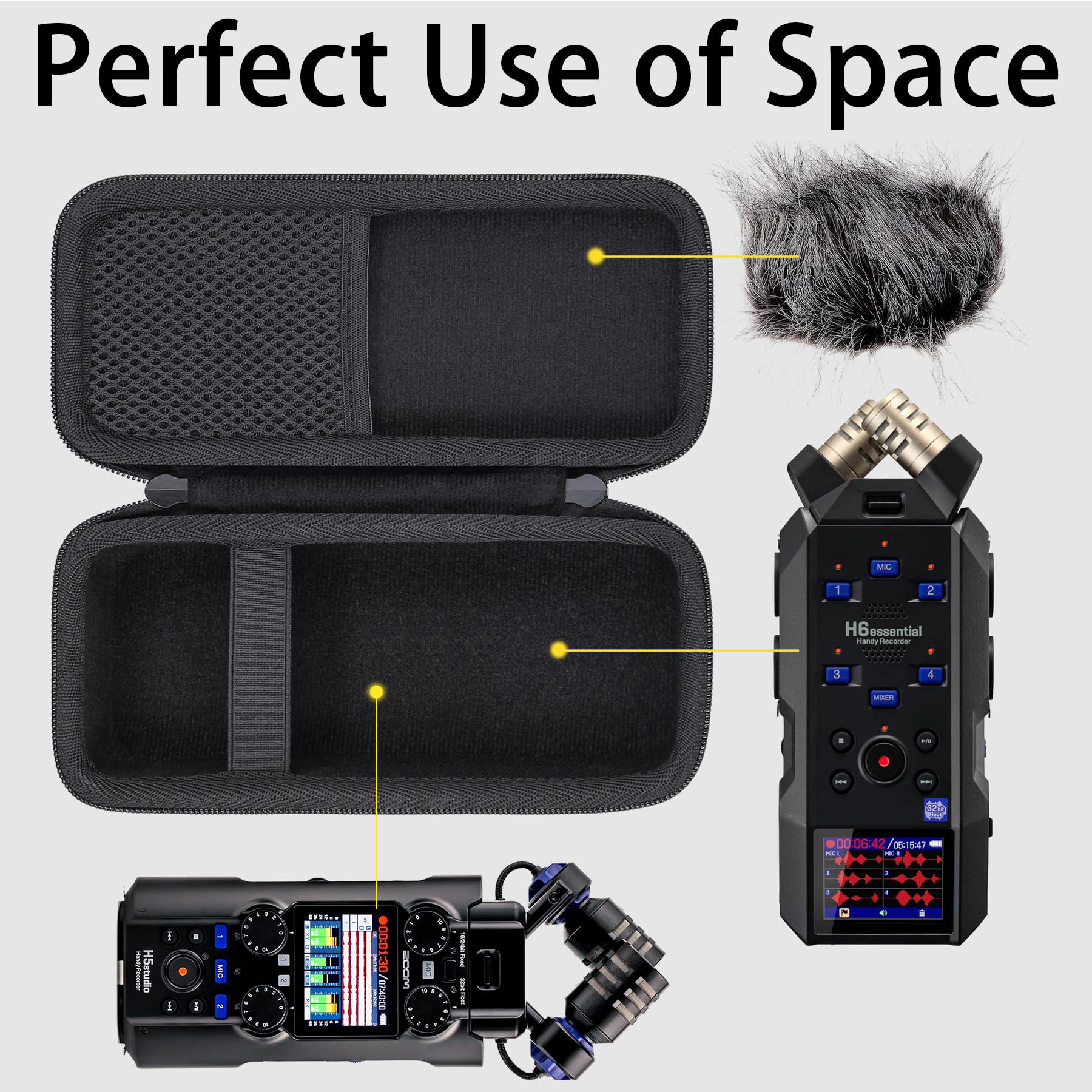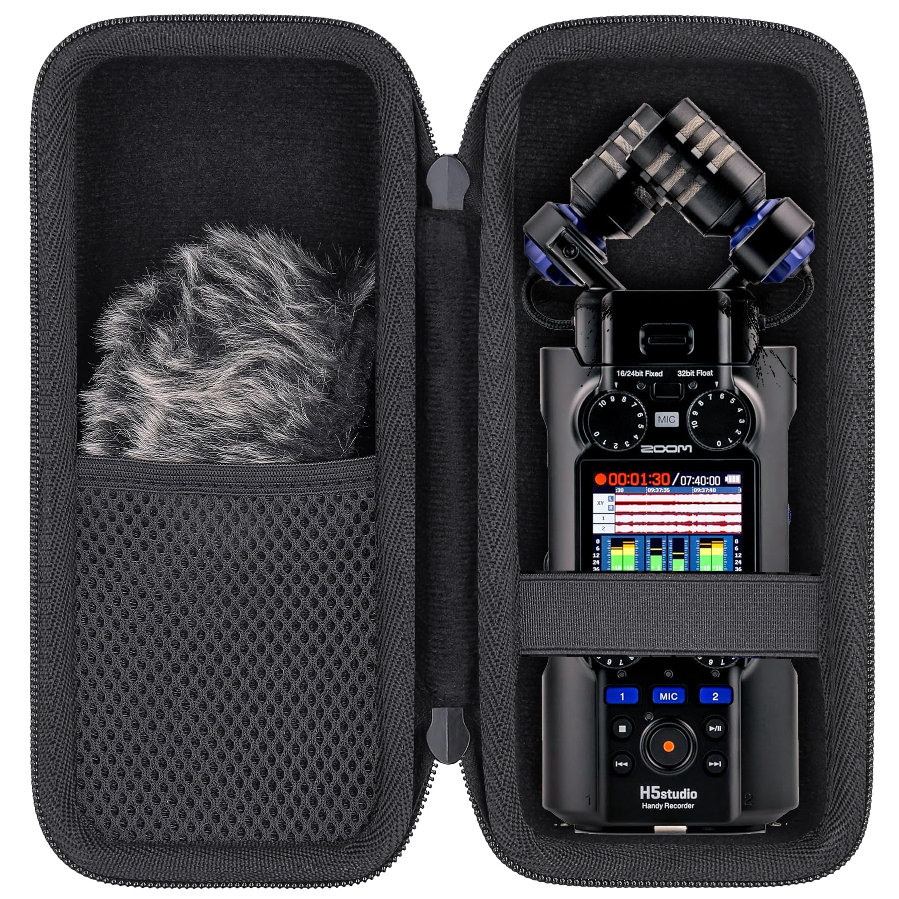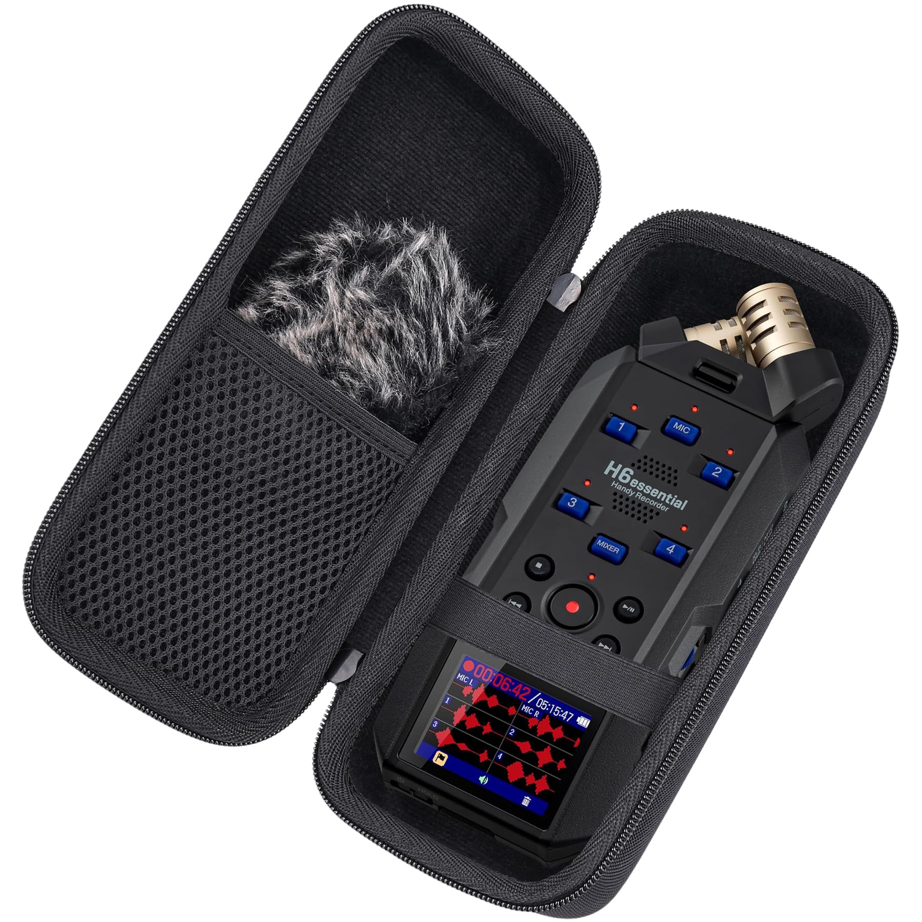 Built-in mesh pocket can hold up microphone fur windscreen windshield for h6studio/h5studio/h6essential recorder and USB charging cable, you can easily store and carry the h6studio/h5studio/h6 essential zoom recorder at anywhere.