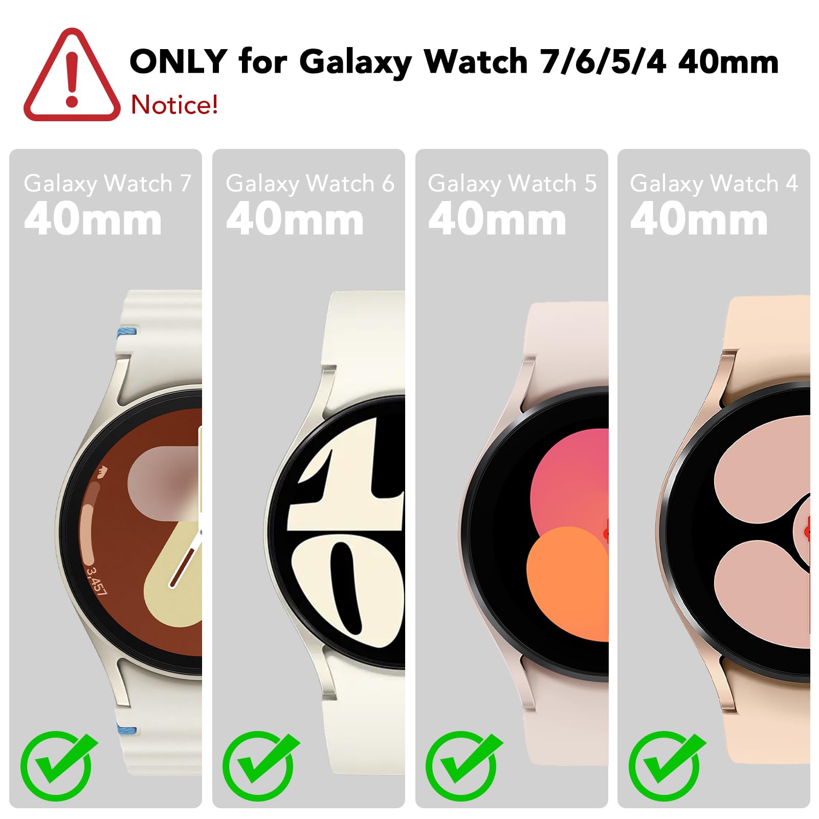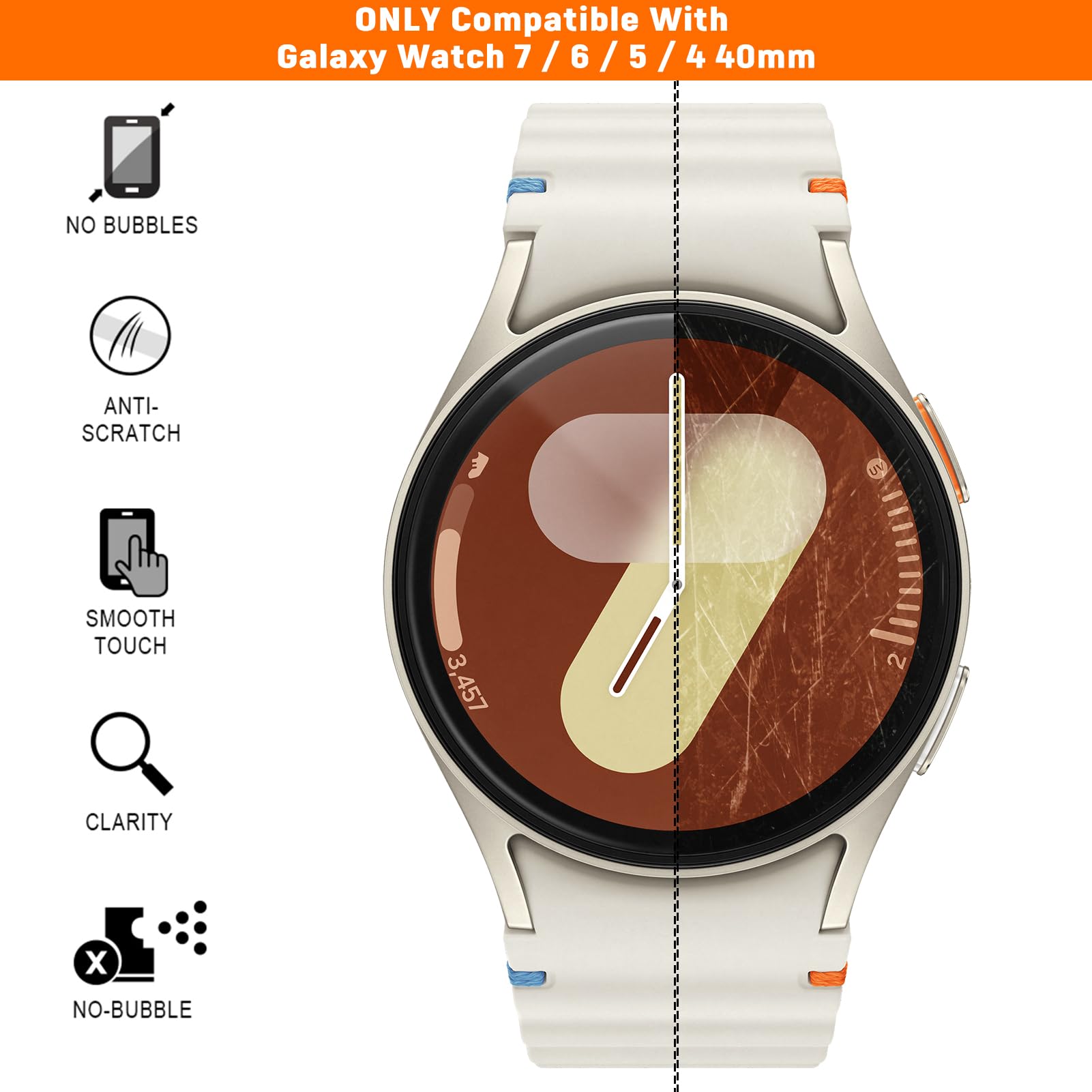 Application:Compatible with Samsung Galaxy Watch 7 40mm(2024 New Released) & Samsung Galaxy Watch 6 40mm(2023) & 5 40mm(2022)& 4 40mm(2021). NOT FOR OTHER MODELS. 40MM refers to the smartwatch model: Samsung Galaxy Watch 7/6/5/4 40mm,Not the screen size. This galaxy watch 7 /6 / 5 / 4 Screen Protector 40mm offering external surface protect to your samsung watch 7/6/5/4, and it also can be removed conveniently!