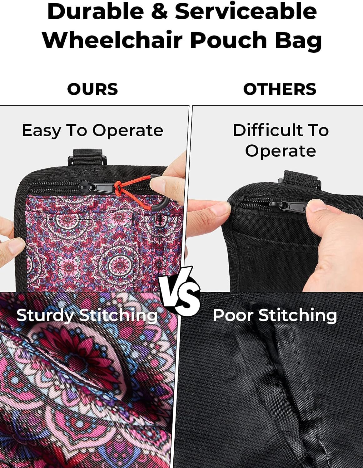 【Durable and Lightweight】Made from heavy-duty nylon, this wheelchair bag is durable and lightweight. The side pouch seams are double-stitched, and stress points are reinforced to ensure it can withstand everyday use for years to come. Cleaning is a breeze - simply wipe the waterproof nylon with a damp cloth.