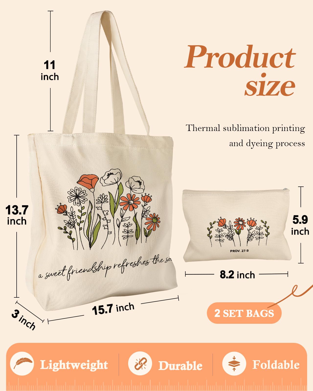 Durable Canvas Material: This women canvas tote bag set is made of high-quality cotton canvas material and utilizes the heat sublimation process. It is soft, lightweight, and can be reused and washed repeatedly. The sturdy cotton canvas fabric and strong handles ensure durability even with daily wear and tear.