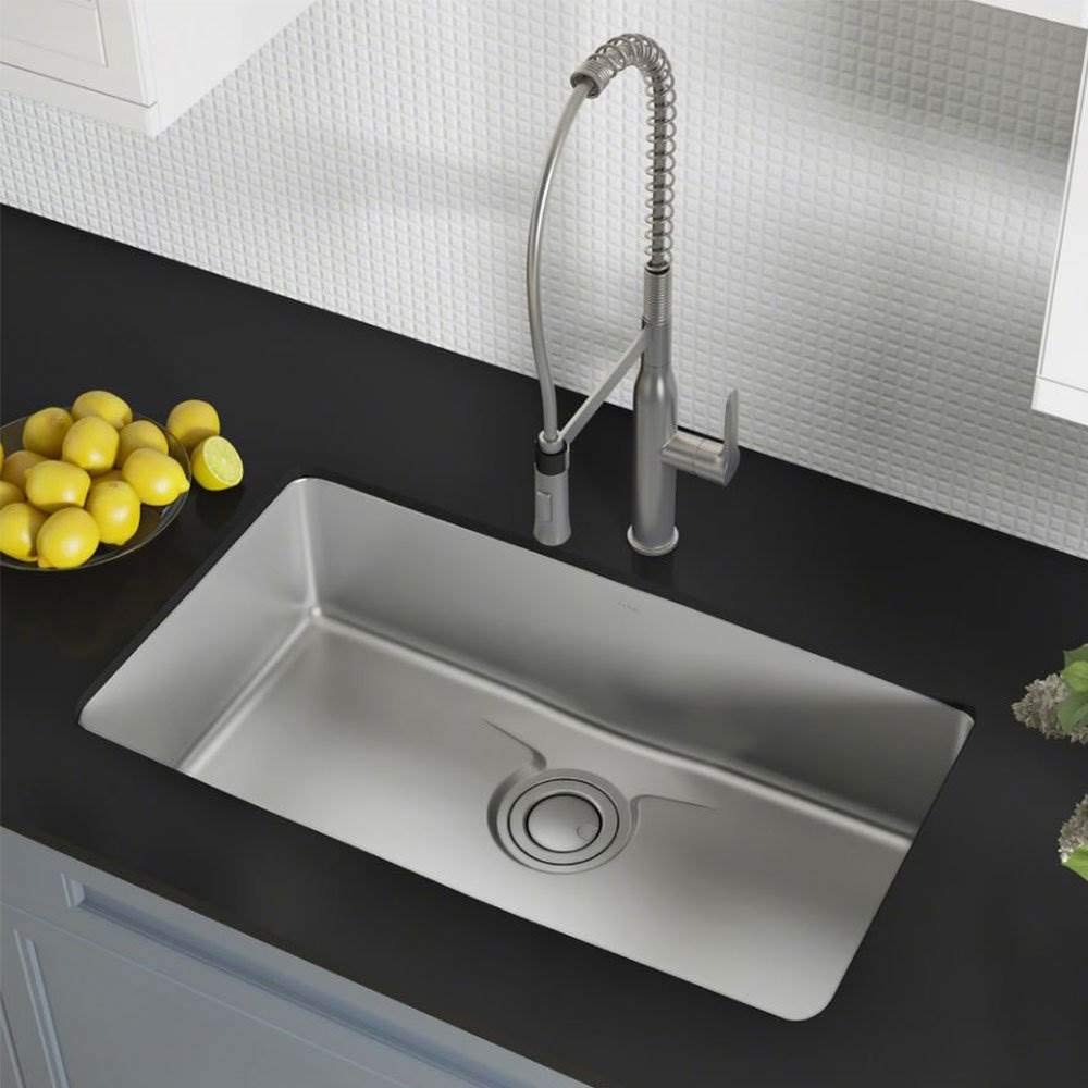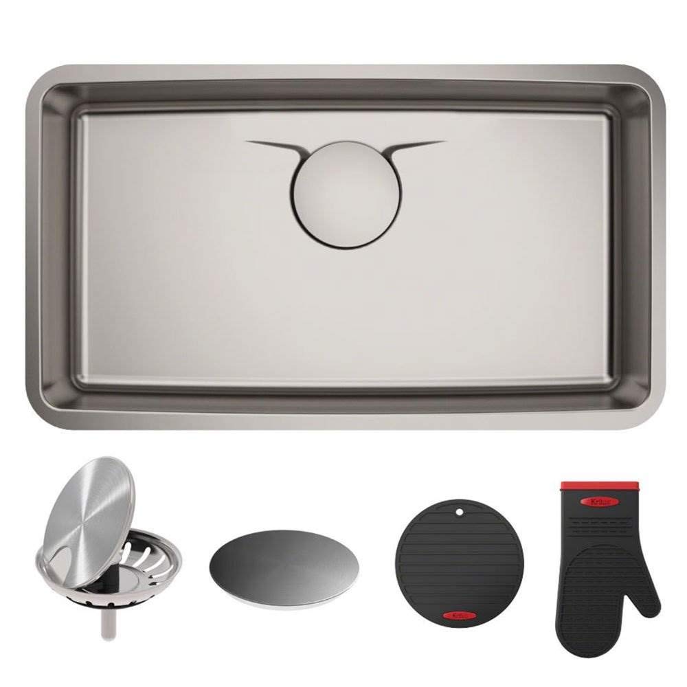 OUTER SINK DIMENSIONS: 32 7/8 in. L x 18 7/8 in. W x 9 1/4 in. D; INNER DIMENSIONS: 31 1/8 in. L x 17 1/8 in. W x 9 in. D; Minimum Cabinet Size: 36 in. – SINK KIT INCLUDES: Large single bowl undermount sink, VersiDrain assembly, DrainAssure decorative cover, heat-safe silicone mitt and trivet – RECOMMENDED Dish Grid: To get the perfect fit for your sink, pair it with the BG3117 bottom grid (not included)