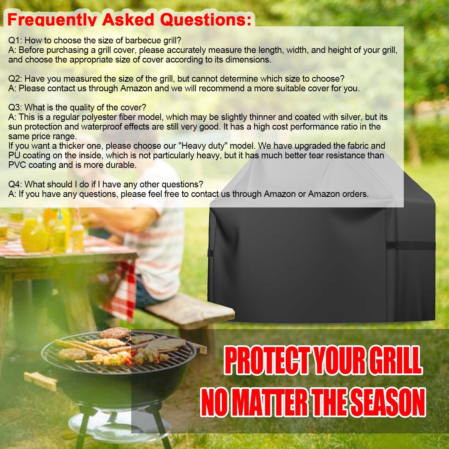 [Use with Confidence]: We provide multiple sizes of covers for grills of different sizes. If you have any problems, please contact us at any time by Amazon Order, and we will speed up the process to resolve the issue and ensure your satisfaction