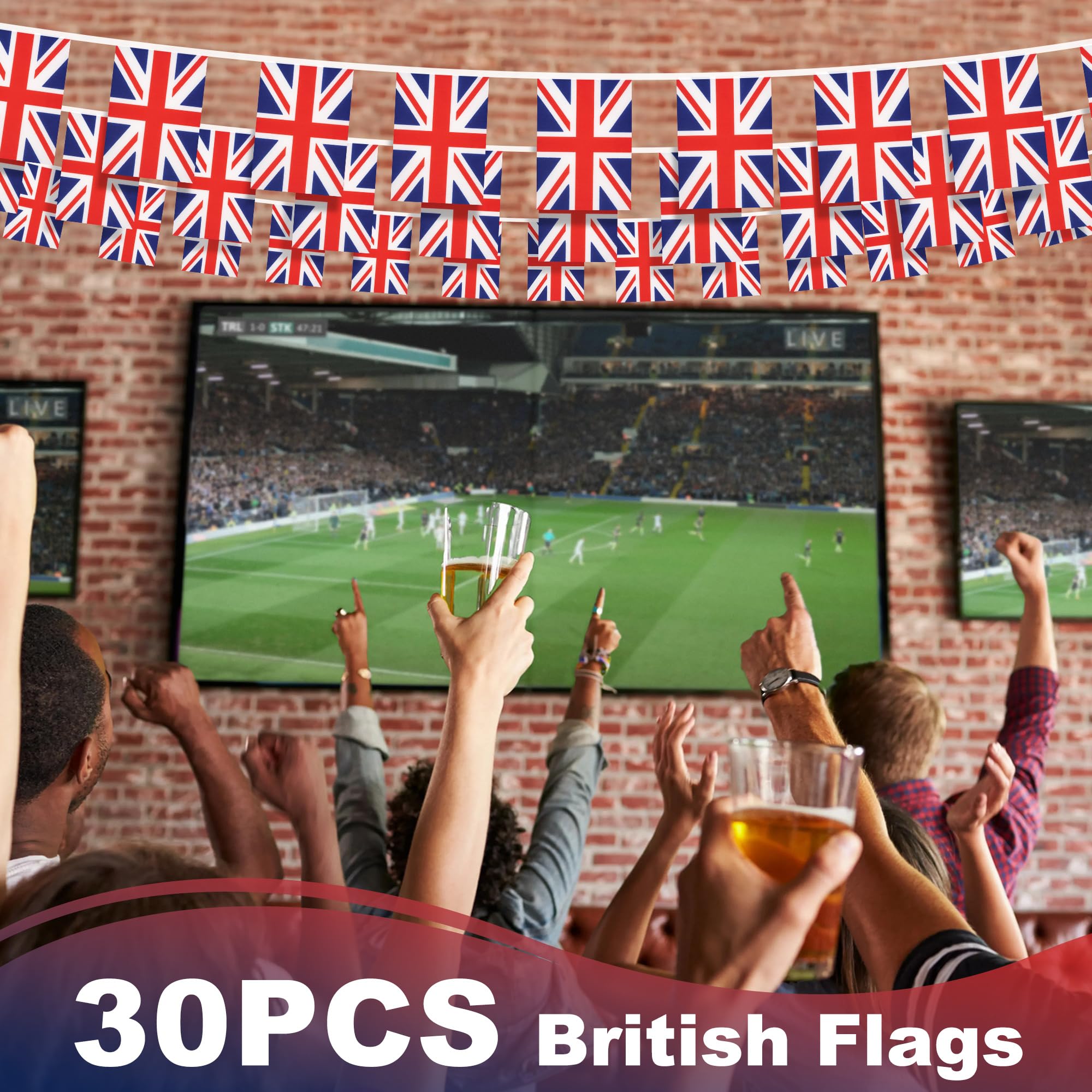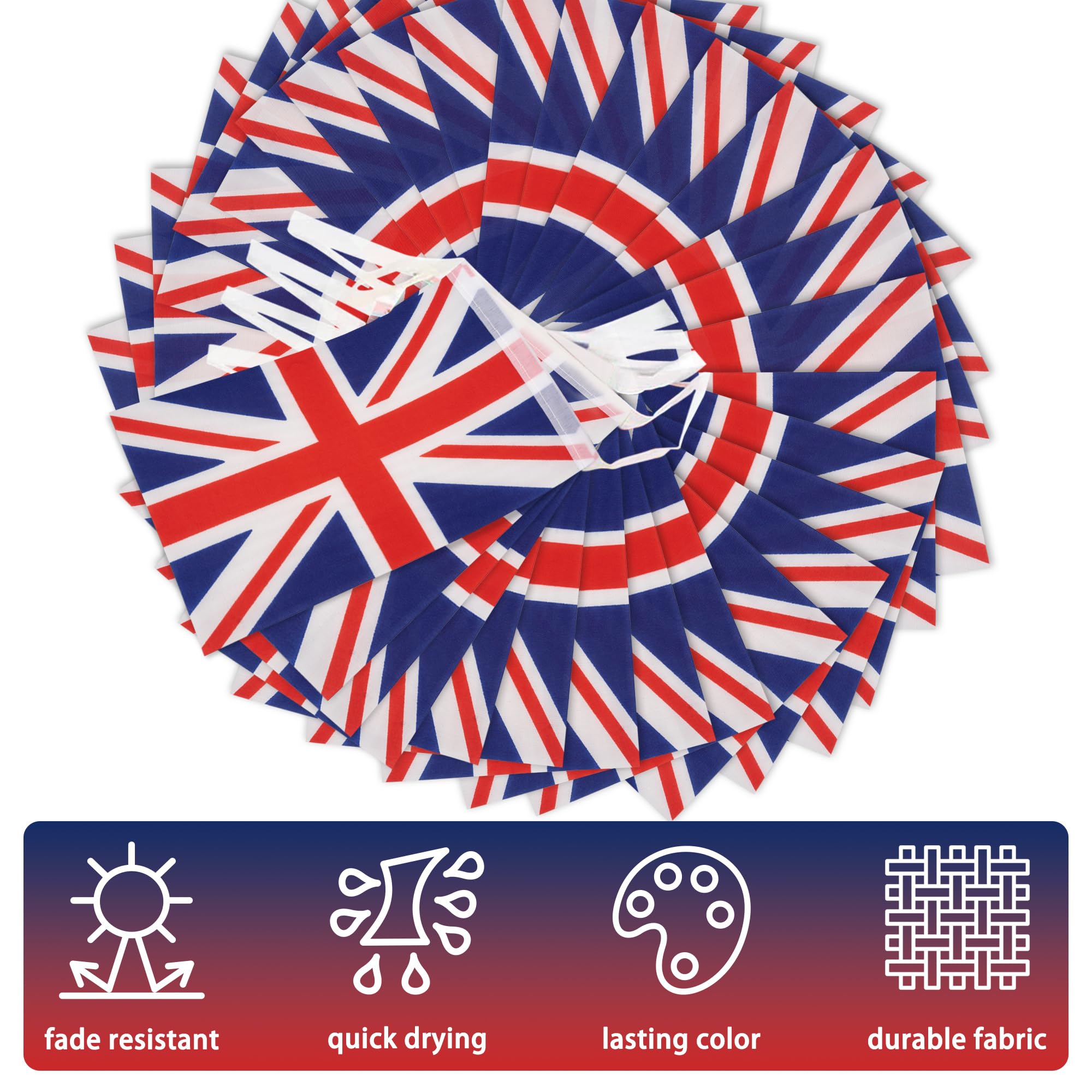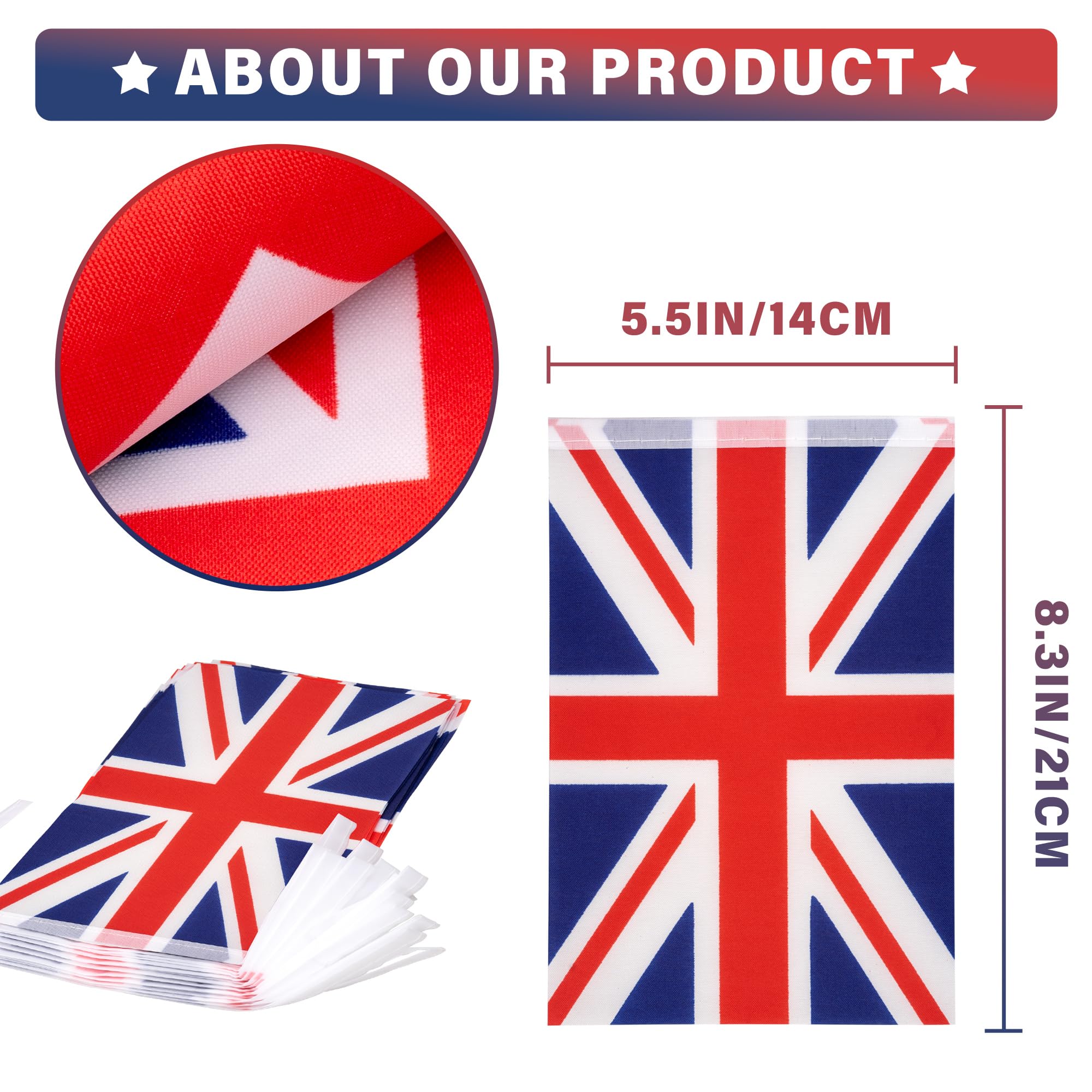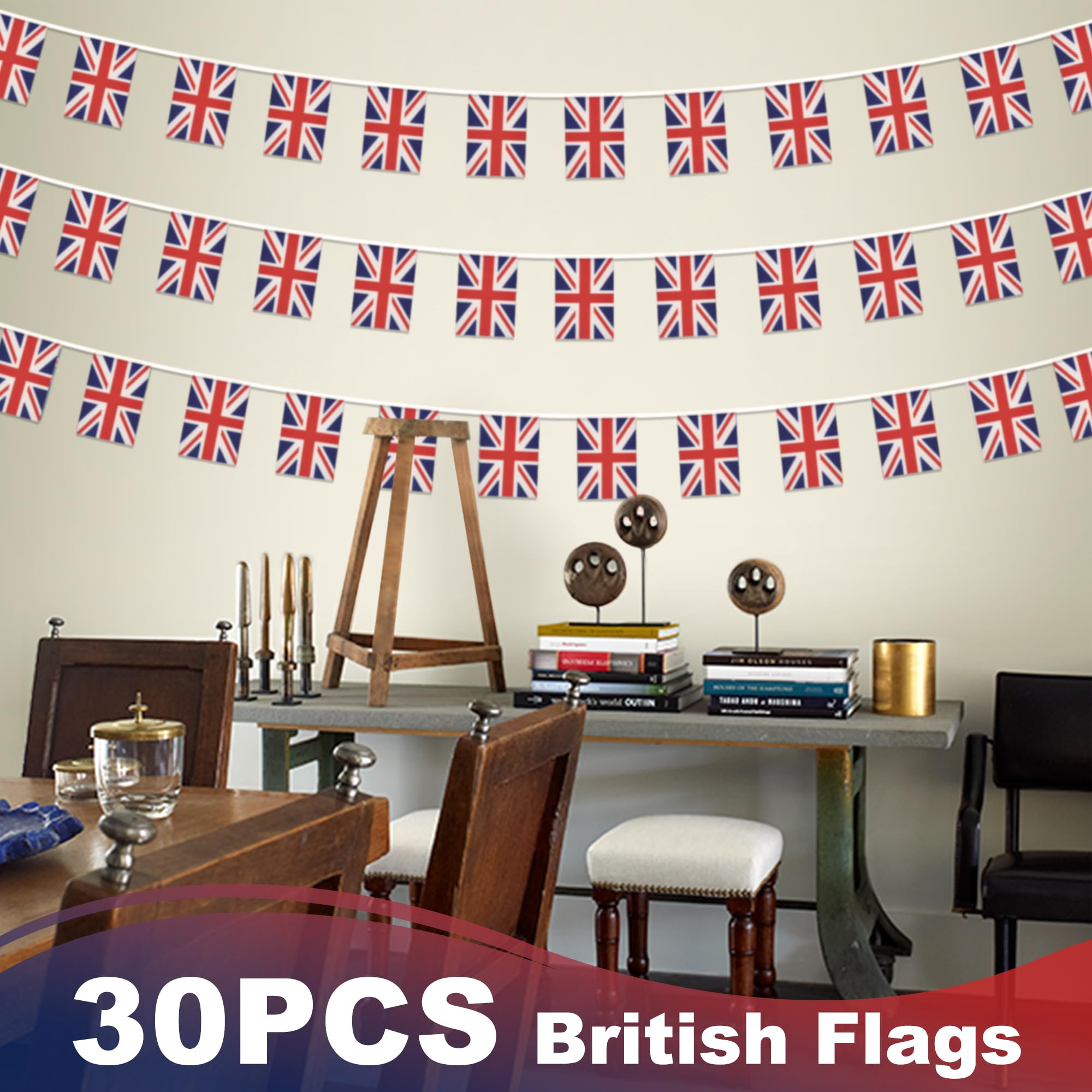 【Specifications】Each string is approximately 33 feet long. Includes 30 pcs UK British flags. Each flag is approximately 5.5 in wide and 8.2 in long.