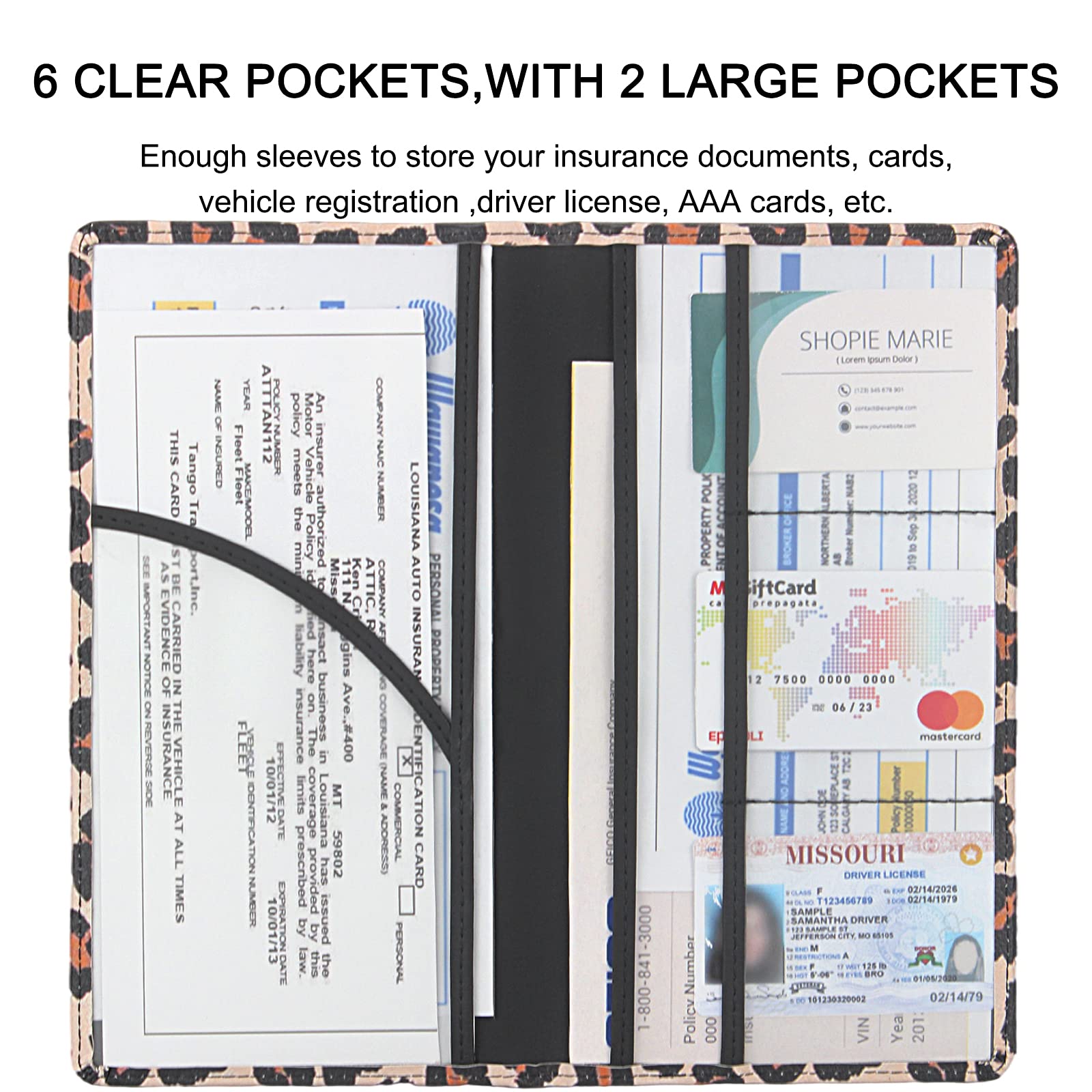 CAR ORGANIZER PRACTICALITY: Car registration and insurance holder has multi-function clear compartments which can organize various items very well. The car document holder large pocket for insurance documents and 2 pockets for vehicle registration, 3 small pockets for driver's license, ID cards, AAA cards, business cards, receipt, key contact information cards, etc. It can fully meet your needs