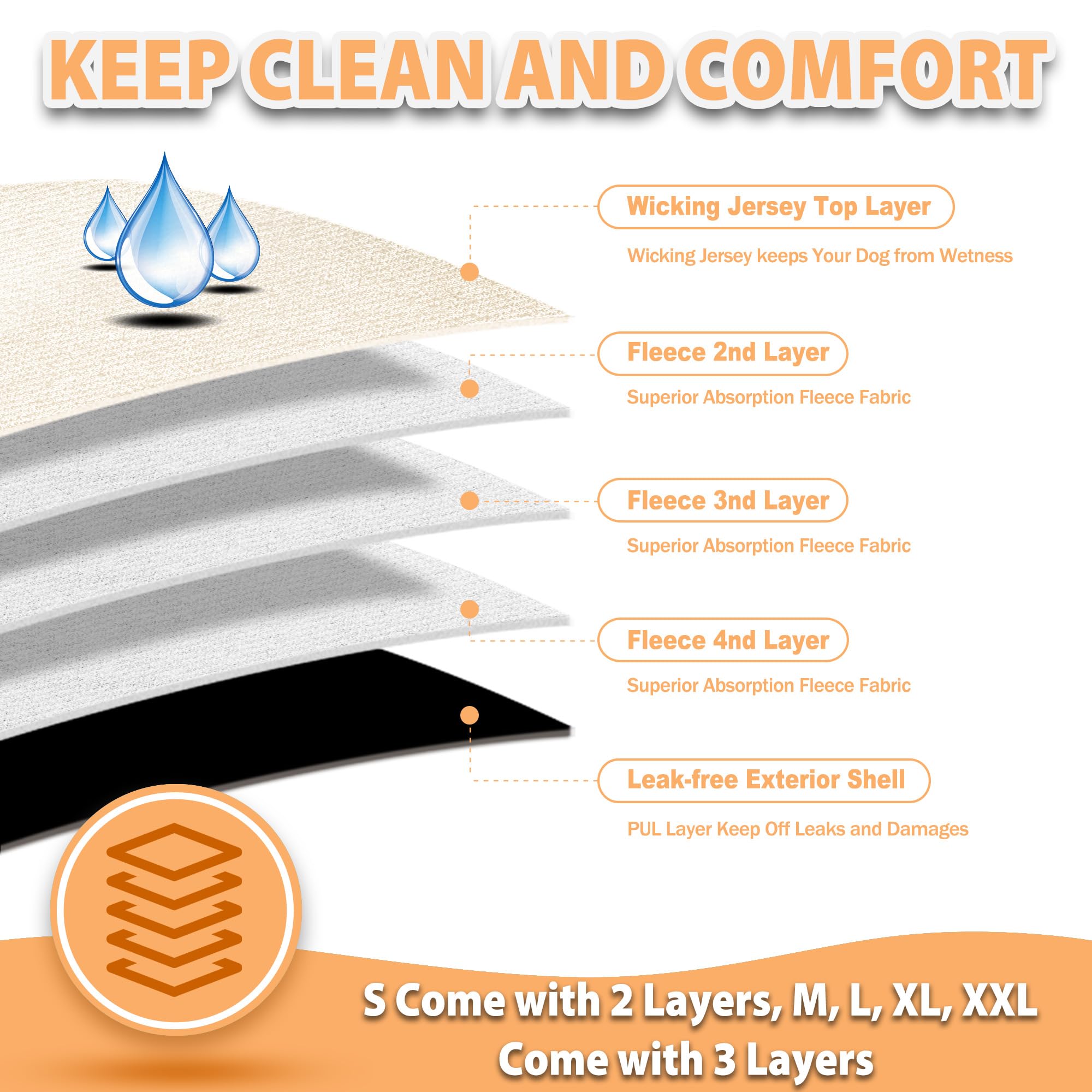 Absorbent & Leak-free Materials - The reusable female dog diaper inner layer is made of soft and breathable beige color wicking jersey, perfect to keep the dog from wetness. The 3 middle layers are made of highly absorbent fleece to absorb the liquid and stop any leaks.The diaper outer layer, with attractive and fun designs, is made of smooth and soft-to-touch leak-free TPU material to keep the floor or bed dry and clean.