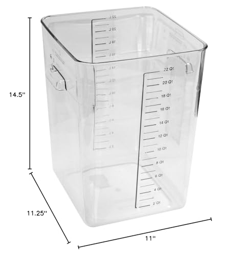 The Rubbermaid Commercial Space Saving Food Storage Container, 22-Quart, Clear, keeps food fresh, organized, and ready-to-use. Featuring easy-to-read graduated measurements in blue for liters and red for quarts, these plastic food storage containers make it easy to measure contents. Because we believe the best food storage containers use space efficiently, we've designed these plastic containers with a square shape that offers 25% more storage capacity than round containers. Constructed of break-resistant polycarbonate, they have a temperature range of -40°-212°F making them perfect for everything from freezer storage to sous vide cooking. Commercial dishwasher safe, they feature durable handles with drain holes for proper washing and drying. USDA-certified for food contact, it assists in complying with HACCP guidelines and is NSF 3-A Meat and Poultry Equipment and NSF 2-certified.