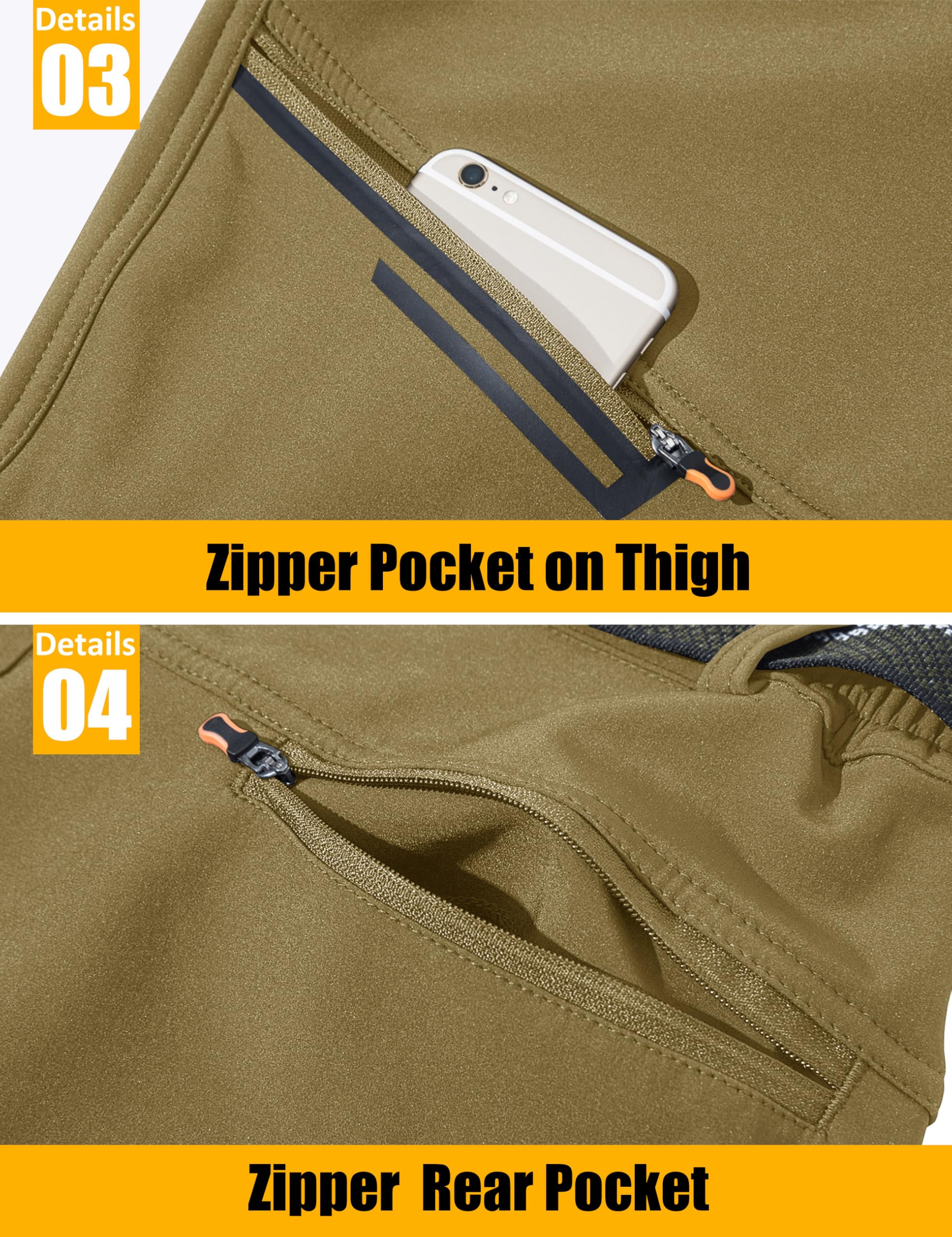4 Zipper Pockets: 2 Zipper Hand Pokets, 1 Zipper pocket on right thigh and 1 Zipper Rear Pocket, Keeping Your Essentials Securely