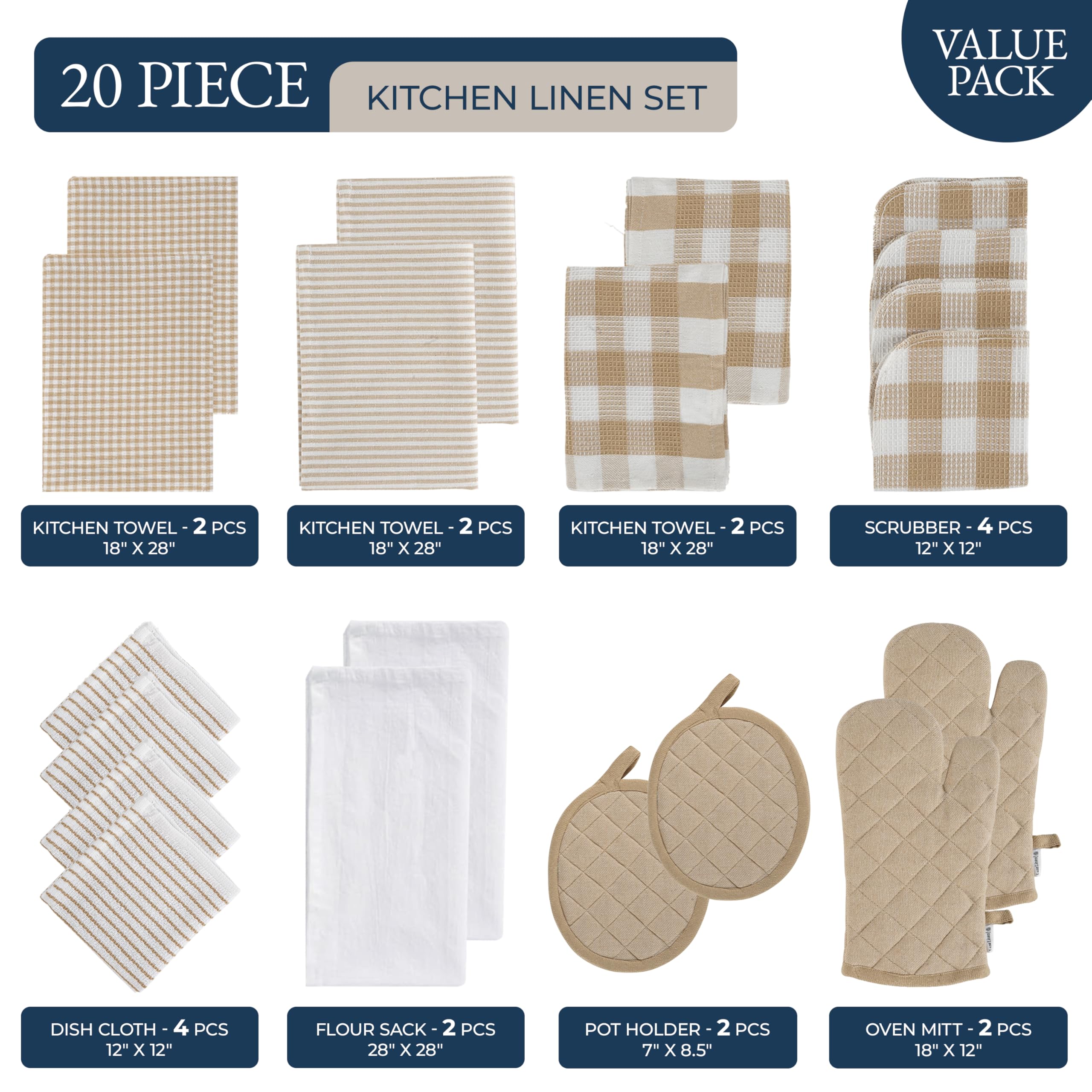 20-Piece Kitchen Marvel: Get more for less with our 20-piece set! Includes 6 cotton kitchen towels (16"x28"), 4 dishcloths for kitchen (12"x12"), 4 dish scrubbers for washing dishes (12”x12”) 2 flour sack dish towels for kitchen (28”x28”), 2 Pot Holders, 2 Oven Mits. All 100% cotton – soft, durable, and ready to tackle any kitchen task!