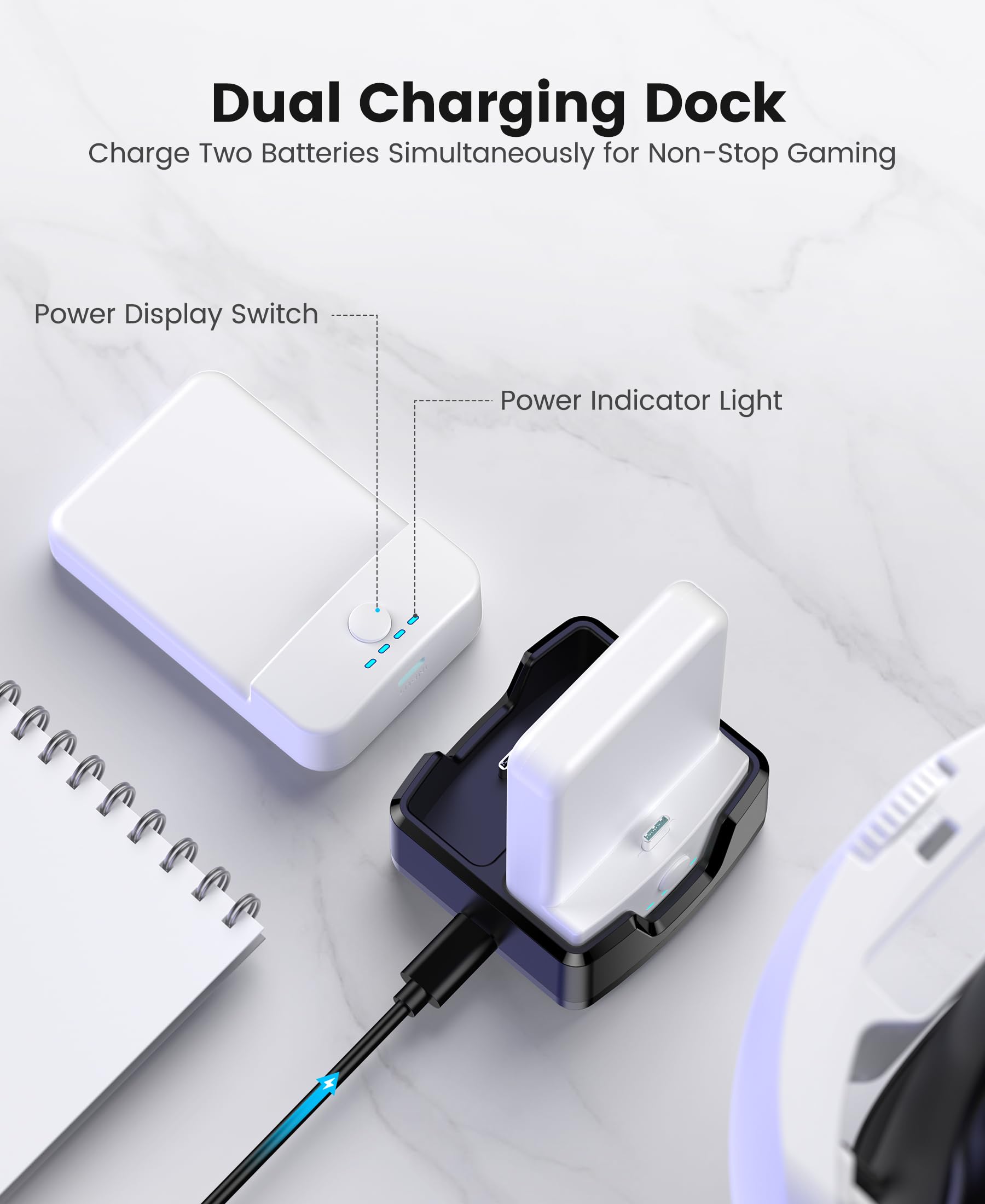 【15,000mAh Hot-Swappable Battery Pack for Meta Quest 3/3S/2】This VR head strap comes with 2×7500mAh rechargeable batteries and a charging dock, offering up to 7–8 hours of extra playtime. Just swap in a fully charged battery before running low—no game interruptions. The rear battery design also helps balance headset weight, reducing facial pressure and boosting comfort during long sessions.