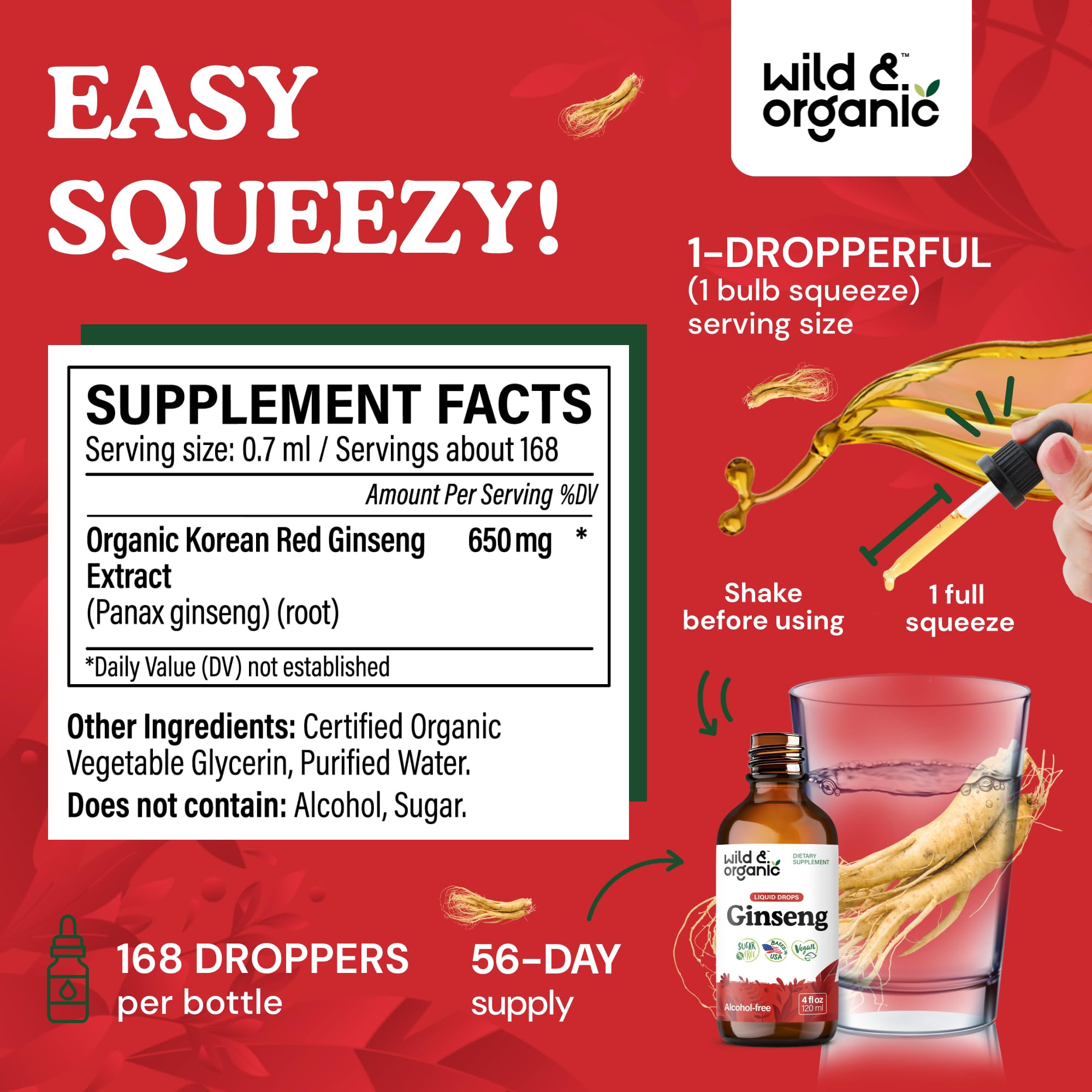 56-Day Supply: Each 4 fl. oz. bottle of Wild & Organic ginseng liquid extract drops contains 168 servings per bottle, providing a 56-day supply when taken three times per day.