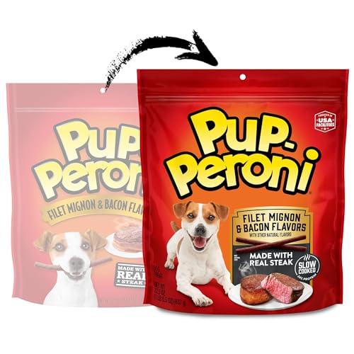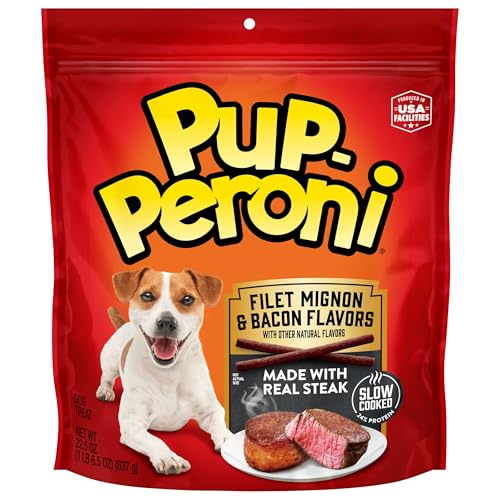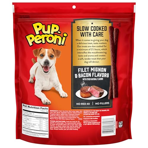 Every dog dreams of steak and bacon flavors in the same bite. Make their dreams come true with Pup-Peroni Filet Mignon & Bacon Flavor dog snacks. Real beef is the number one ingredient, so your pup gets delicious, high-quality protein in every bite. And if that’s not enough to get their tail wagging — each treat is slow cooked for at least 2.5 hours, which helps retain moisture and intensifies the taste and aroma. The result? An irresistibly rich, meaty treat with a soft, tender texture dogs can sink their teeth into. It’s everything your dog wants in a treat … and yet, nothing you don’t. No fillers. No Red 40. Just crazy-good soft dog treats. Pick up a bag today!