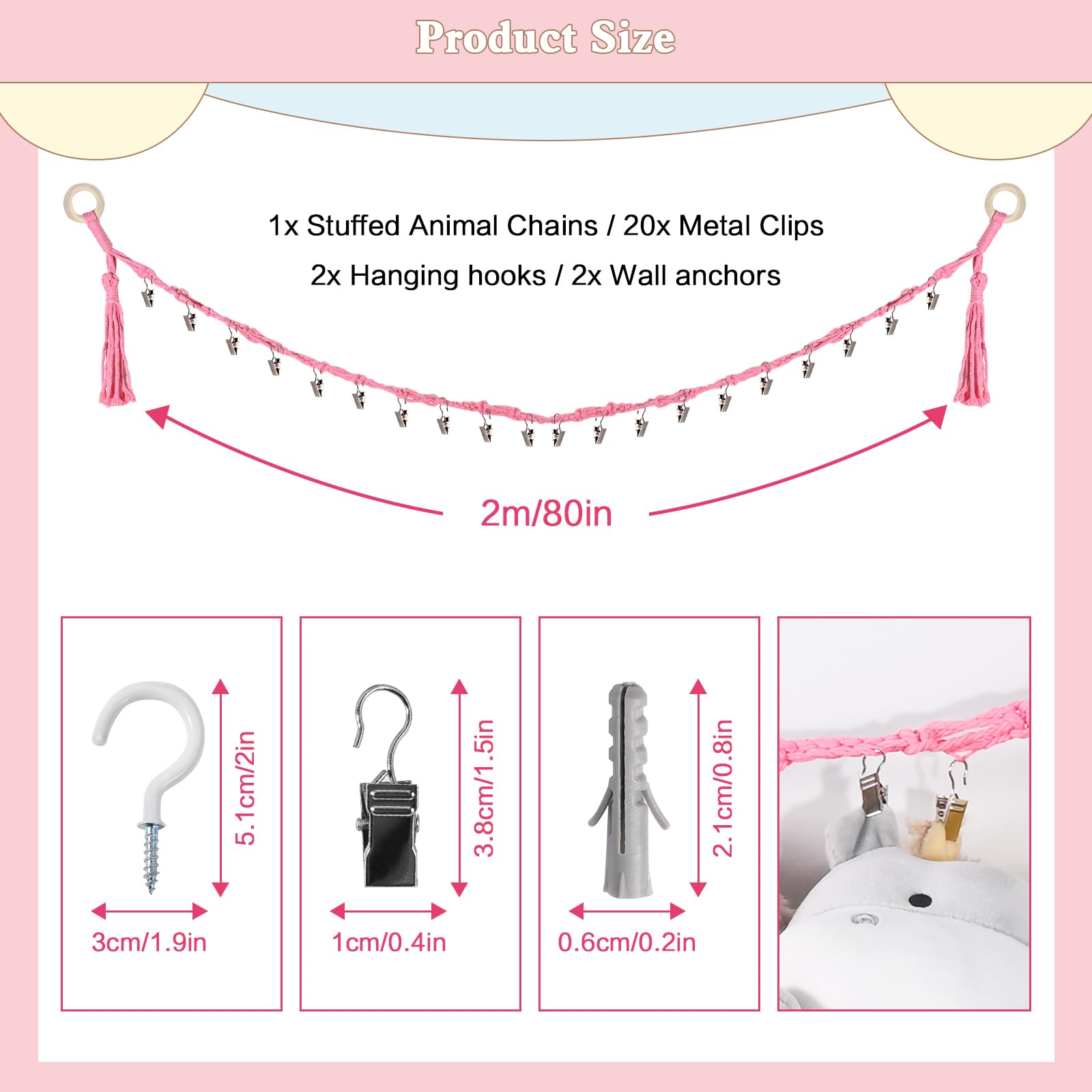 CERETIA 1/2 pcs 80" Cotton Hanging Storage Chain for Stuffed Animals Storage with 20 Metal Clips, Stuffed Animal Organizer Chain for Wall Corner Nursery Play Room, Pink