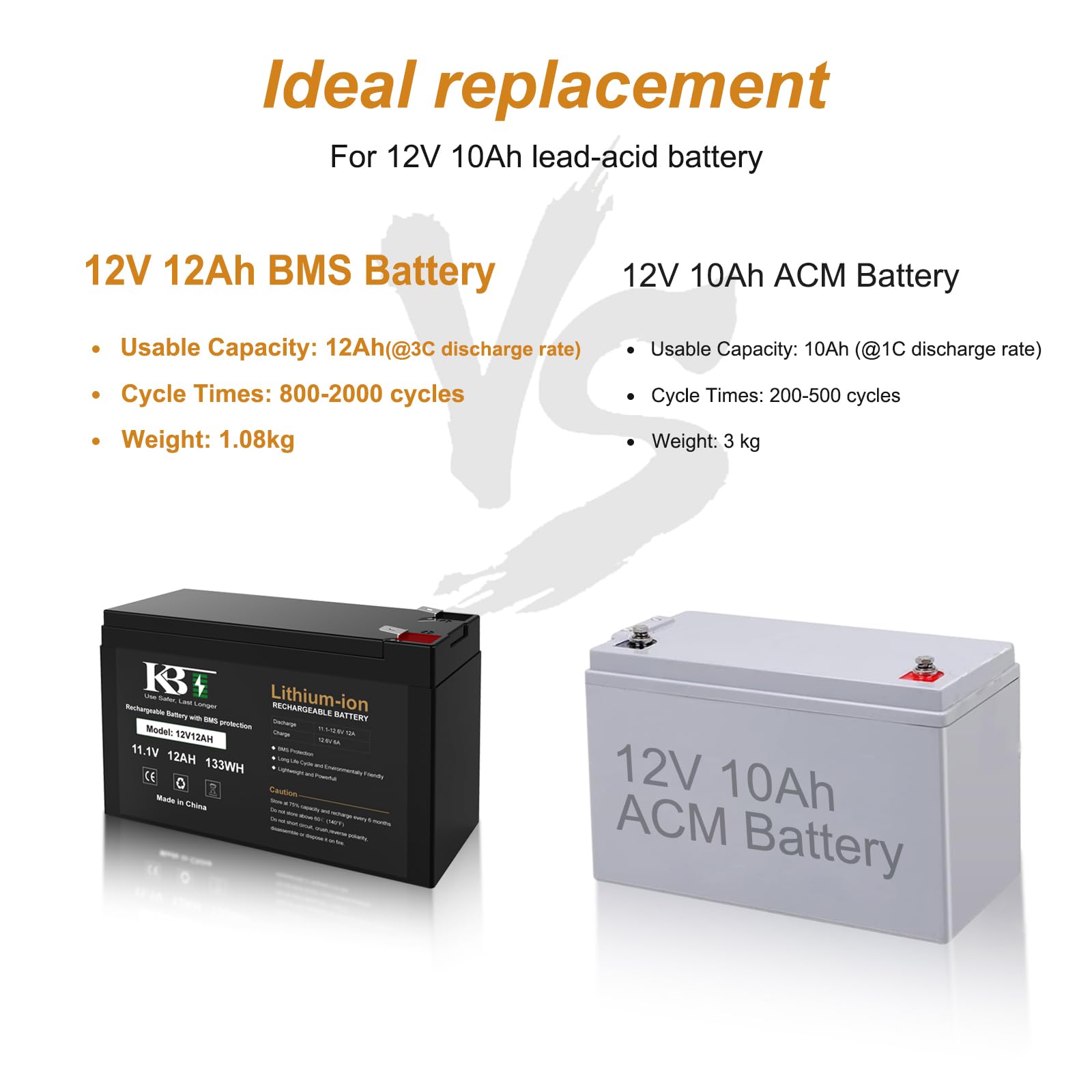 【Long Cycle Times】: Compared to lead-acid battery lasting 200-300 cycles, KBT 12V ternary lithium-ion battery has longer lasting life and there is still more than 80% capacity over 1000 cycles. KBT 12V ternary lithium battery has more powerful discharge funtion, faster charge speed than lead-acid battery.