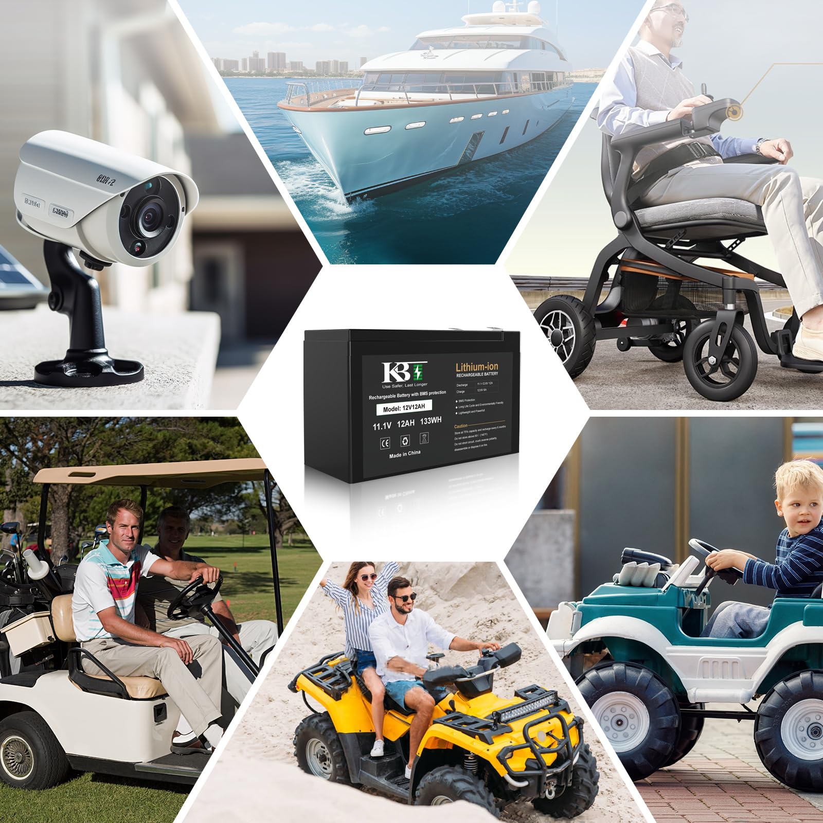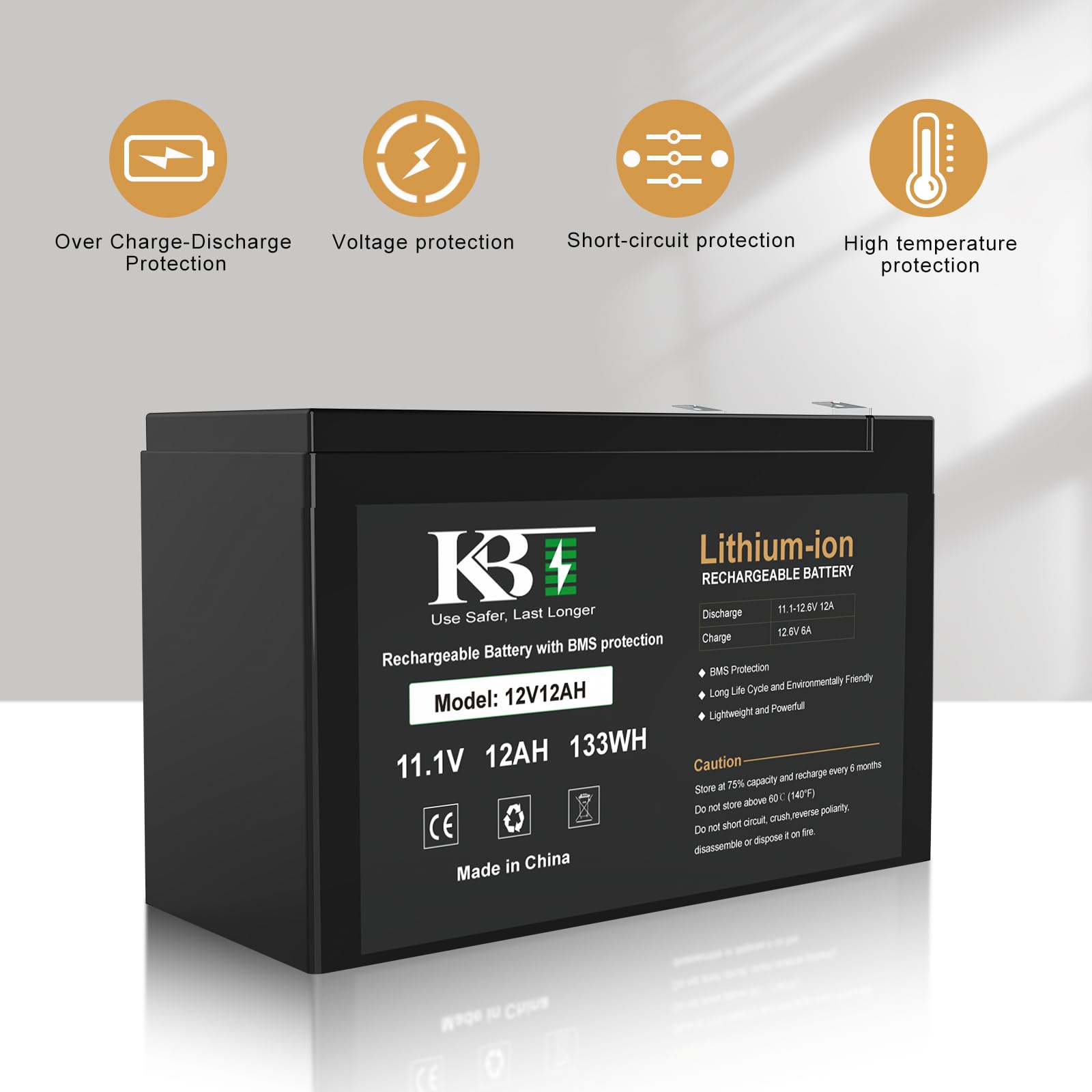 【Premium Battery Performance】: Ternary Lithium-ion battery has high energy density, light weight, long cycle life, good charge-discharge performance, no memory effect, low self-discharge rate, environment-friendly etc. This KBT 12V 12Ah battery has built-in BMS protection PCB Board to prevent battery from overcharge, over-discharge, over-current and short circuit.