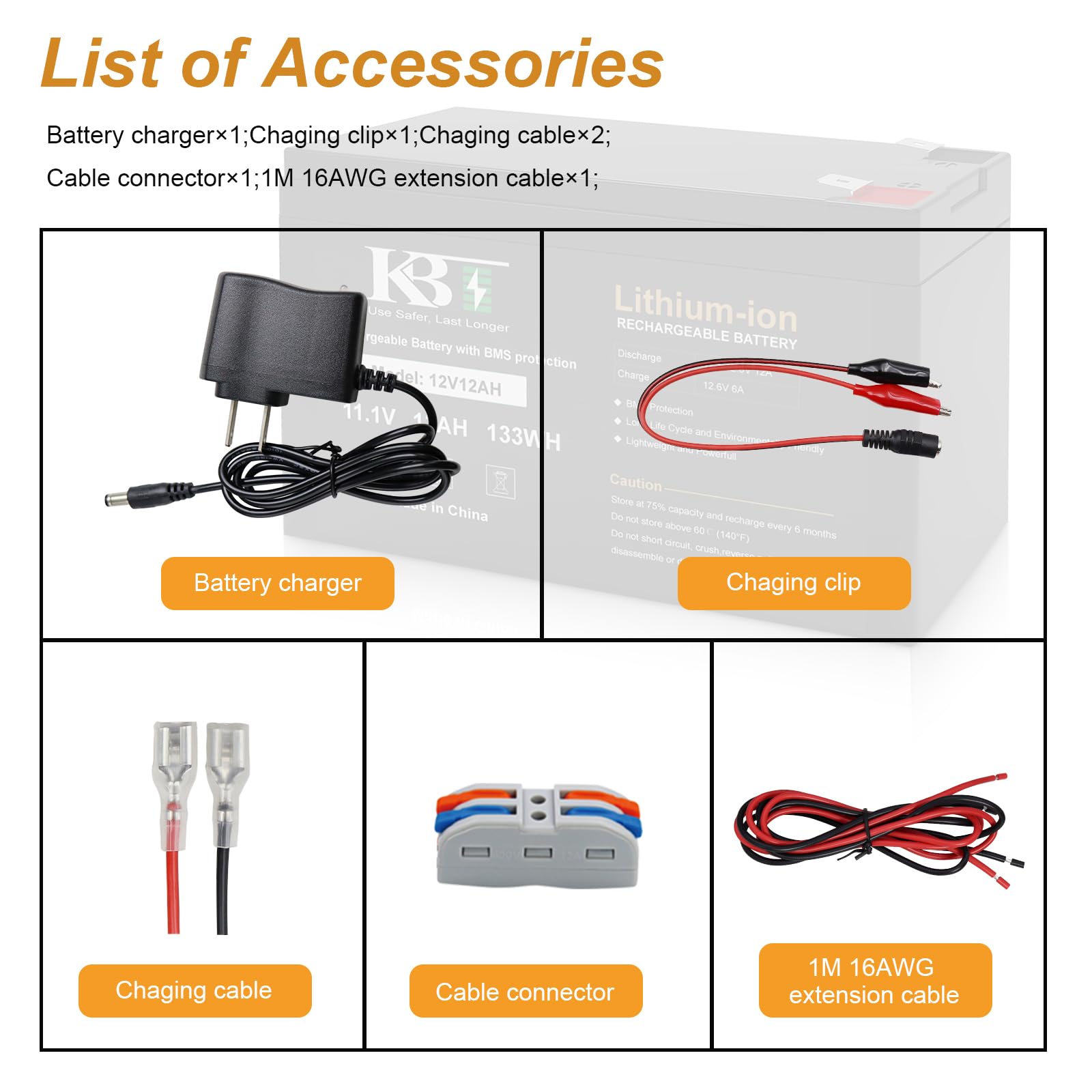 【Box including】: 1* 12V 12Ah ternary lithium-ion replacement battery, 1* 12V charger, 1* charging clip, 2* charging cable, 2* extension cable, 2* cable connector.