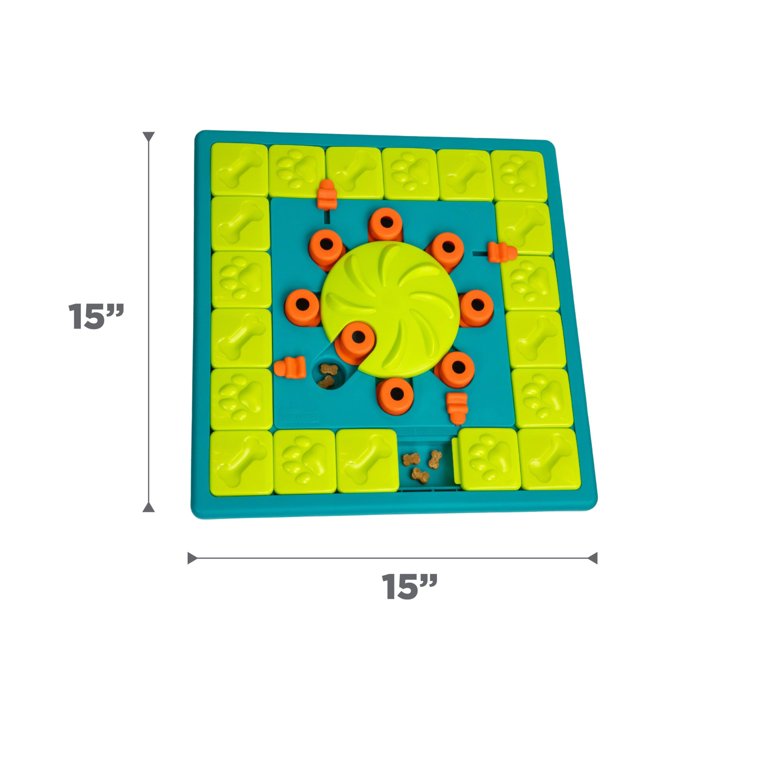 The Nina Ottosson by Outward Hound Multipuzzle is a fun way to challenge your smart dog's mind! This Level 4 Expert dog puzzle is great for dogs who have mastered Level 3 dog puzzles and are craving an extra challenge. It keeps dogs busy with mentally stimulating treat-seeking tasks that activate your dog's senses and tap into their natural instincts to hunt and forage for food. As a result, our dog enrichment toys provide mental and physical exercise, help relieve stress, and reduce boredom for happier, healthier pups. Great for small, medium, and large dogs, the Multipuzzle involves complex actions that must be completed in order; this encourages dogs to tap into their mental skills and problem-solve right before your eyes! Watch your dog use their brain to sniff out the treats, slide tiles, spin the wheel, and move sliders to reveal the hidden rewards. Since all dogs are unique, you can vary the level of difficulty of this dog food puzzle to meet your dog's problem-solving ability, with multiple ways to make it easier or harder for your pet. Moreover, this dog treat puzzle is easy to clean and made from food safe materials that are BPA, PVC, lead, and phthalate-free for your convenience and peace of mind.