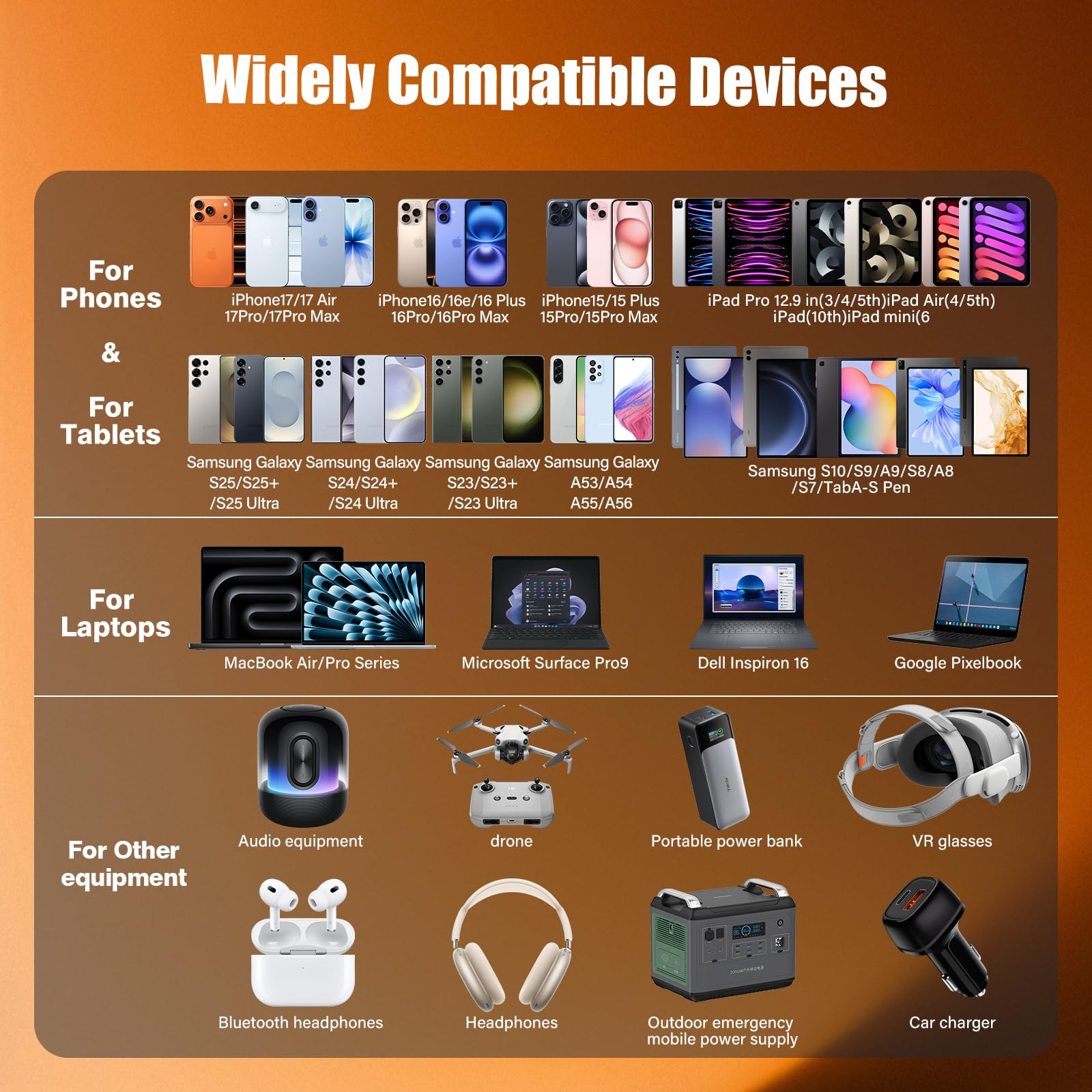【Universal Compatibility】This C to C fast charging cable Compatible with 65W/61W/45W/35W/30W/25W/20W USB C charger.for iPhone Air 17 16e 16 15 Pro Plus Pro Max,for iPad Pro, for iPad Air, for iPad Mini ,for MacBook Pro, for Macbook Air , for Galaxy S25/24/S23/S22/S21, for Galaxy A56/A55/A54/A53,for Galaxy Z Flip7 FE, for Galaxy Z Fold7/6/5,for Galaxy Z Flip7/6/5,for Galaxy W25/W24/W23, for Google Pixel 10/9/8/7/6/5/4/3,for Switch, for PS5 and other USB-C port devices.