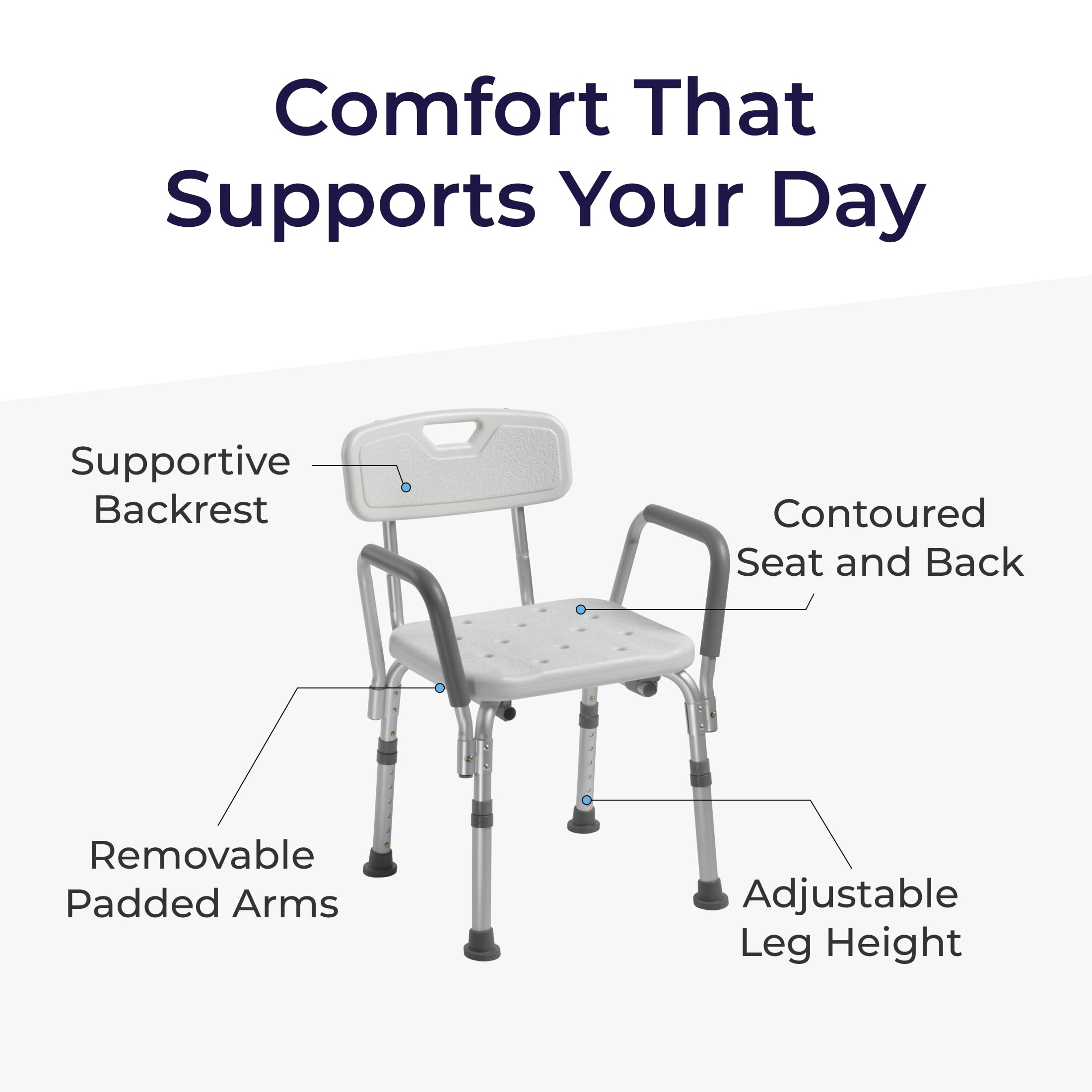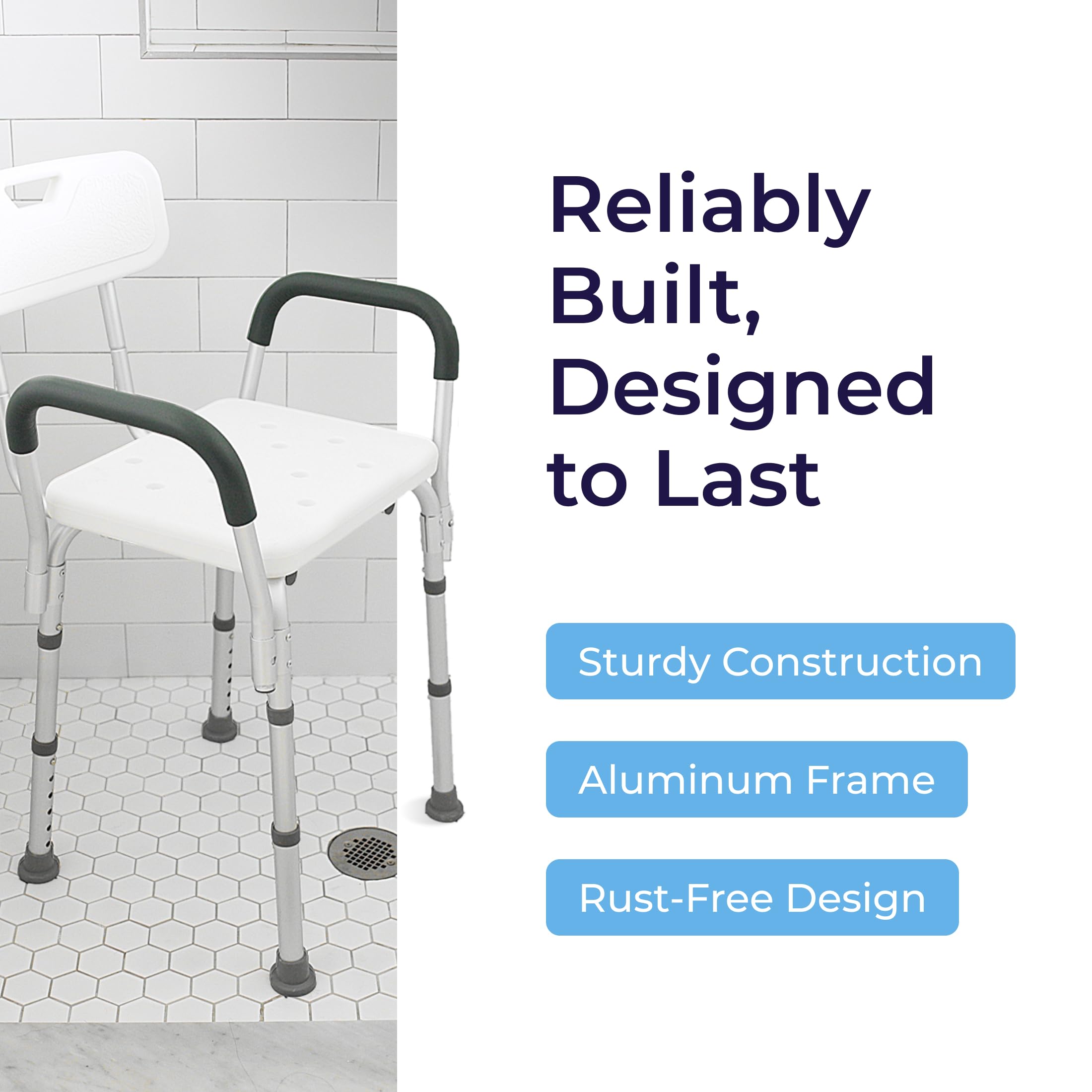 Adjusts to Fit Users: Built to deliver customizable comfort for a wide range of users, this shower stool offers tool-free height adjustment in secure 1-inch increments and removable arms and backrest