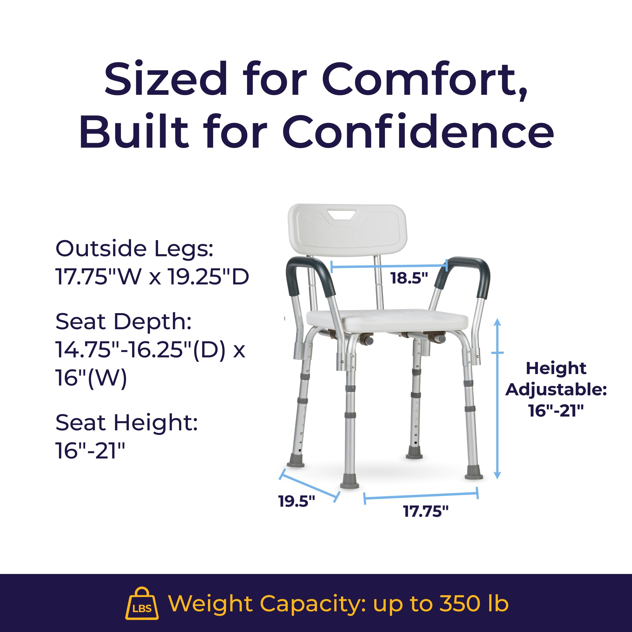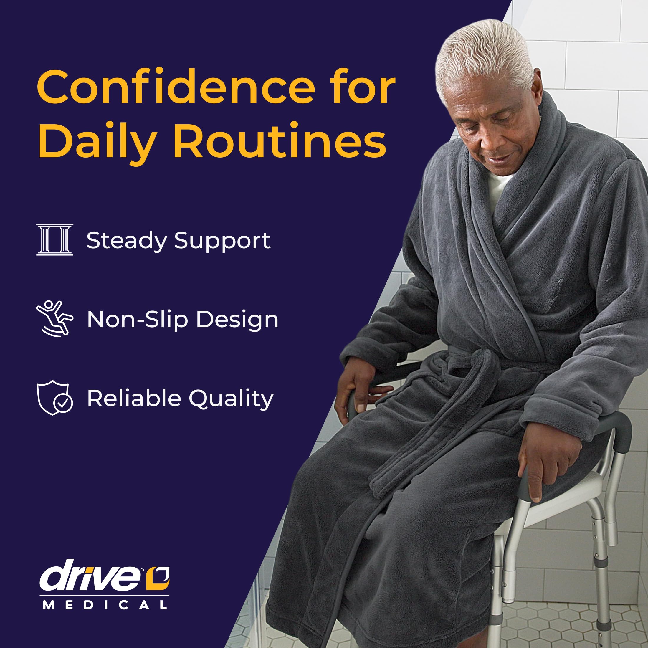 The Drive Medical Shower Chair with Back and Padded Arms is designed to provide dependable safety, comfort, and stability for users who need support while bathing. Whether recovering from surgery, managing mobility challenges, or simply seeking added confidence in the shower, this adjustable-height bath chair offers a secure seating solution that enhances independence and reduces the risk of slips or falls. Featuring a comfortable contoured backrest and padded armrests, the chair provides stable support during entry, exit, and bathing, helping users maintain balance and prevent strain. Constructed from lightweight yet strong aluminum, the chair resists rust and corrosion to ensure long-term reliability in wet environments. At only 10 lb, it is easy to lift, reposition, or move between bathroom spaces without difficulty. Rubber feet provide consistent traction on wet surfaces, while the seat’s drainage holes prevent water from pooling, keeping the seating area safer and more comfortable. The adjustable legs lock securely into place in 1-inch increments, allowing users to personalize the chair height for proper posture and easier transfers. For additional customization, both the padded arms and backrest can be removed as needed, giving users the option of a simplified bath stool or a more supportive chair depending on their mobility needs. Since 2000, Drive Medical has proudly manufactured trusted medical equipment and homecare products that are used in homes and hospitals across the globe. We offer a wide range of products to support your family’s needs, from mobility to bath safety, from patient care to personal care. Our mission is simple: to enhance the lives of our customers with products that support safety, independence, and comfort. When you shop from Drive Medical, you’ll find unmatched quality, cutting-edge innovation, and products designed in partnership with clinical experts.