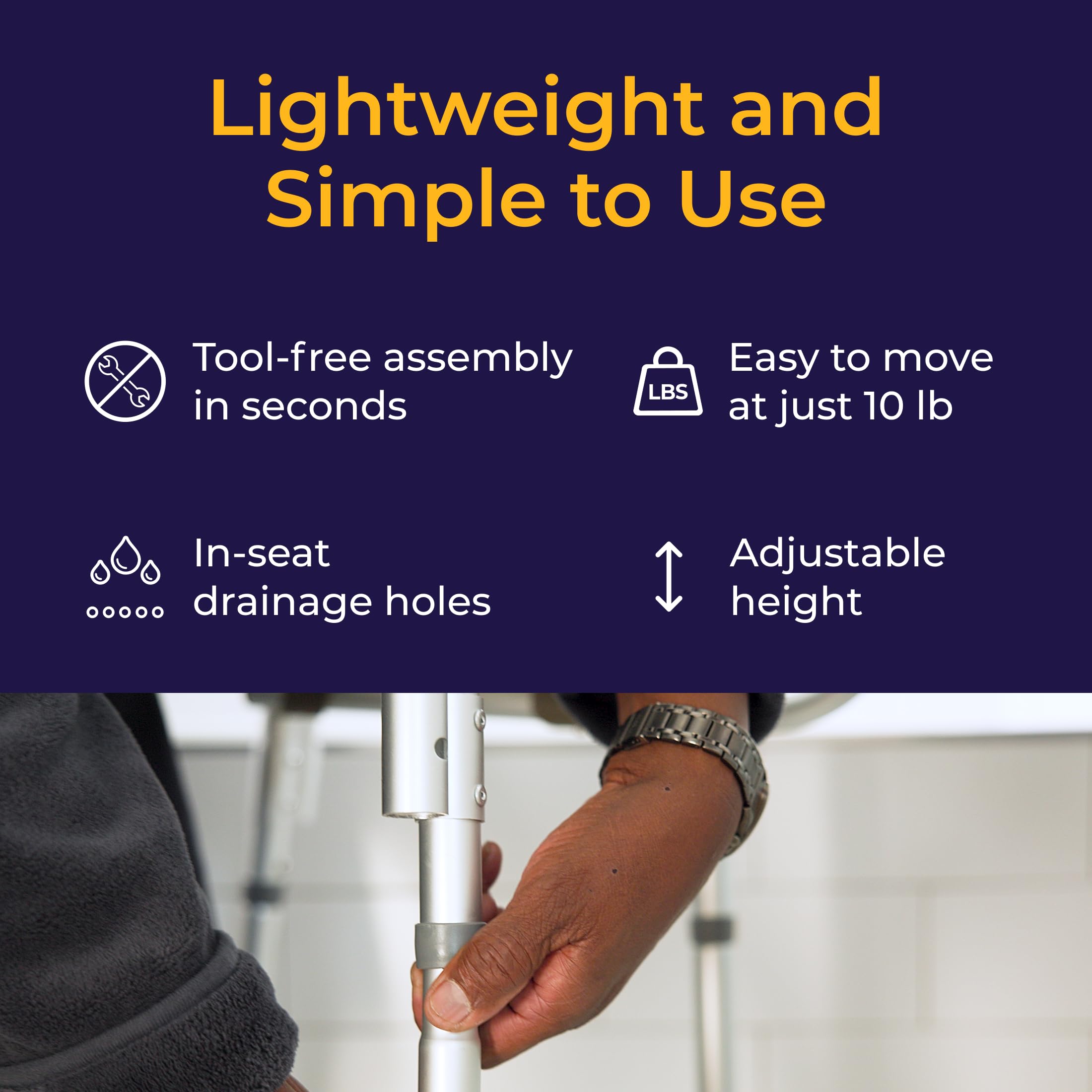 Made to Last: Constructed from aluminum, this lightweight 10 lb shower bench moves easily between tub and storage while offering durable stability and simple, tool-free assembly