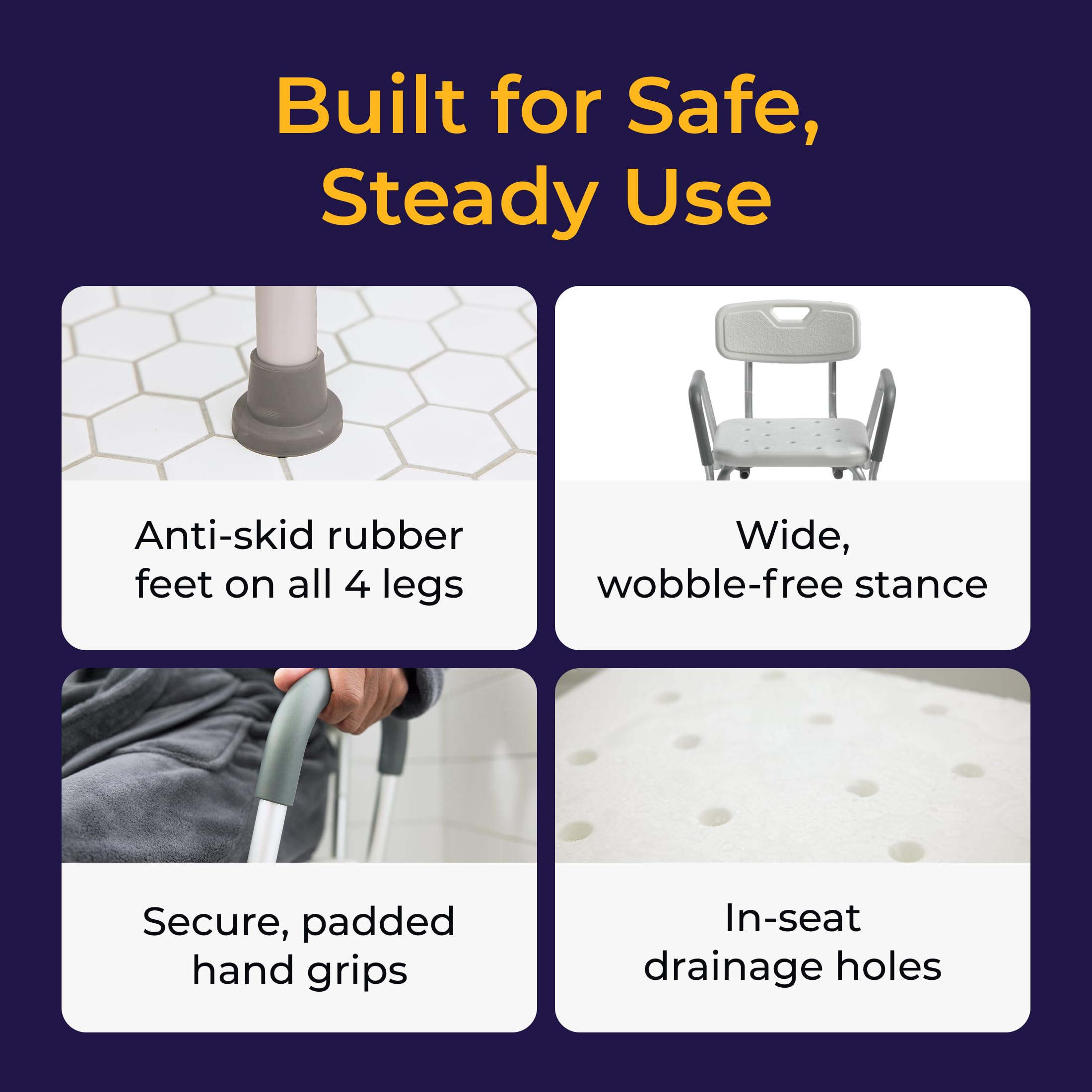 Help Reduce Risk of Falls: Designed to support safety while showering, this bath seat includes rubber feet for dependable grip and drainage holes that minimize water pooling