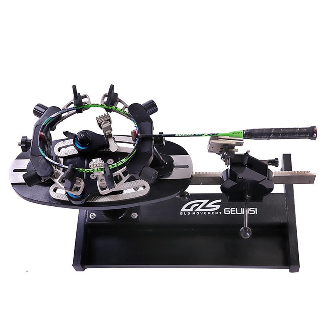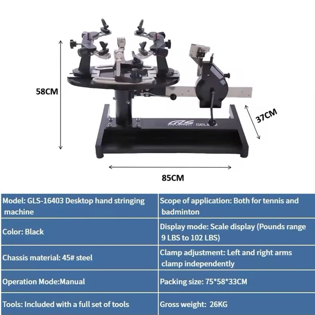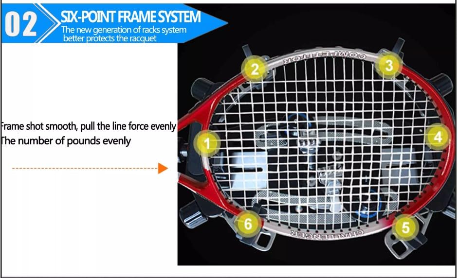 1. Application: Badminton/Tennis Racket. 2. Pounds Range: 9-102 LB / 4-46 KG 3. Racket Holding: 6 Points Synchronous Holding System (6 K-clamps), 4 Fixing Arm 4. Stringing Clamp: Anti-skip 5-teeth Clamps 5. 360° Rotating Plate with Brake 1.3-2.1M Adustment. 6. Net Weight: 28kg 7. Product Size: 85*37*58cm 8. Packing Size: 75*58*32cm 9. Tools: Included with a full set of tools.