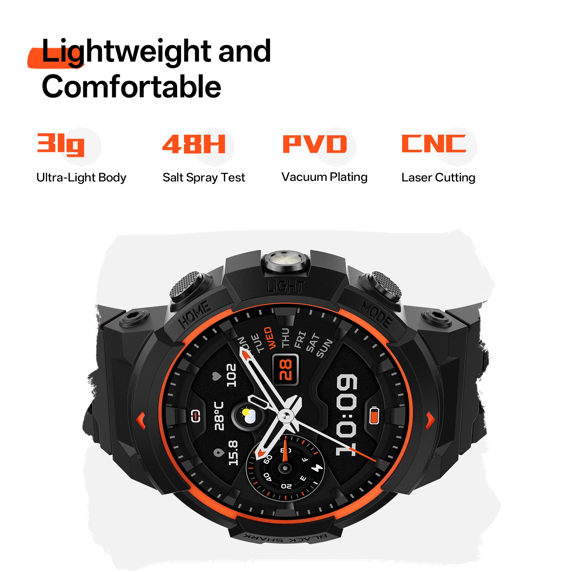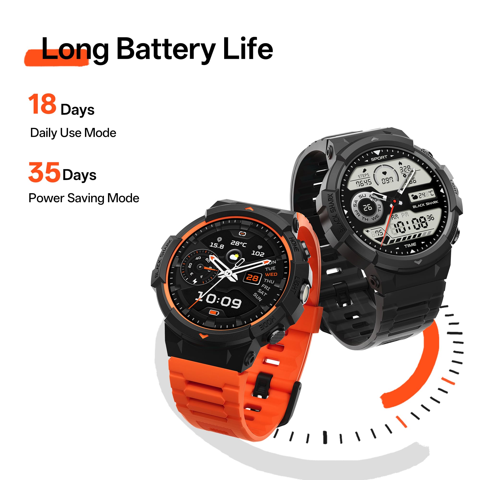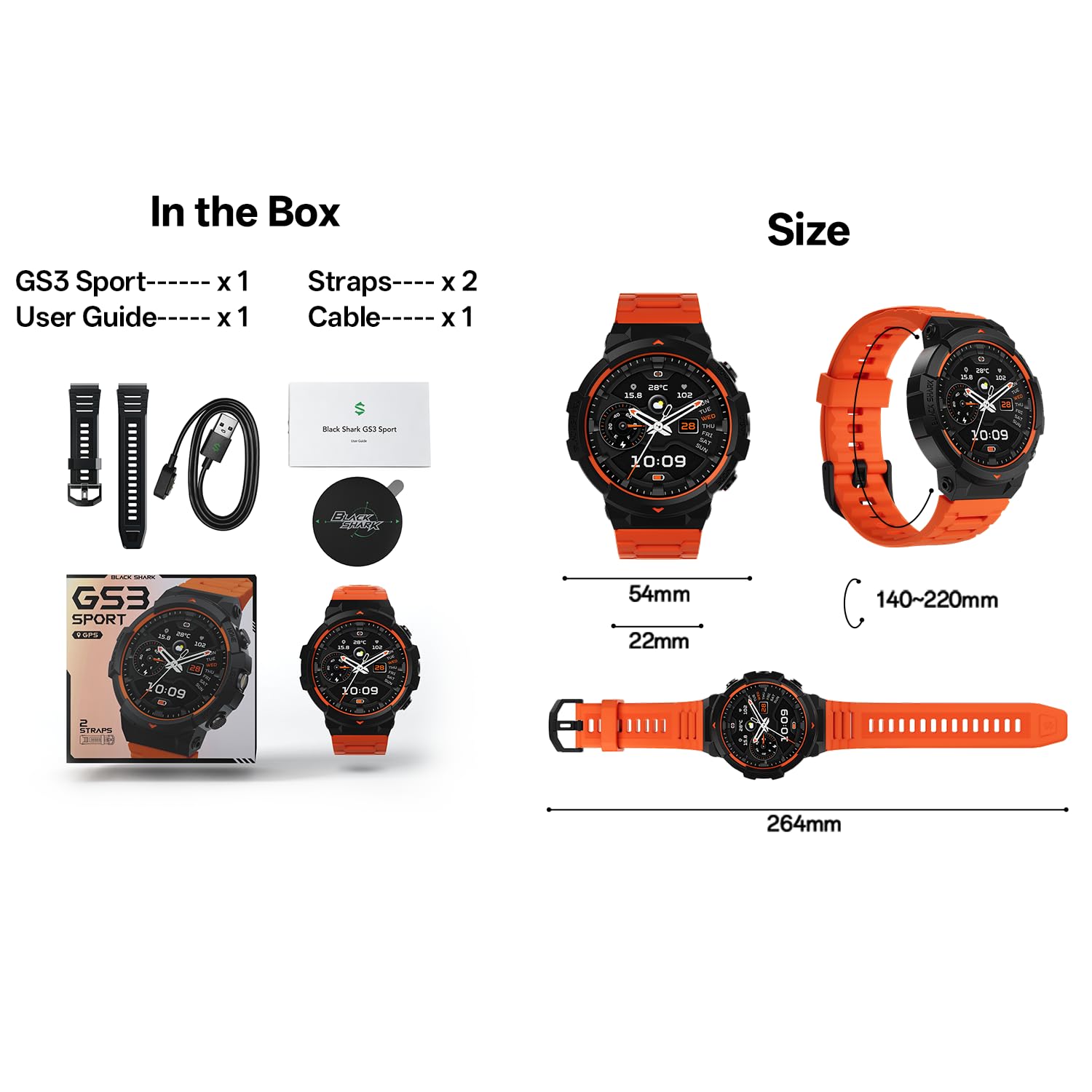"Black Shark GS3 Sport Smartwatch – Rugged Design, AMOLED Display, 10-Day Battery, GPS Satellite Positioning, 100+ Watch Faces, 100+ Sports Modes, 5ATM Water Resistant, 24/7 Health Tracking Tackle every adventure with the Black Shark GS3 Sport – built for the bold. Featuring a vibrant AMOLED display, 5ATM water resistance, and military-grade durability, it’s your perfect outdoor and everyday companion. With GPS satellite positioning, over 100 stylish watch faces and sports modes, and a long-lasting 10-day battery, the GS3 Sport blends performance with personality. Stay connected with ENC call clarity, monitor your health around the clock, and express yourself with bold color options like Lava Black and Fire Orange."