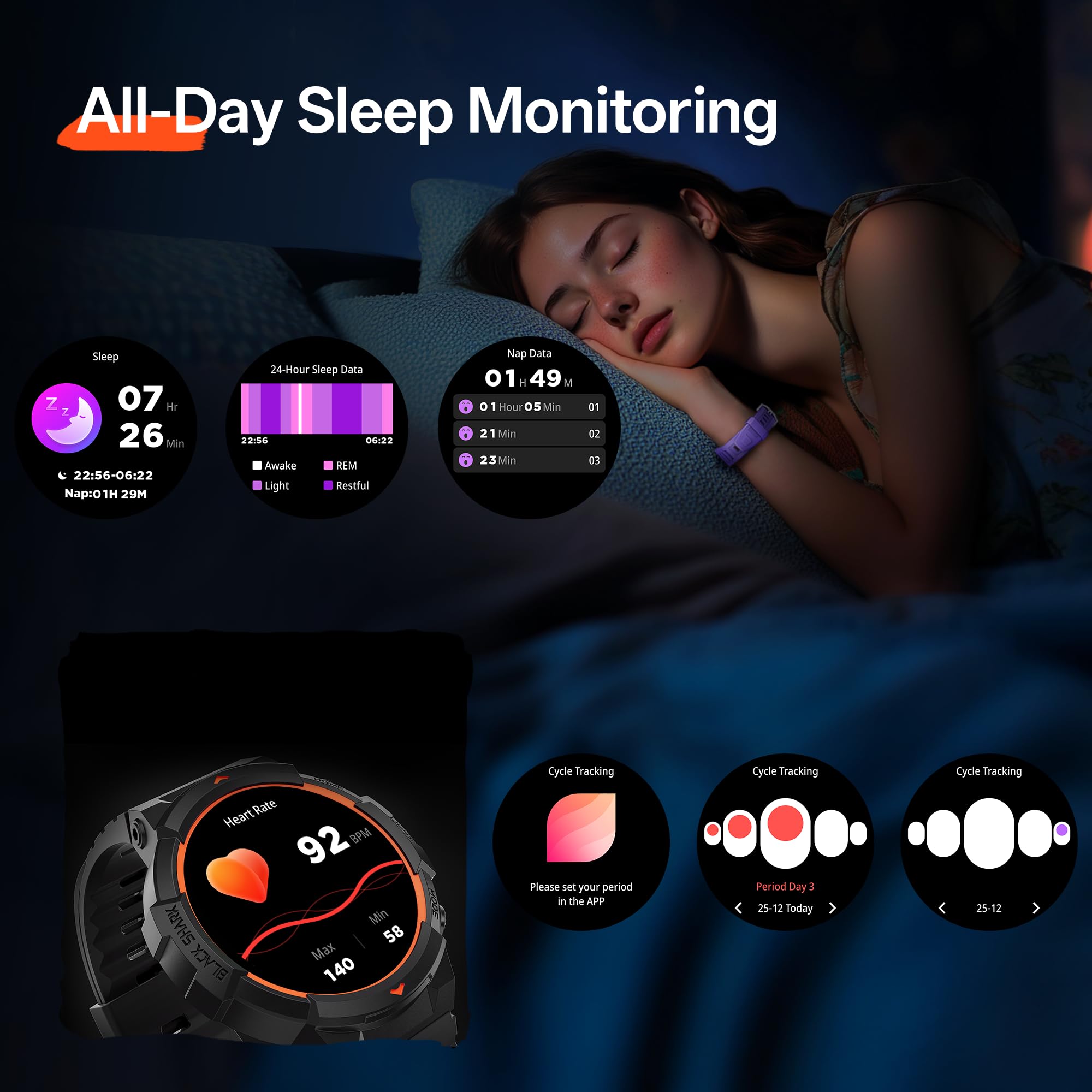 【All-Day Health Monitoring】Equipped with a high-precision sensor, smart watch stays on top of your health with 24/7 heart rate monitoring, blood oxygen tracking, stress monitoring, sleep analysis, and step counting. Plus, women's health management is available.