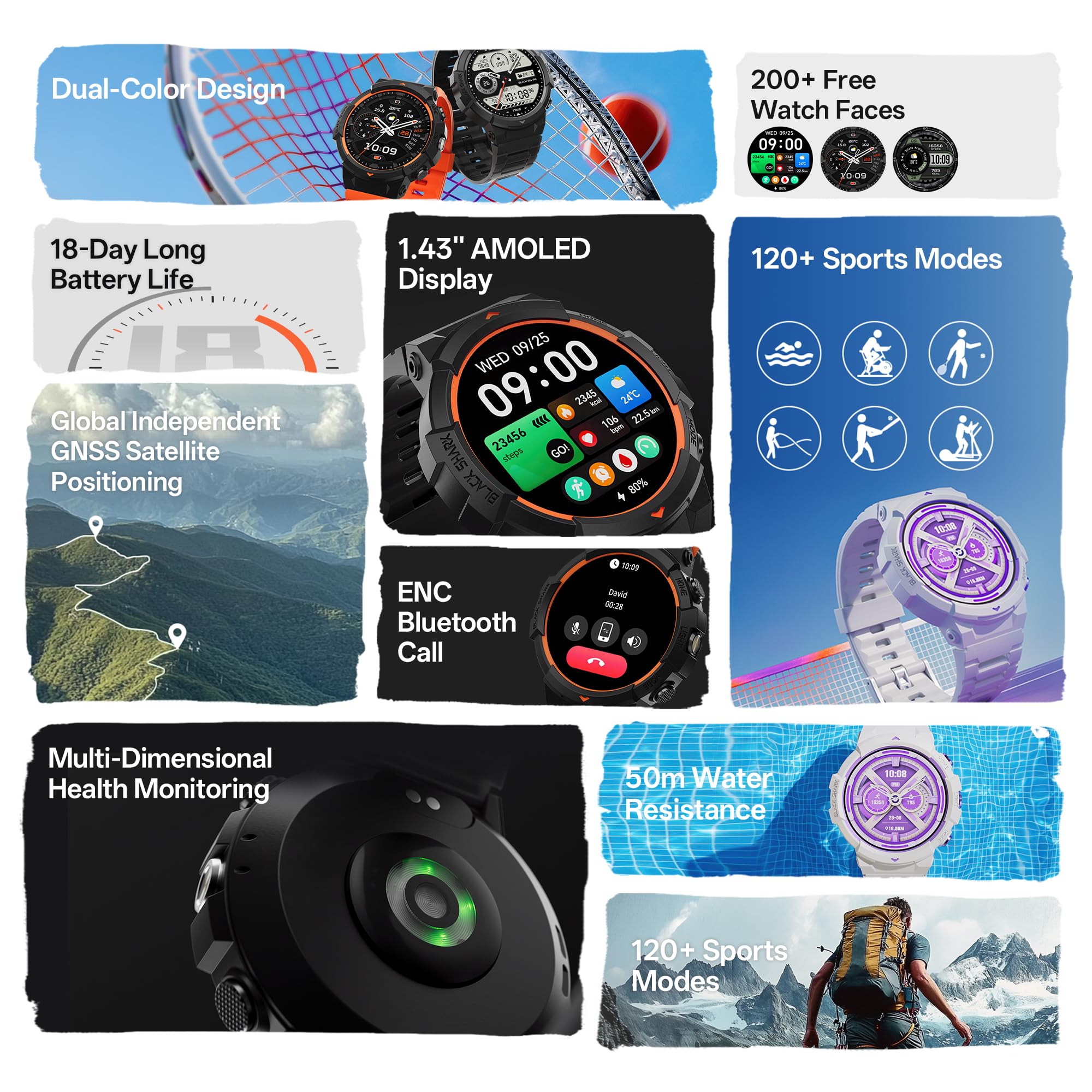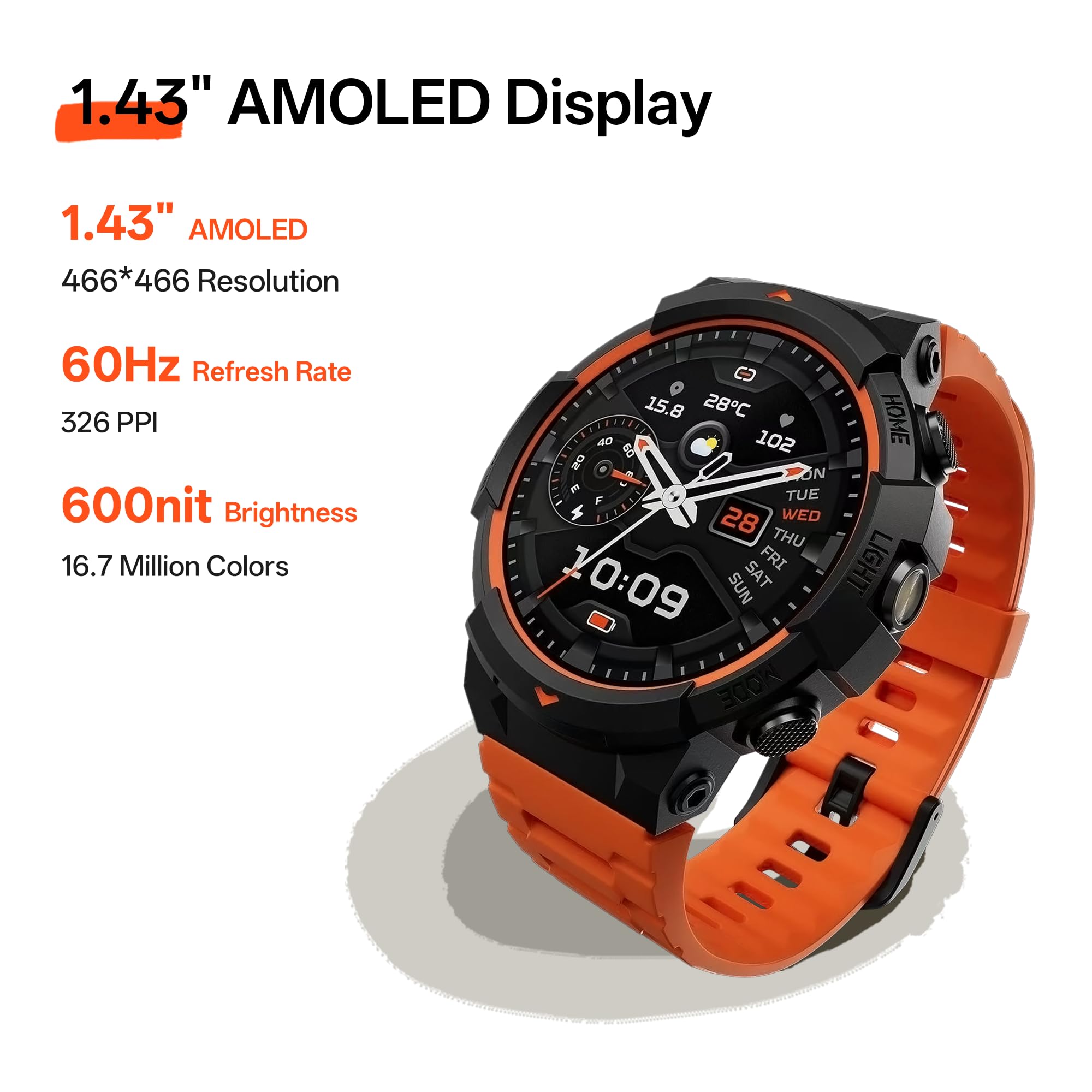 【Vibrant 1.43'' AMOLED Display】Enjoy a stunning 1.43" AMOLED screen with 466×466 resolution, 326 PPI, and up to 600 nits brightness for clear and vibrant visuals, even under bright sunlight. 60Hz refresh rate ensures ultra-smooth operation.