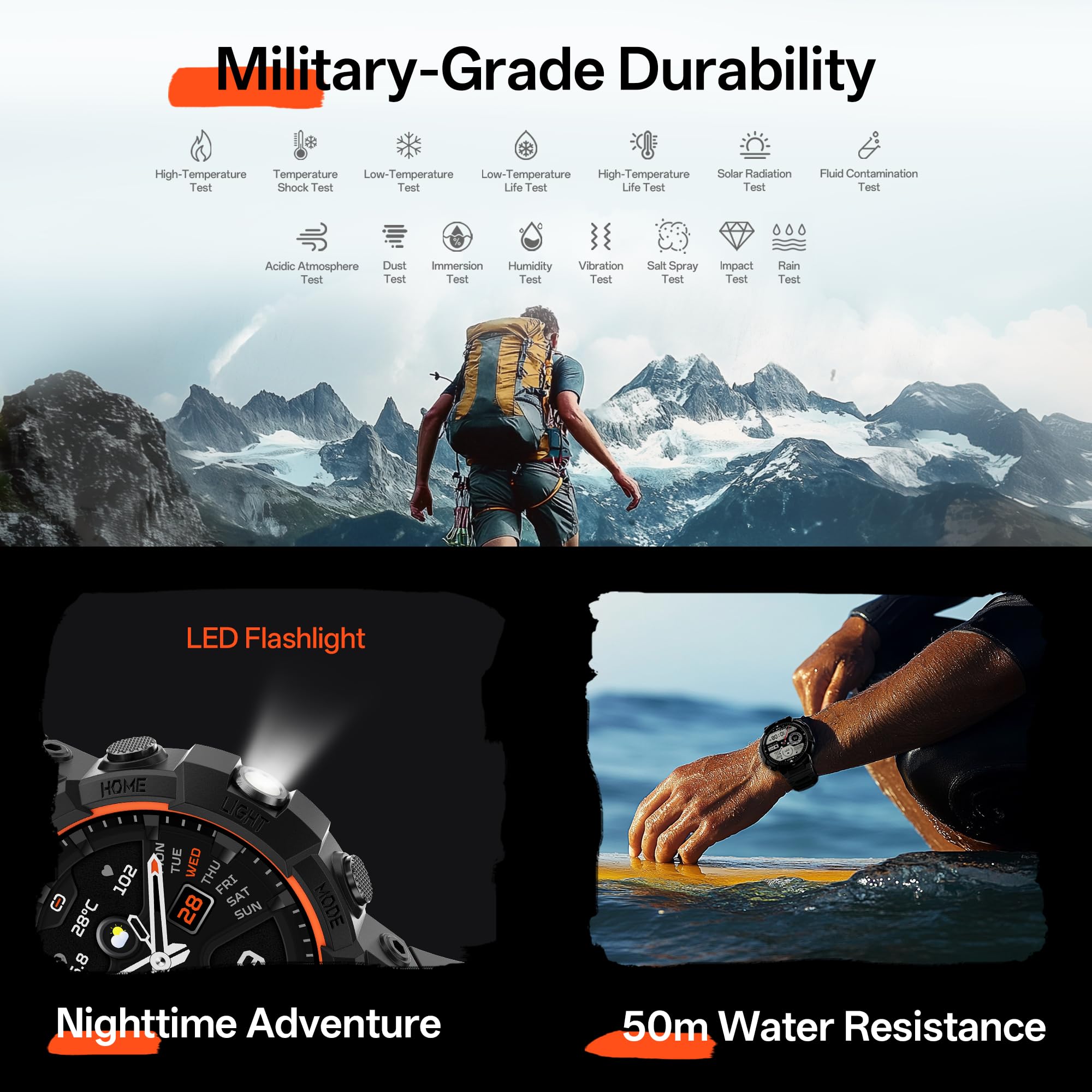 【Military-Grade Durability】GS3 Sport smartwatch features 50m Water Resistance and a rugged PC+TPU dual-color injection shell with Panda Glass, and built-in LED flashlight on the side, making it ideal for swimming, hiking, outdoor adventures even extreme conditions.