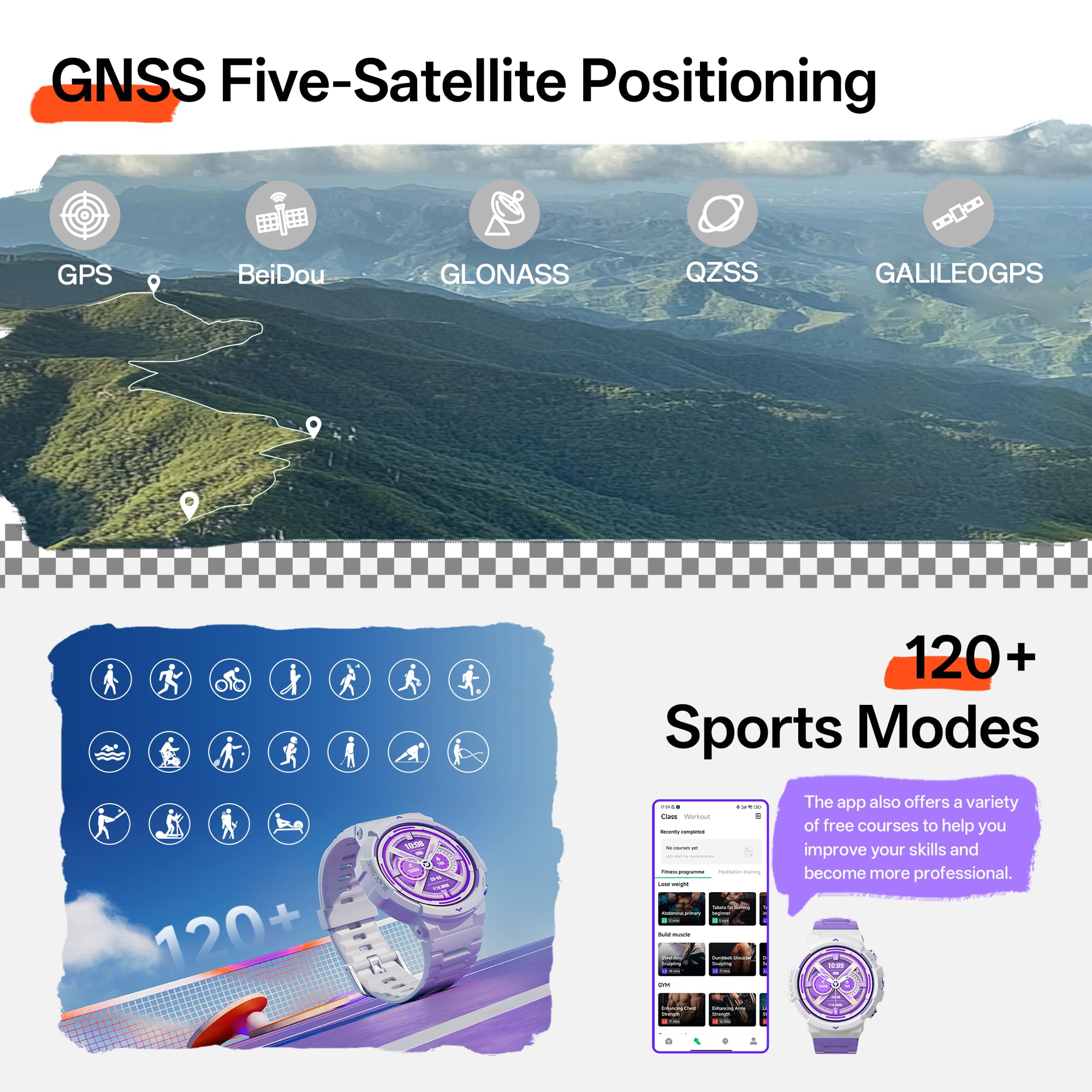 【120+ Sports Modes with GPS Tracking】Track your workouts precisely with over 120 sports modes and 5 professional GPS sport modes. Equipped with an independent GNSS chip, watch records your movement paths and fitness data accurately, whether running, hiking, or cycling.