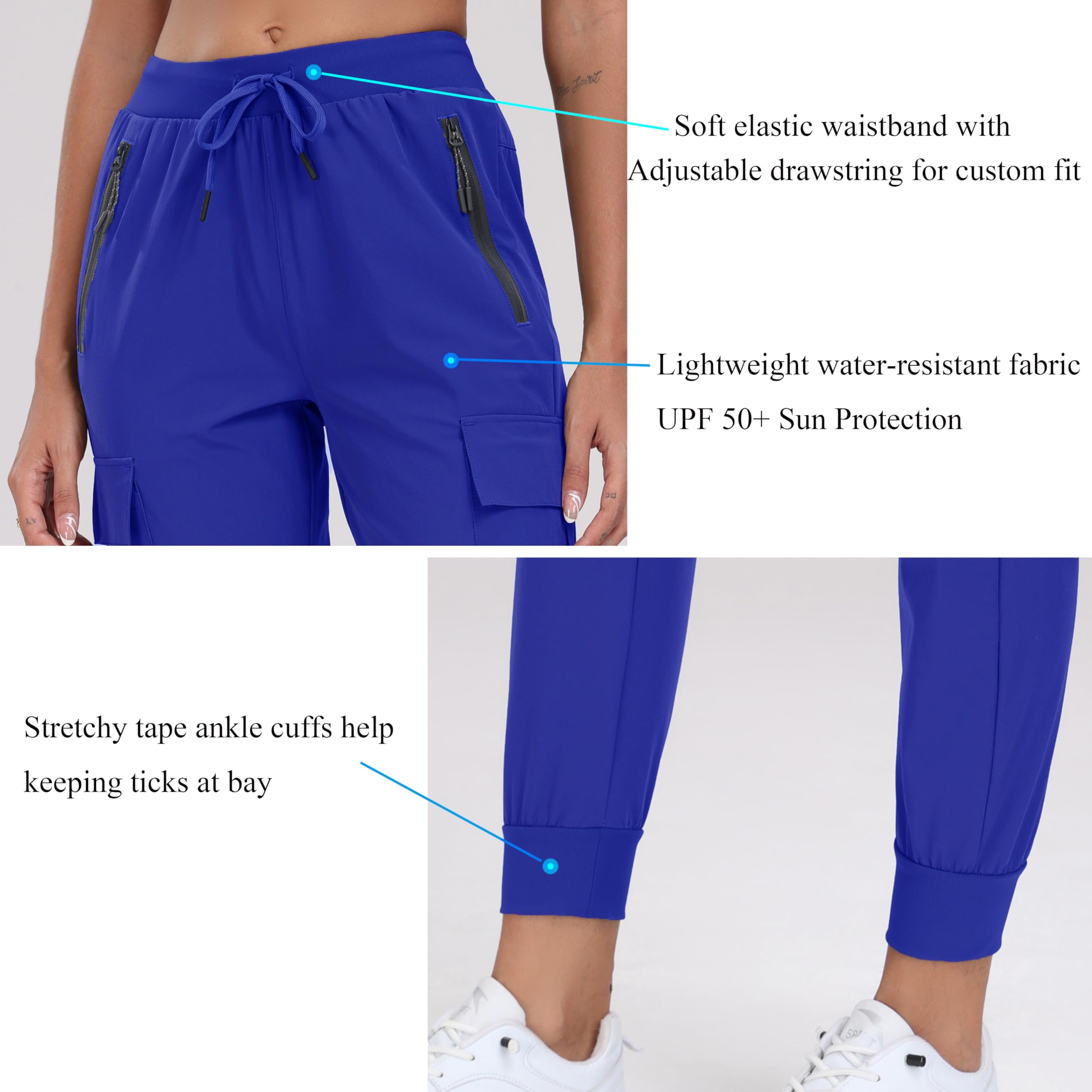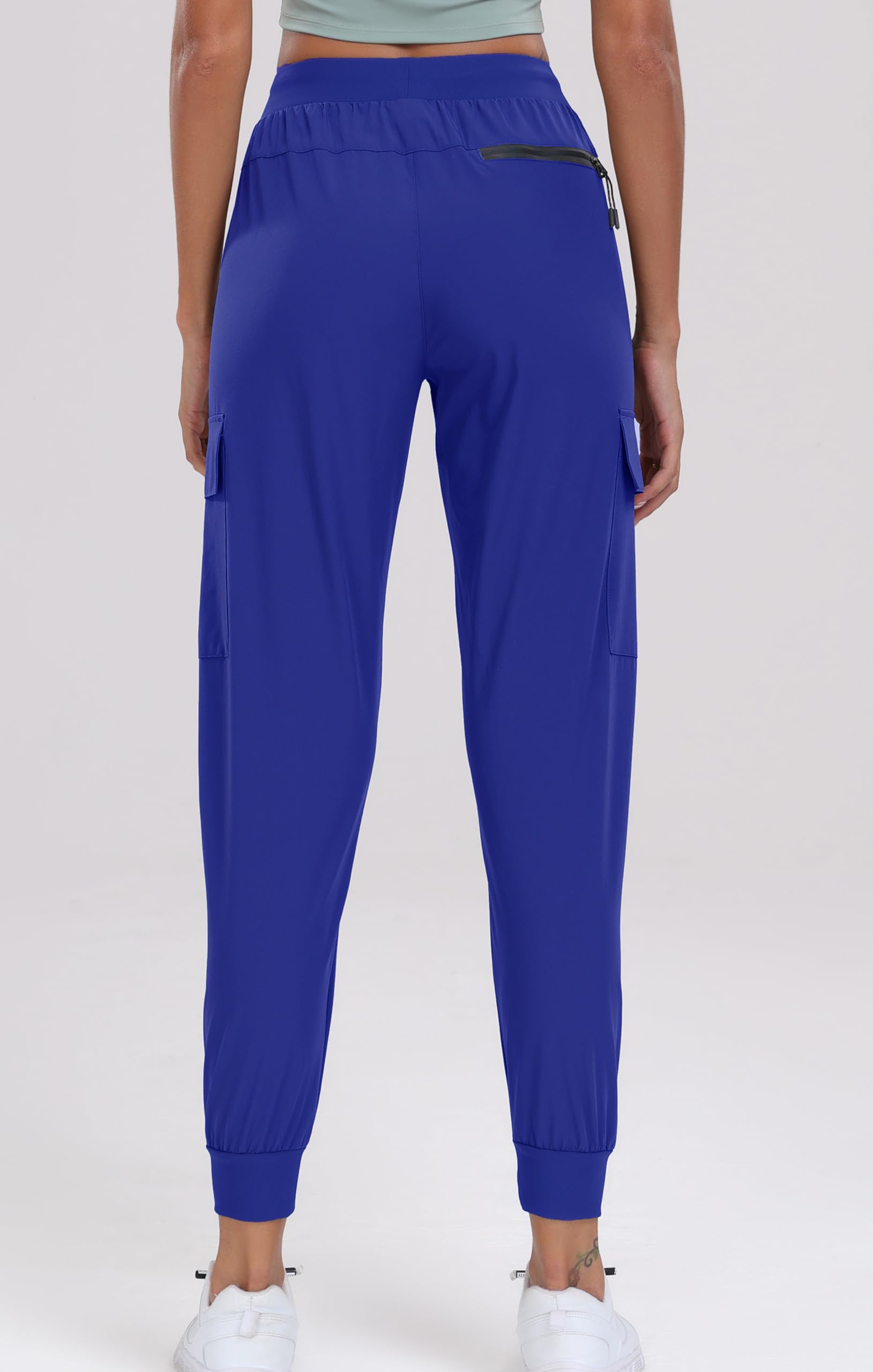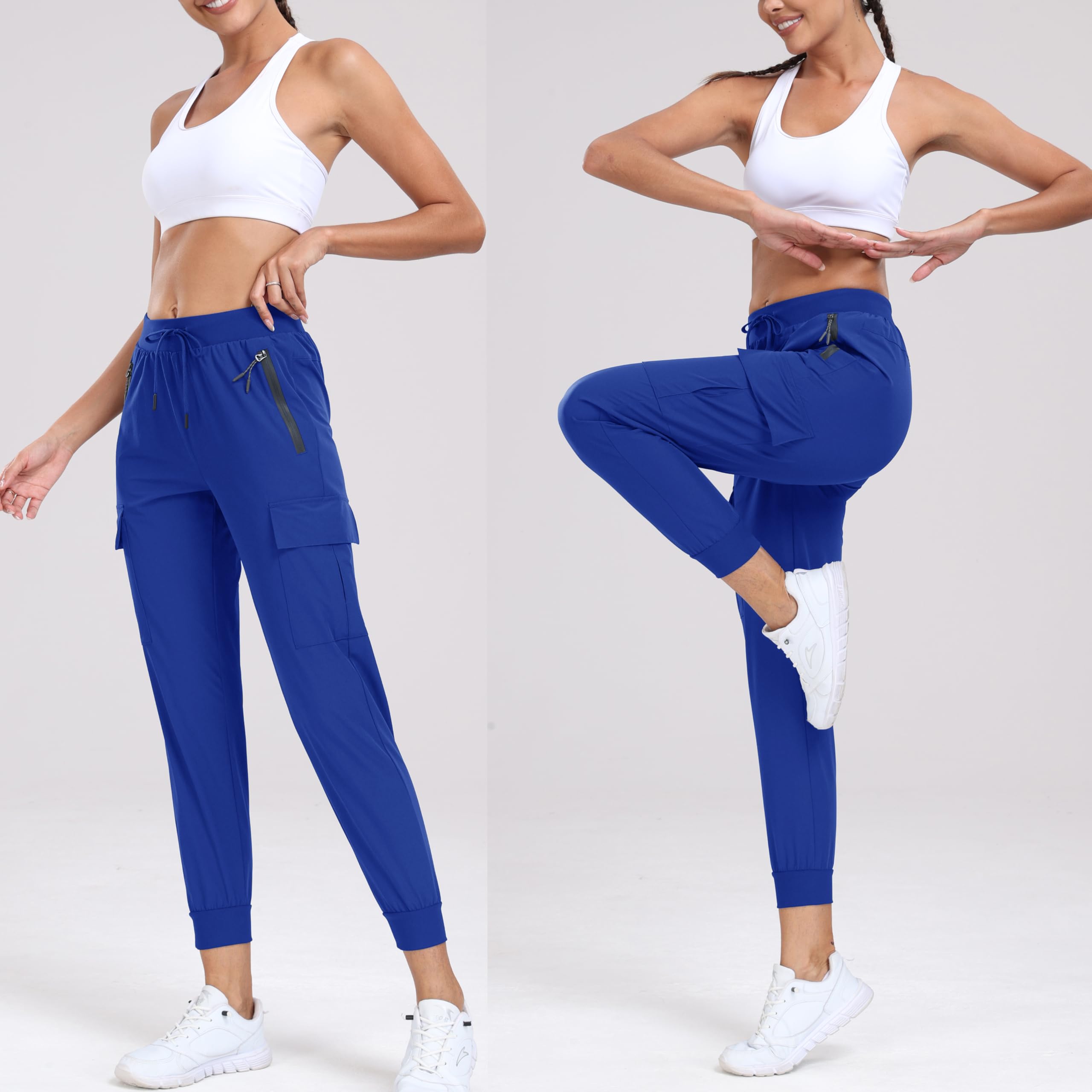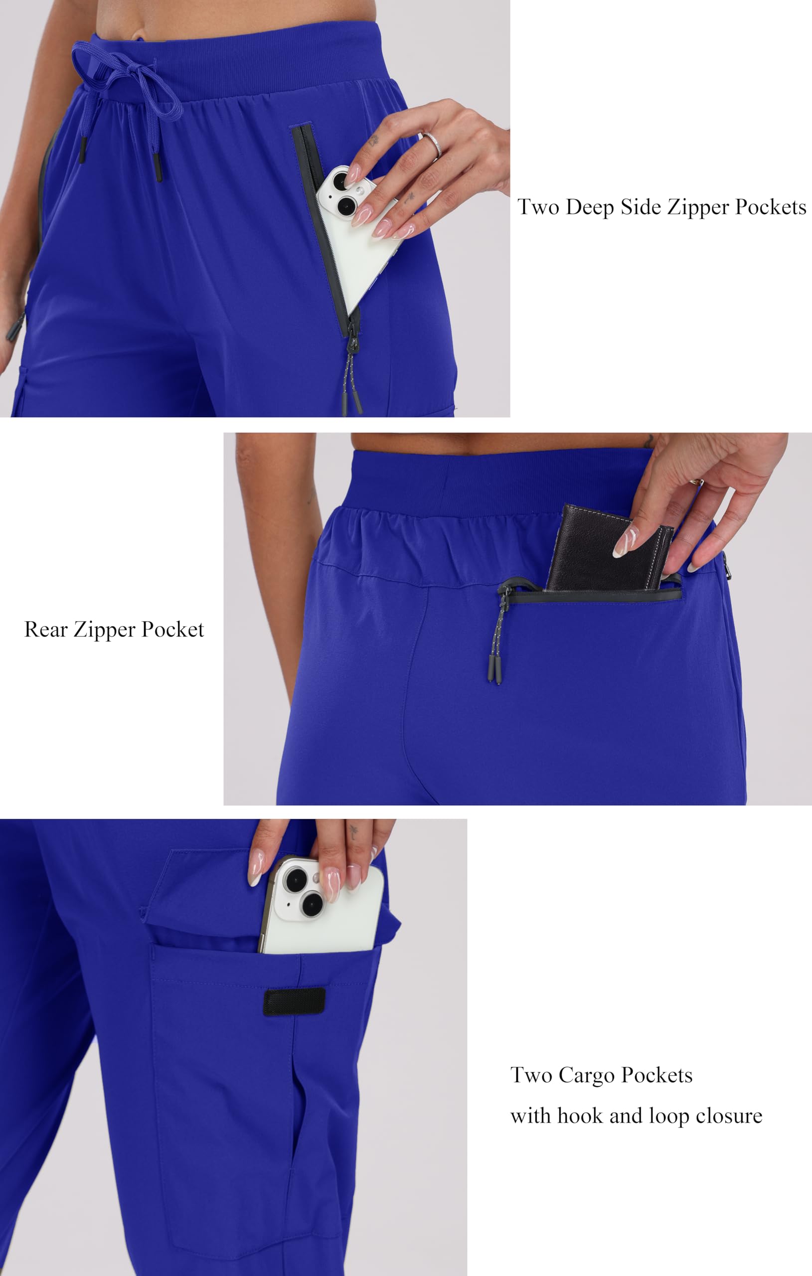 Multiple deep pockets--cargo joggers have 5 pockets include 2 large front hand zip pockets, 2 thigh cargo pockets about 7" deep with hook-and-loop closure, 1 roomy rear zipper pocket.Easily carry a phone, headphone case, passport, tools or more essentials in the pockets.Keep your hands free on a hike, travel, even work in the garden.