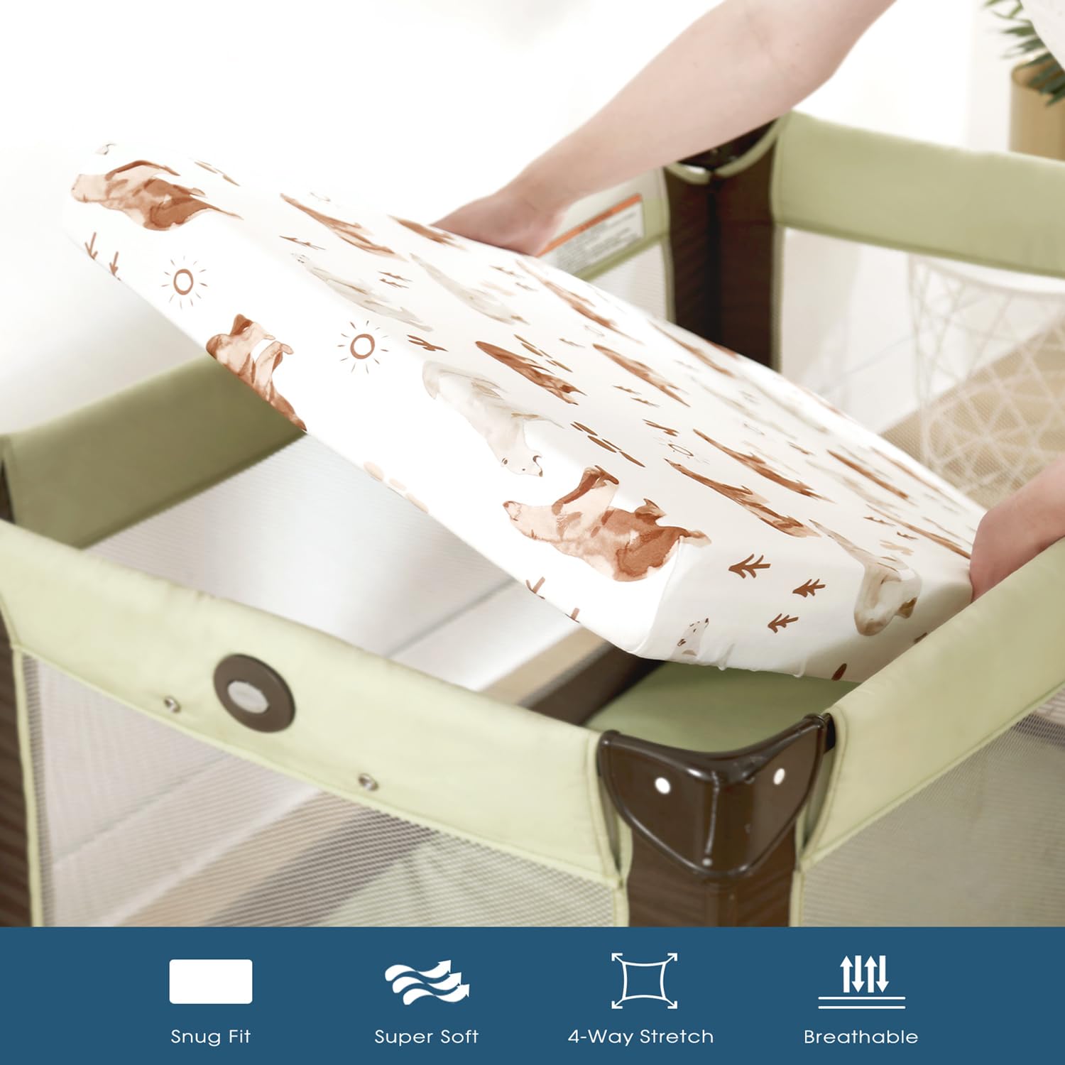 Universal Fit – Measuring 38" x 24" x 6". Our mini baby crib sheets come with an elastic band all around the sides to securely fit all standard pack n play mattresses. They are very easy to put in place even when you need to change pack n play mattresses sheets in a hurry. Perfect as a baby shower gift or for your own nursery.
