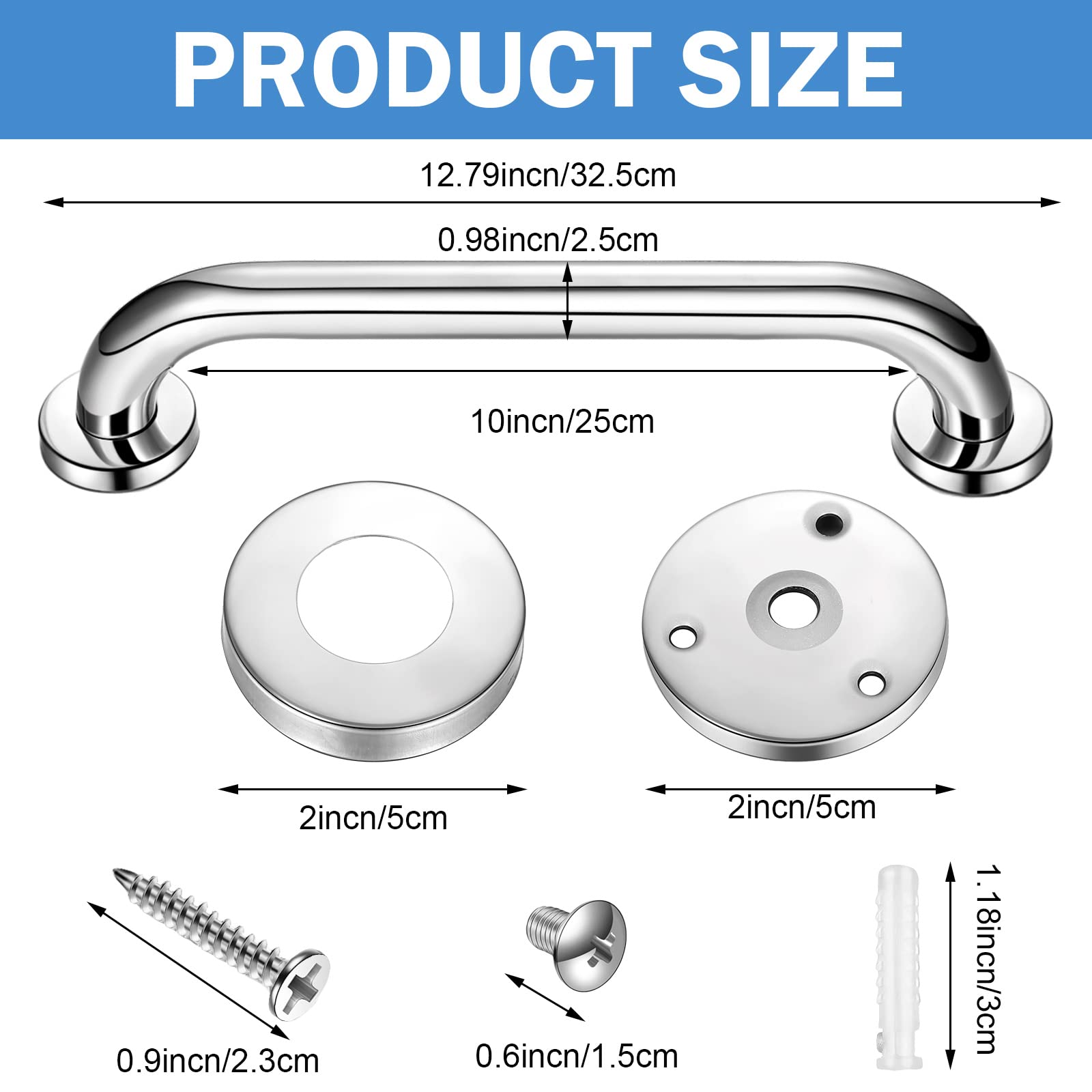 Adequate Package: you will get 6 pcs grab bars for bathtubs and showers, the total length is about 12.79 inches/ 32.5 cm, the tube length is about 12 inches/ 30 cm, and the diameter is about 0.98 inches/ 2.5 cm, comfortable to hold and sufficient for daily uses
