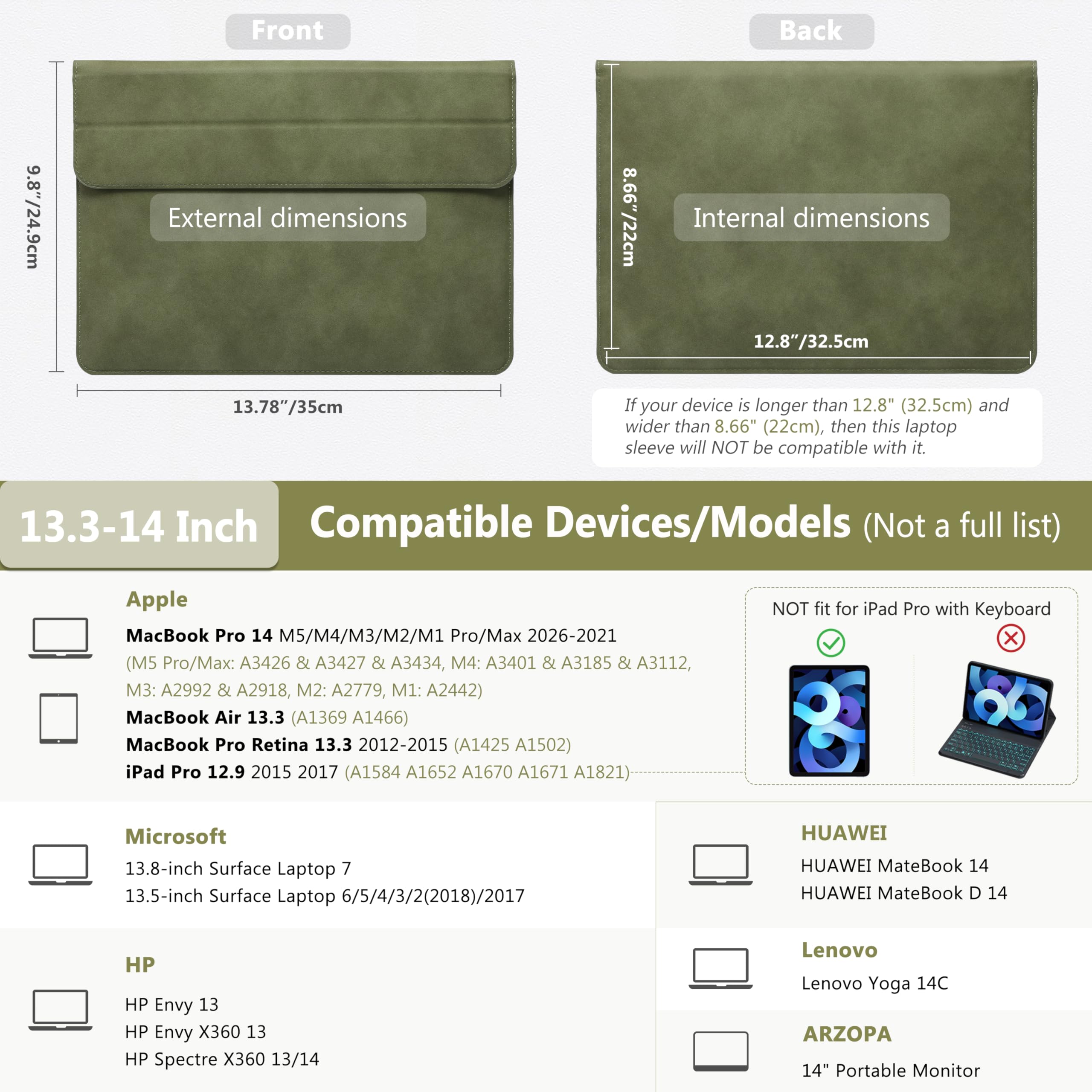 Internal Dimensions: 12.8" x 8.66" (32.5 cm x 22 cm). Compatible with 2026-2021 MacBook Pro 14 M5/M4/M3/M2/M1 Pro/Max (A3426, A3427, A3434, A3401, A3185, A3112, A2992, A2918, A2779, A2442), 13.8"/13.5" Surface Laptop 7/6/5/4/3/2 (2018)/2017, MacBook Air 13 2012-2017(A1369, A1466), MacBook Pro 13 2012-2015(A1425, A1502), iPad Pro 12.9-inch 2nd/1st Gen. 2017 2015, HP Envy 13, HP Envy X360 13, HP Spectre X360 13/14, Huawei MateBook 14, Lenovo Yoga 14C, Lenovo Yoga 720/910/920, etc.