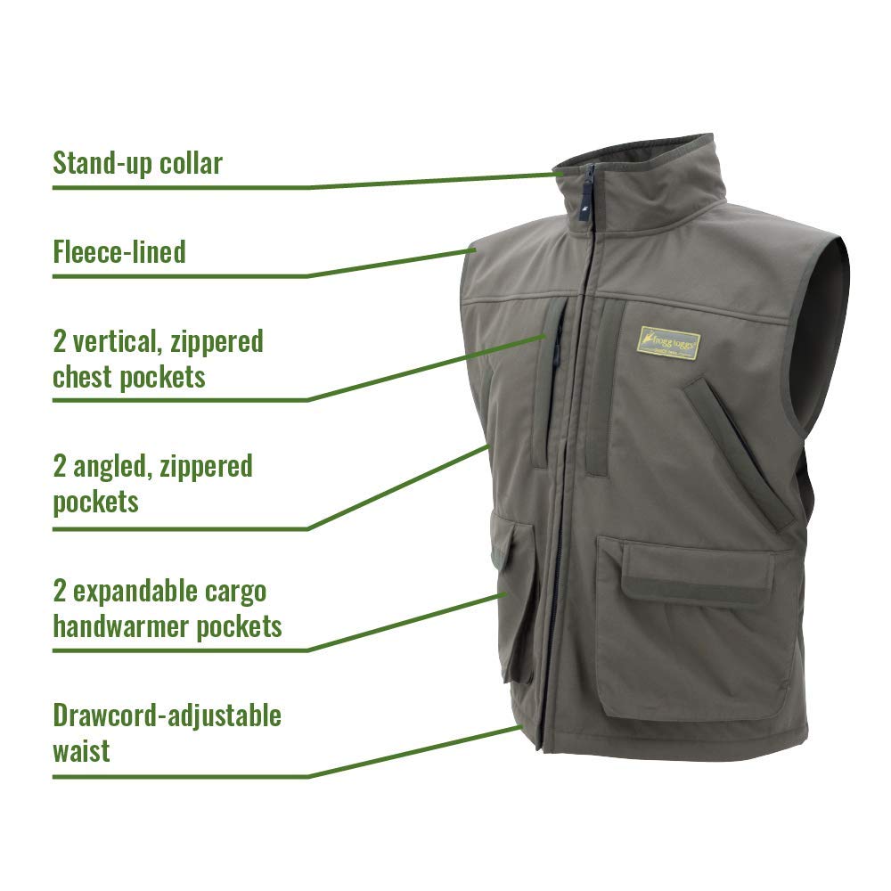 Description The Frogg Toggs Pilot Fleece Vest is a fleece-lined vest with stand-up collar. 2 vertical, zippered chest pockets and 2 expandable cargo pockets with flap/snap closures and drain holes with integrated handwarmer pockets provide ample storage. The drawcord-adjustable waist allows the wearer to achieve the perfect fit. The Pilot Fleece Vest is the perfect outdoor companion in the colder months!