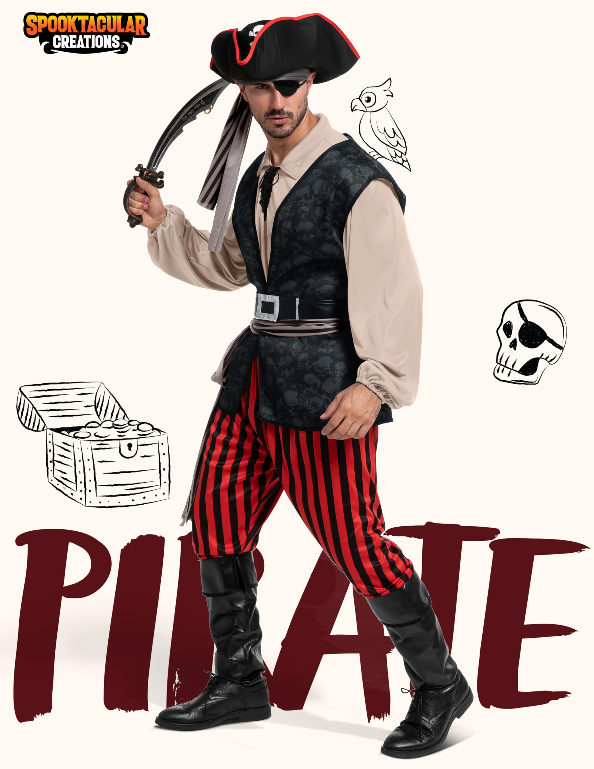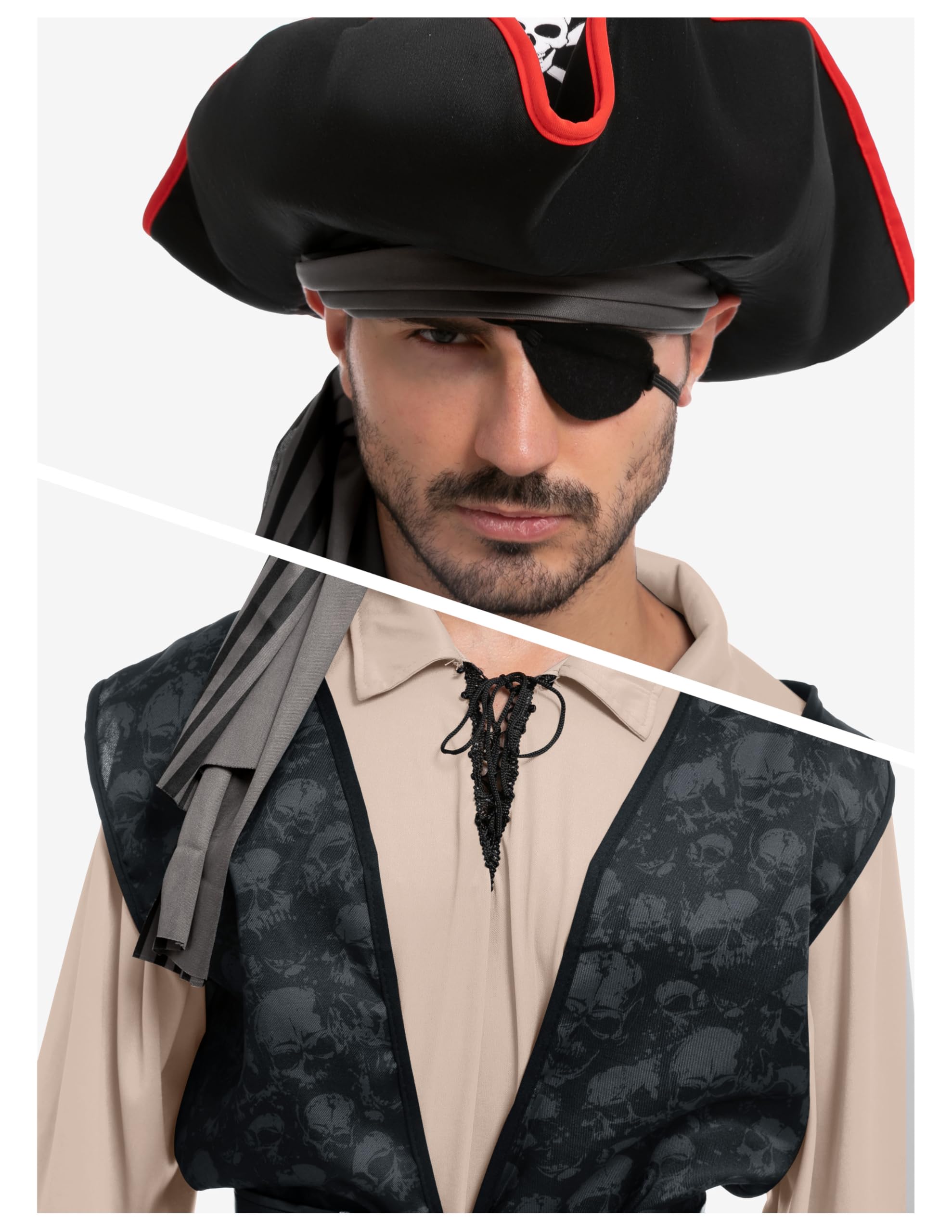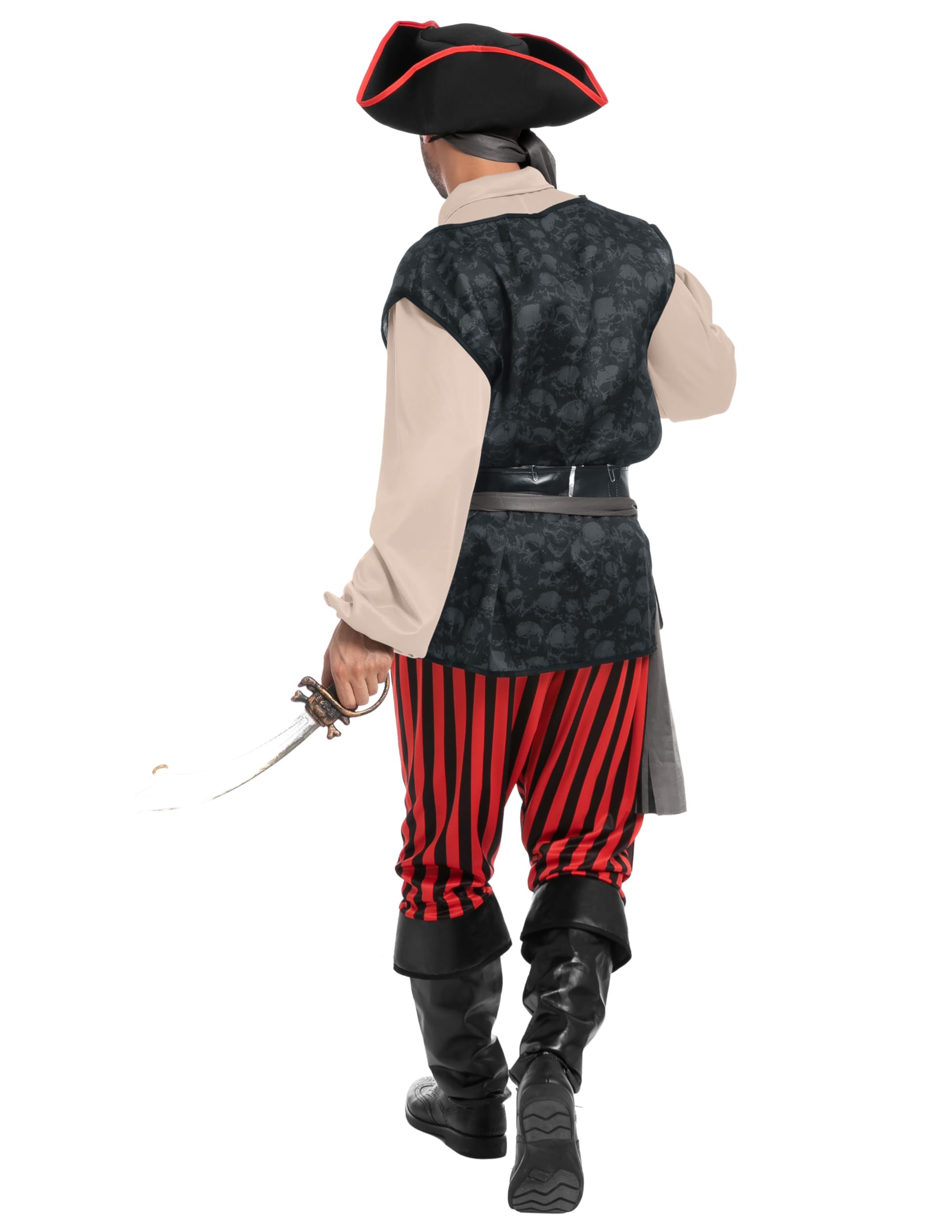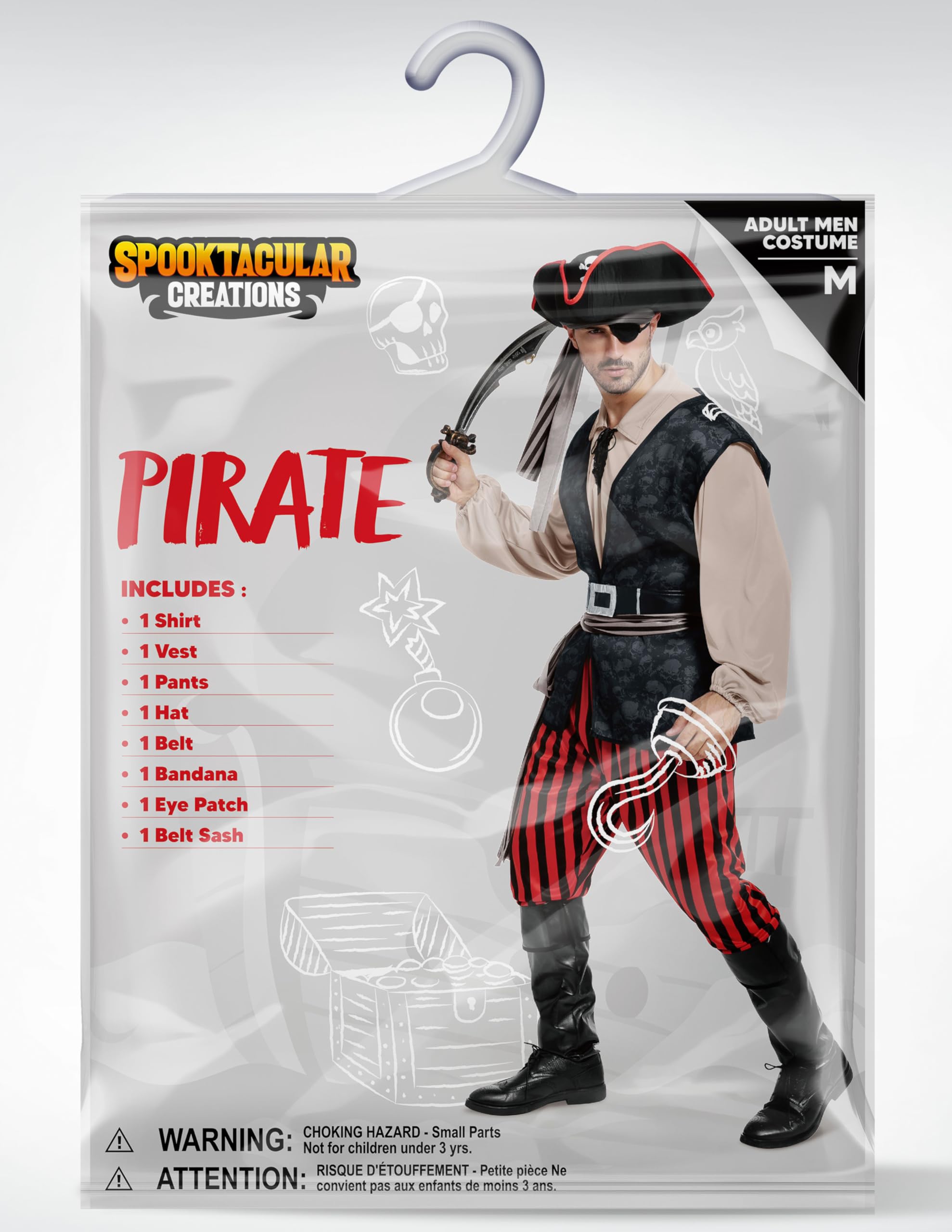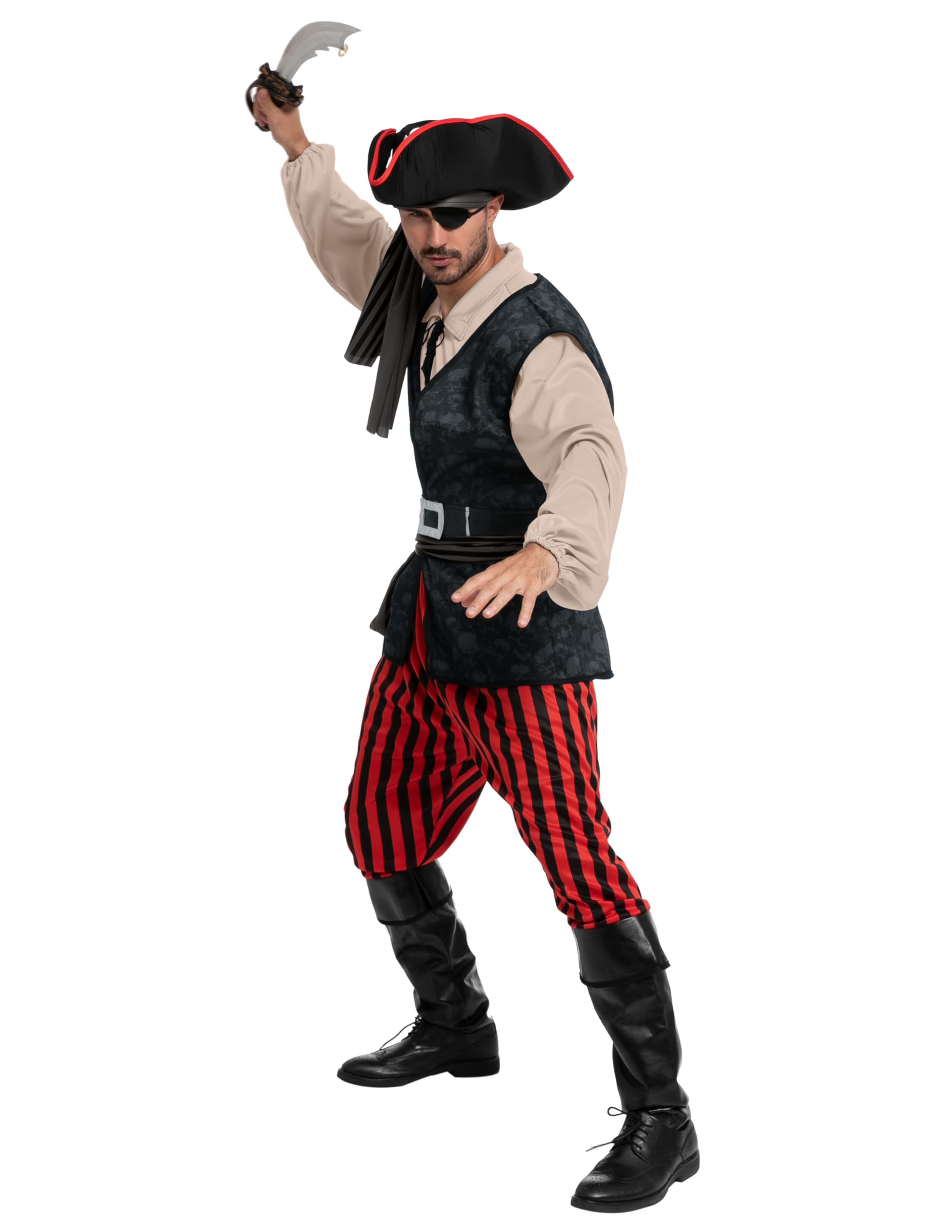 Set Includes: This pirate costume man Includes 1 pirate hat, 1 belt, 1 bandana, 1 eye patch, 1 belt sash, 1 Khaki pirate shirt, 1 pirate vest and 1 pair of pants