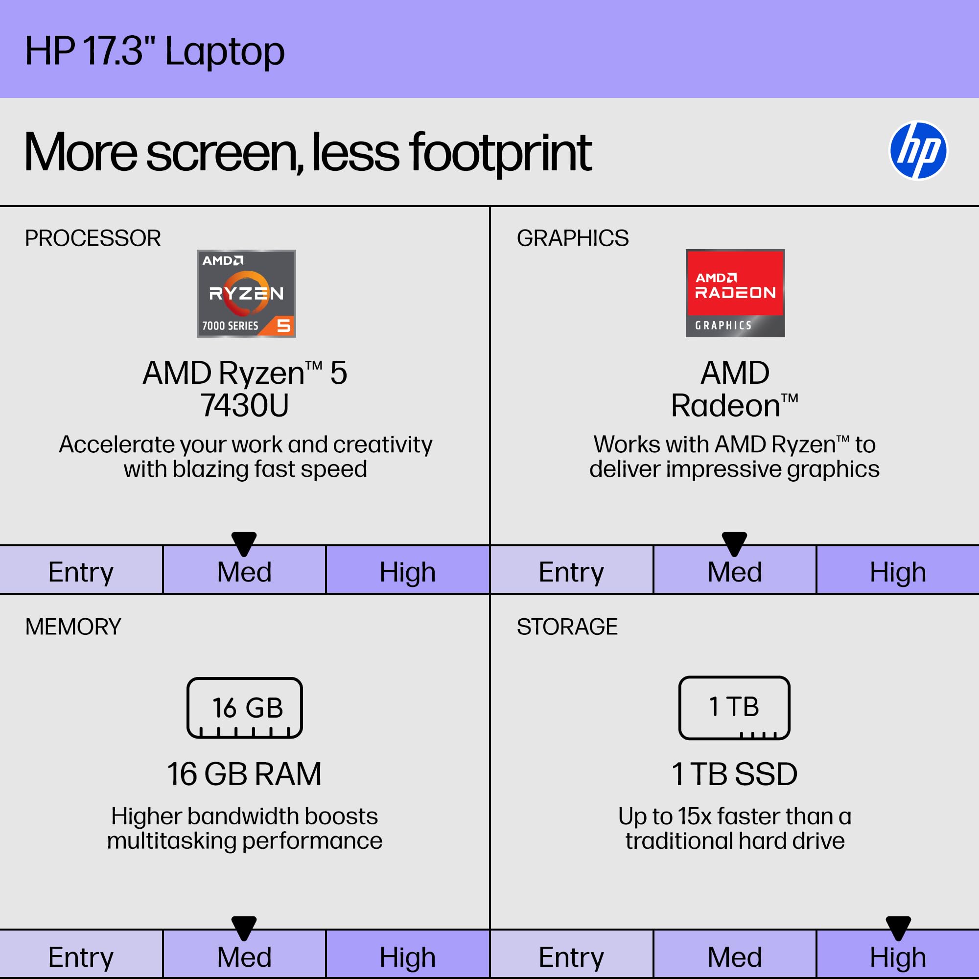 Processor & Memory: AMD Ryzen 5 7430U 6-Core 16 GB DDR4-3200 MT/s Drives: 1TB PCIe NVMe M.2 Solid State Drive No Optical Drive Operating System: Microsoft Windows 11 Home (64-bit) Communications: Wi-Fi 6 (2x2) and Bluetooth 5.4 wireless card HP True Vision 720p HD camera with temporal noise reduction and integrated dual array digital microphones HD Audio with stereo speakers Graphics & Video: 17.3-inch diagonal, HD+ (1600 x 900), touch, anti-glare, 250 nits, 60% NTSC AMD Radeon Graphics Audio: HD Audio with Stereo Speakers Keyboard: Full-size, soft grey keyboard with numeric keypad HP Imagepad Ports & Slots: 1 USB Type-C 5Gbps signaling rate 2 USB Type-A 5Gbps signaling rate 1x HDMI 1.4b 1x Headphone/Microphone Combination Jack 1 AC Smart pin Power Supply: 3-cell, 41 Wh Li-ion battery 45 W AC power adapter What's in the Box: Laptop Charger User Guide Additional Information: Dimensions: 15.78" W x 10.15" L x 0.81" H Approximate Weight: 4.82 lbs