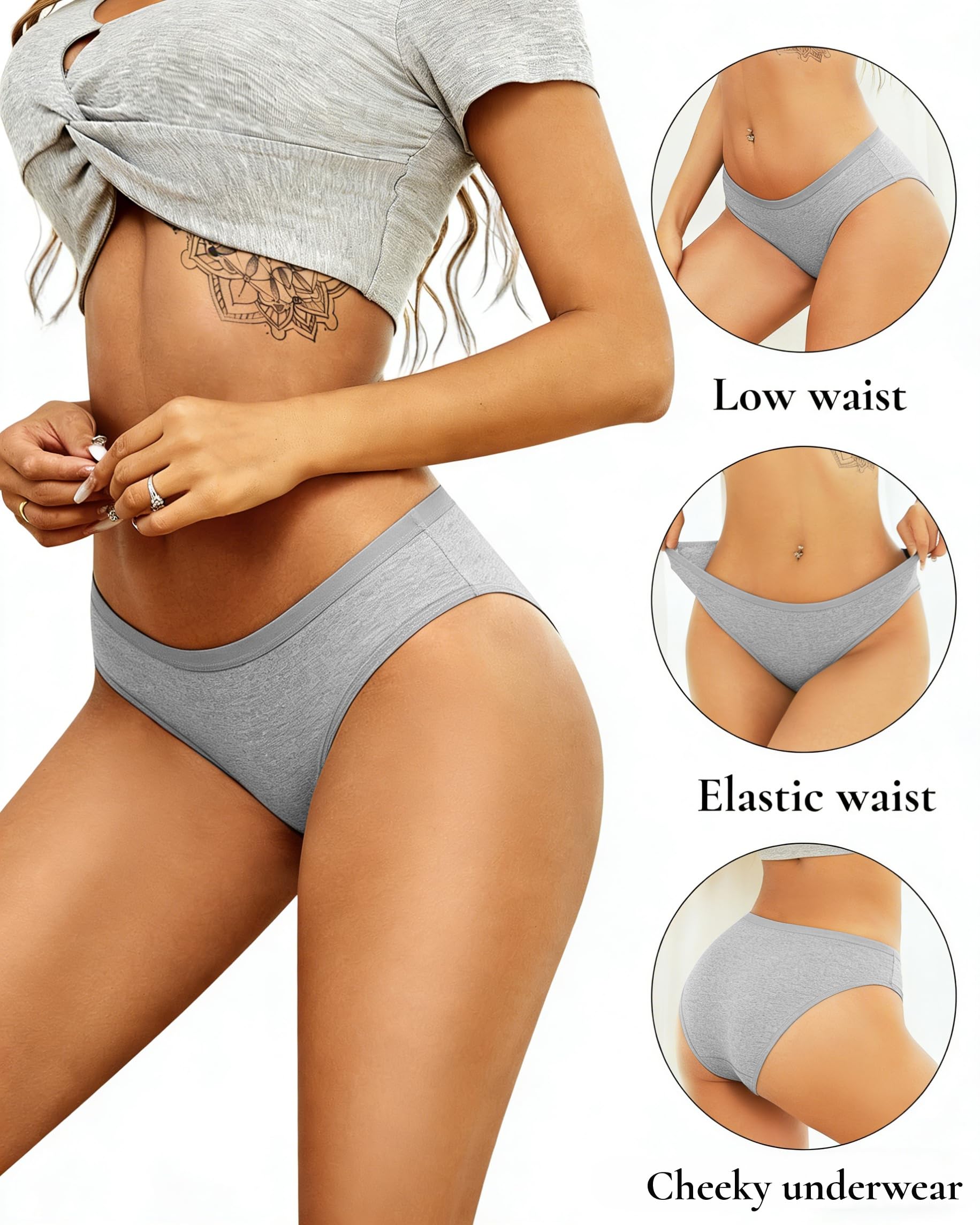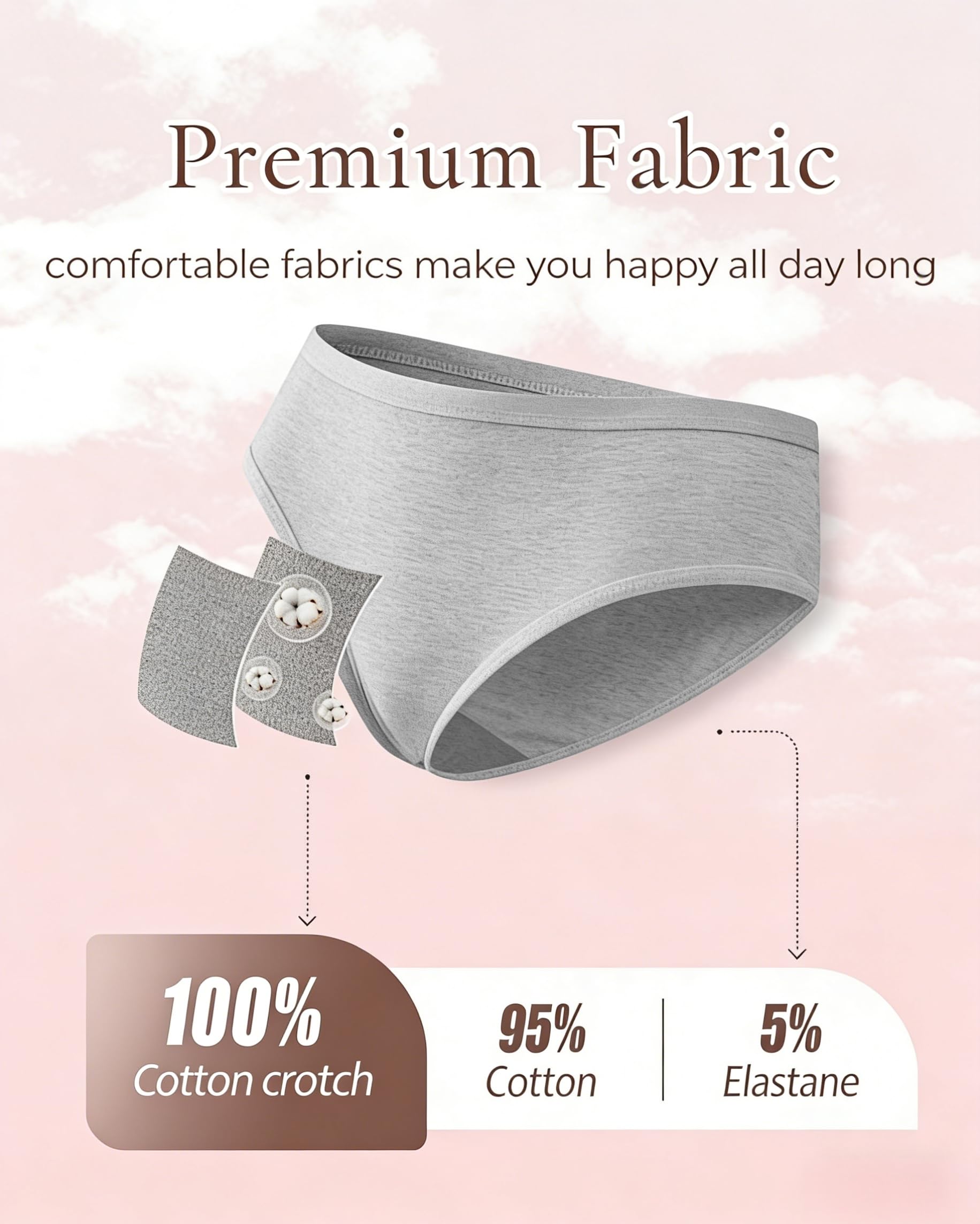 Fabric about cotton underwear women pack:These cotton women's underwear are made of 95% Cotton, 5% Elastane. In particular, the crotch is designed with a 100% premium cotton double layer, a detail that not only enhances the comfort of wearing, but also provides a purest, healthier care for your private parts. Each piece of fabric is carefully selected and combed to ensure optimal air permeability and moisture absorption, allowing your skin to breathe freely throughout the day.