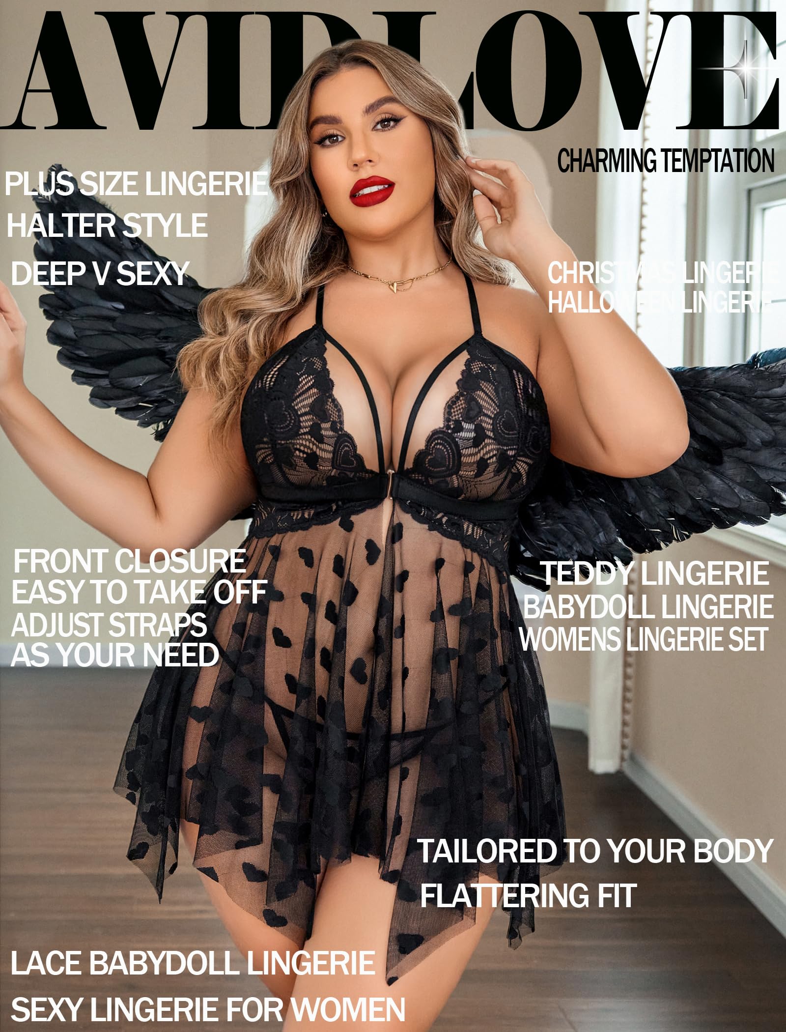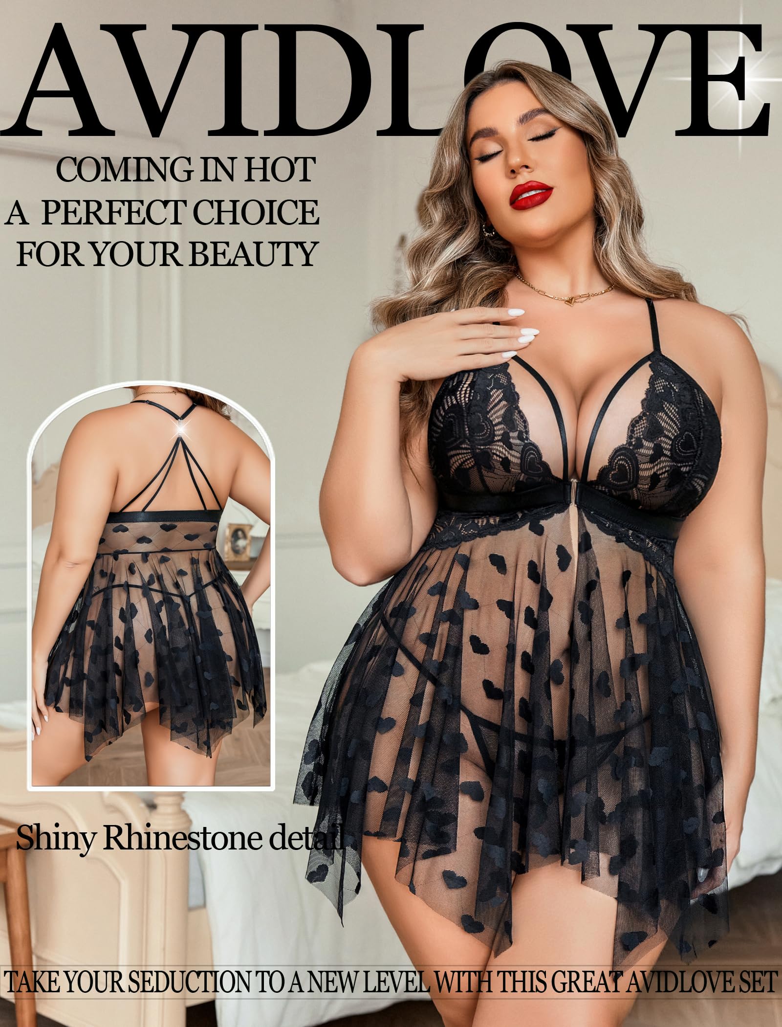 Design:Avidlove plus lace babydoll features deep v neck and Sheer Floral Lace Cups with heart print and front closure styling to show off your curve,The "METAL front hook closure" is easy to take on and off,helps create a beautiful bust line,adjustable shoulder straps and rhinestone details for shiny and charming, flowing asymmetrical hem lengthens the curve of the legs,make you more attractive and seductive