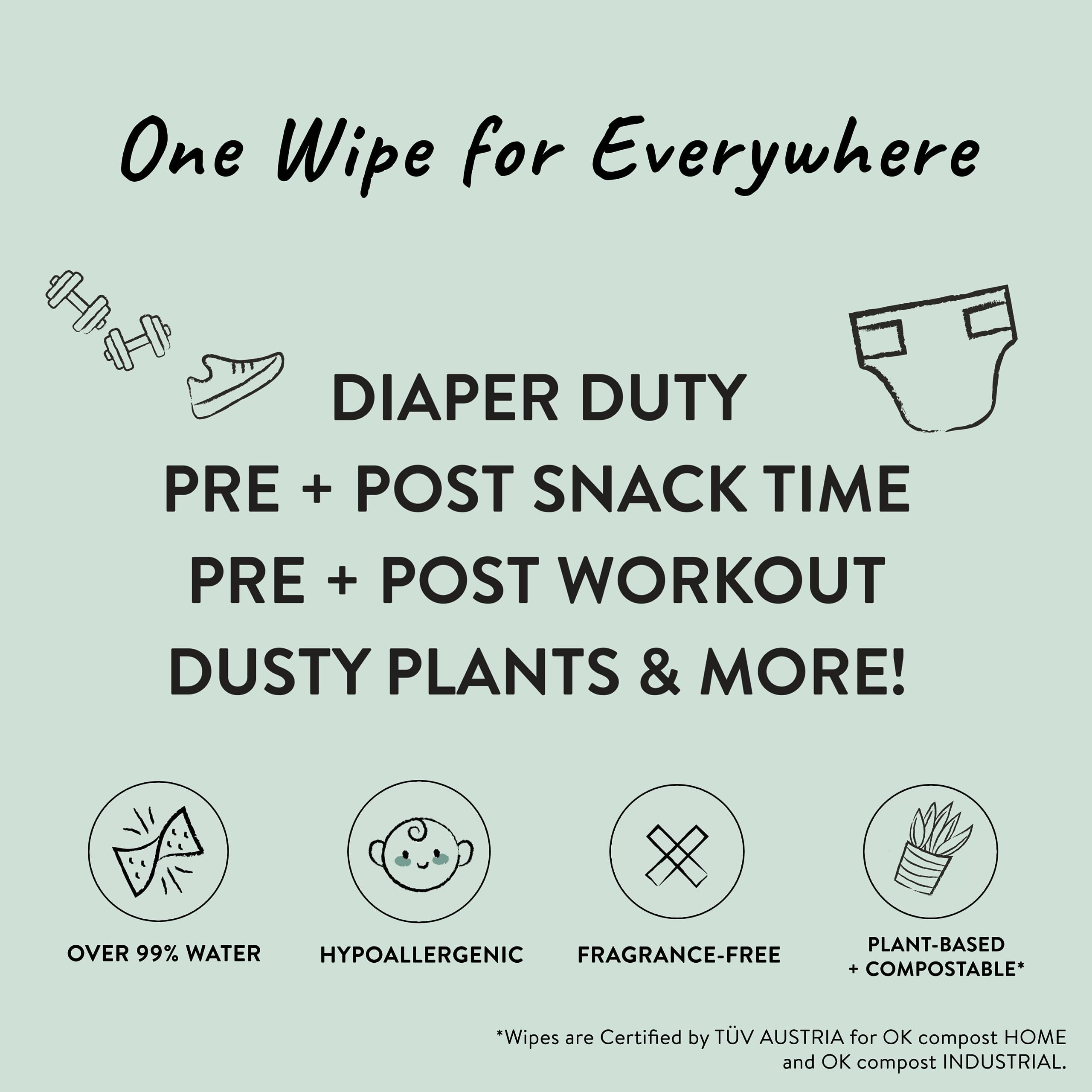 Clean up all of life’s messes. Compostable, plant-based multi-use Wipes are made with over 99% water and only 7 transparent ingredients, making them gentle and safe for baby’s sensitive skin but great for the whole family