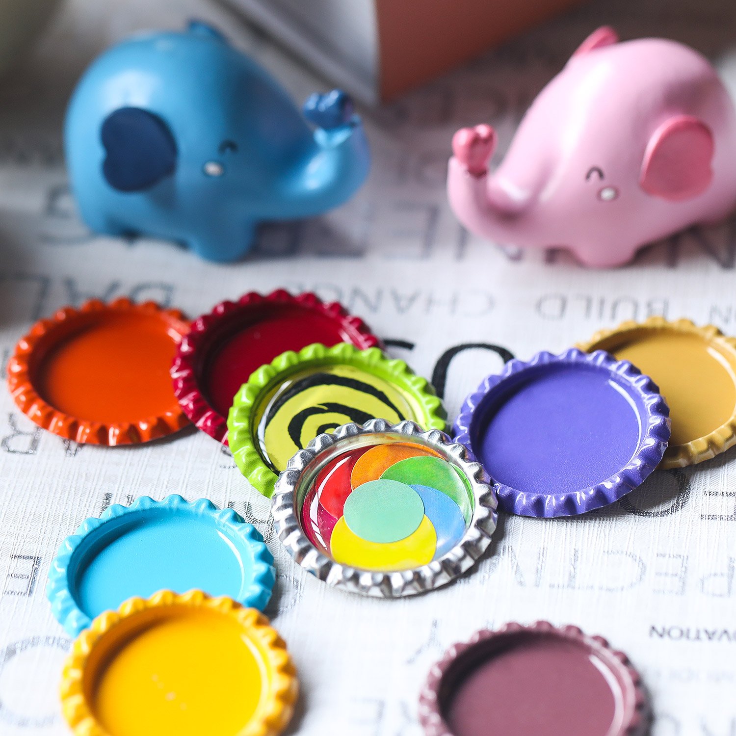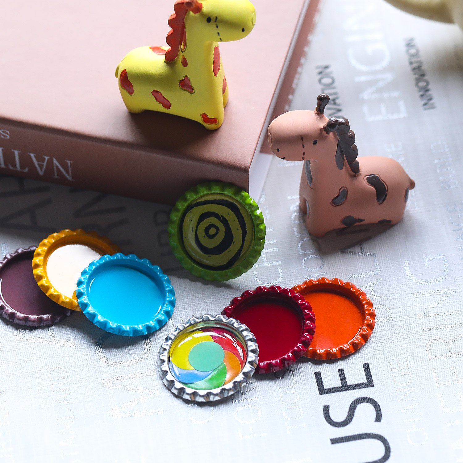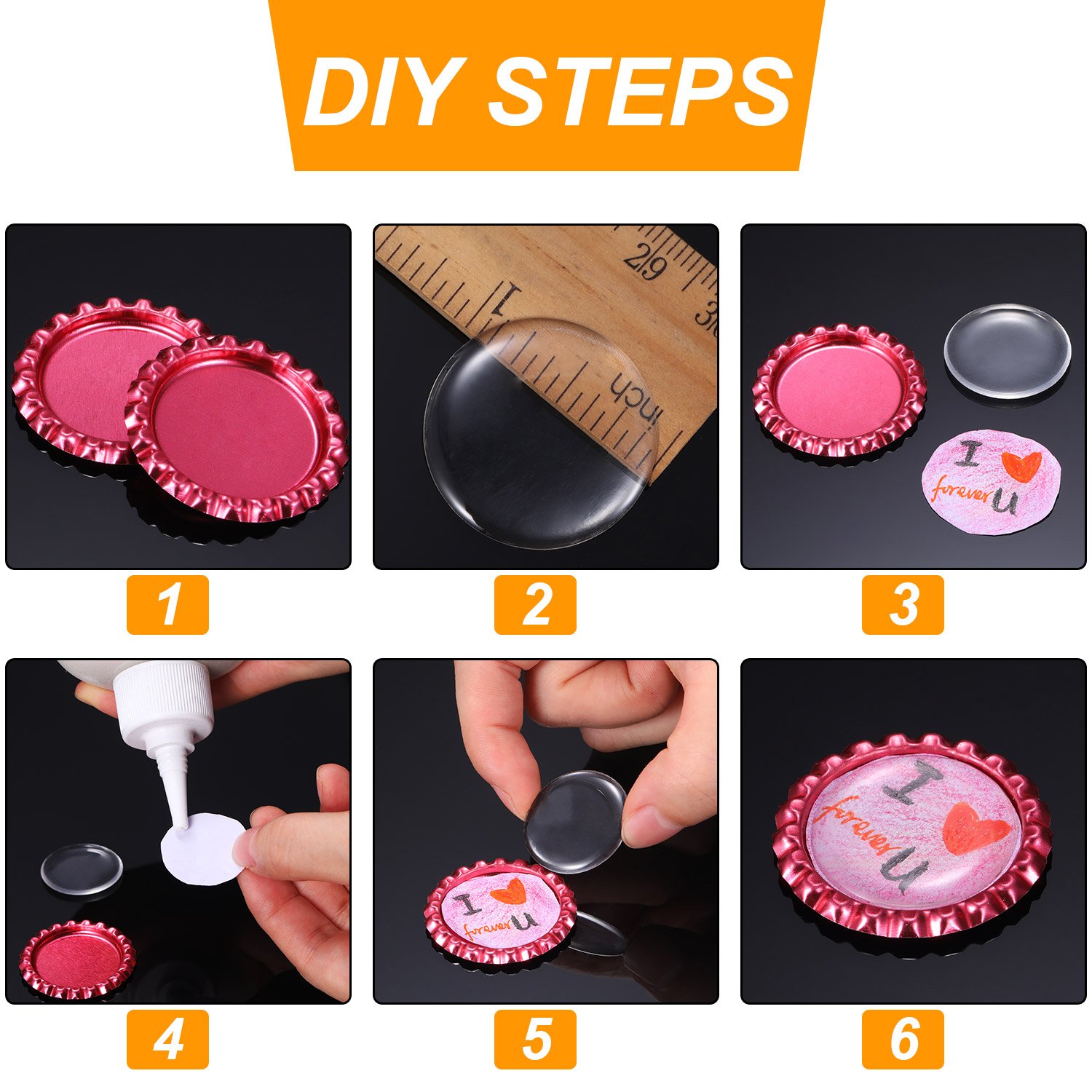 Easy to use: cut a image into a circle, apply glue directly to the cap or on the back of the image and position the image on the bottle cap, then simply apply the sticker over the image