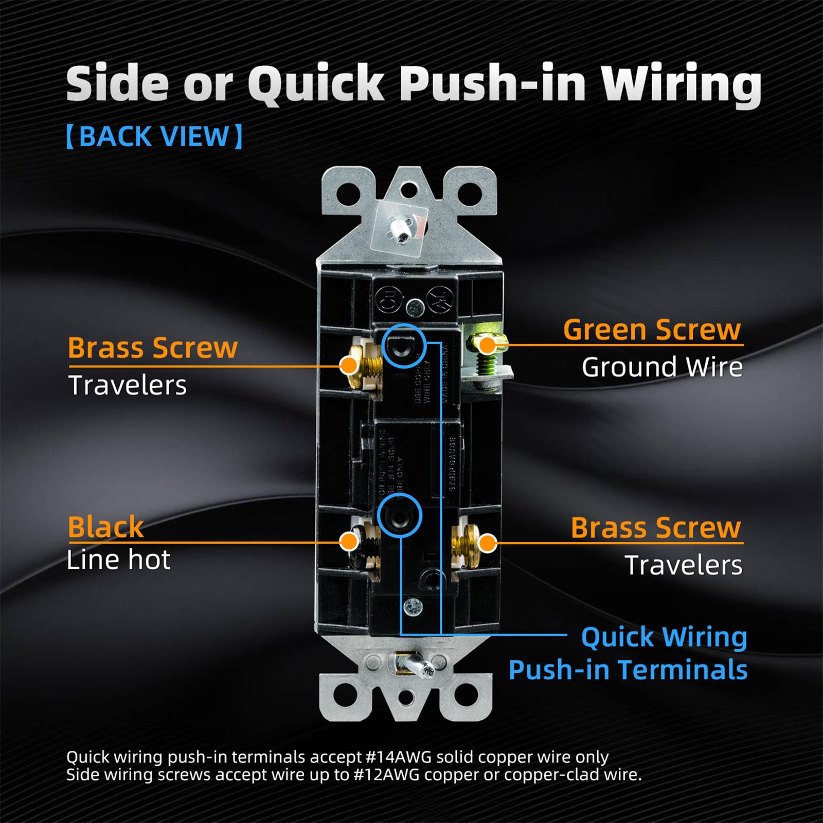 Easy Installation: Provide both quick push-in wiring and side wiring. Quick wiring push-in terminals accept #14AWG solid copper wire only. Side wiring terminal screws accept wire up to #12AWG copper or copper-clad wire. Break-off plaster ear for best flush alignment. Shallow body design fits standard junction boxes.
