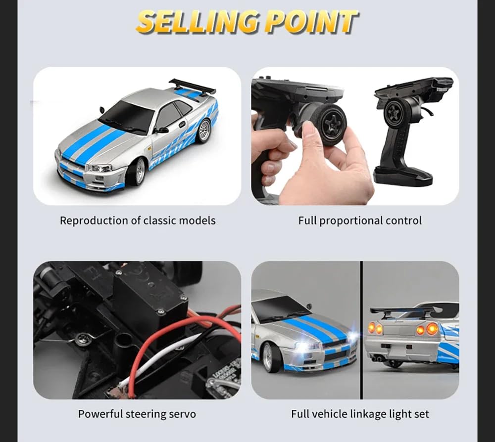 Simulated Road Tires and Drift Tires: Comes with both realistic road tires and specialized drift tires to suit different driving conditions and styles.Independent Suspension on All Four Wheels: Each wheel has its own independent suspension, ensuring smooth and controlled movement over various terrains.